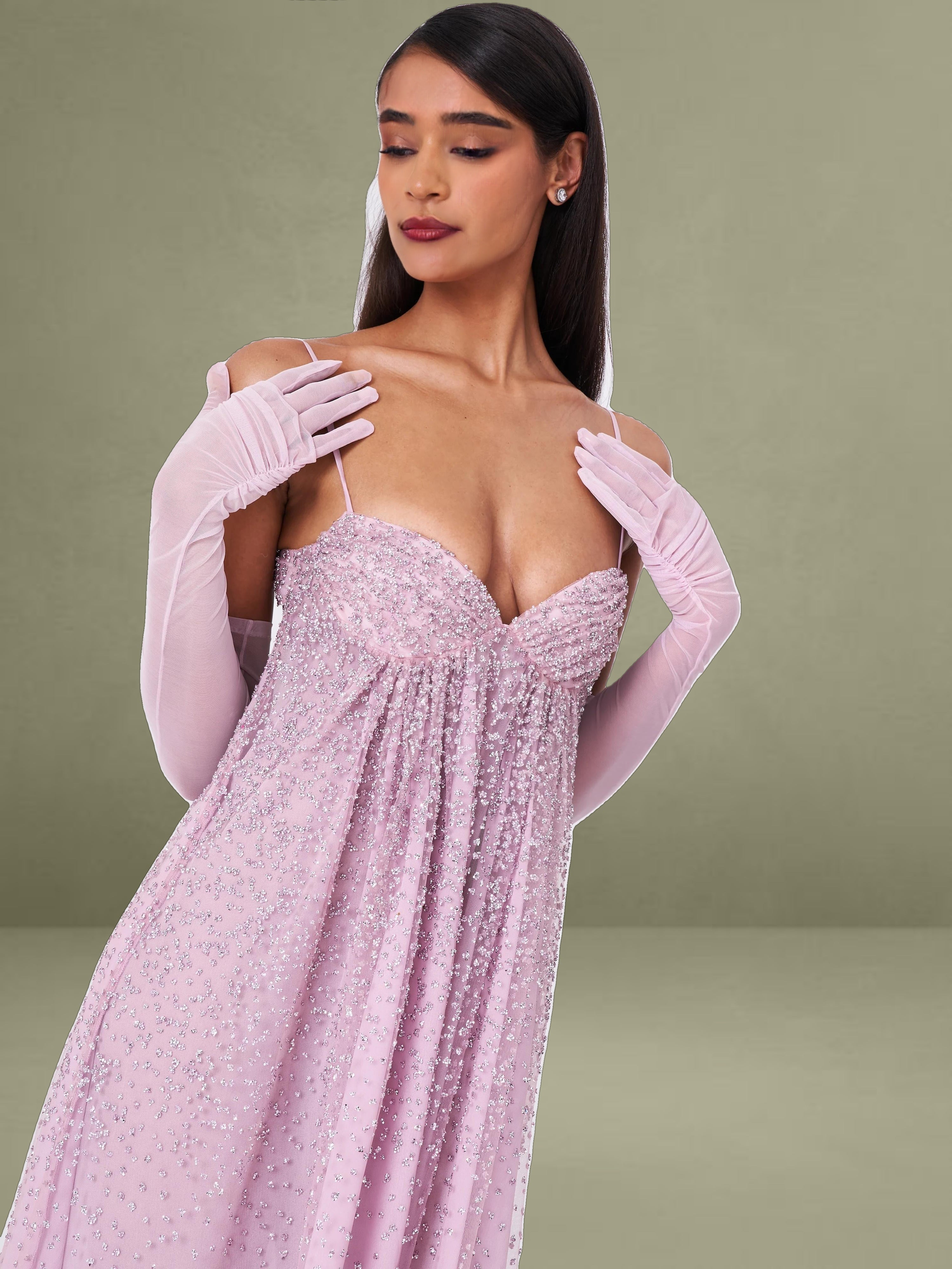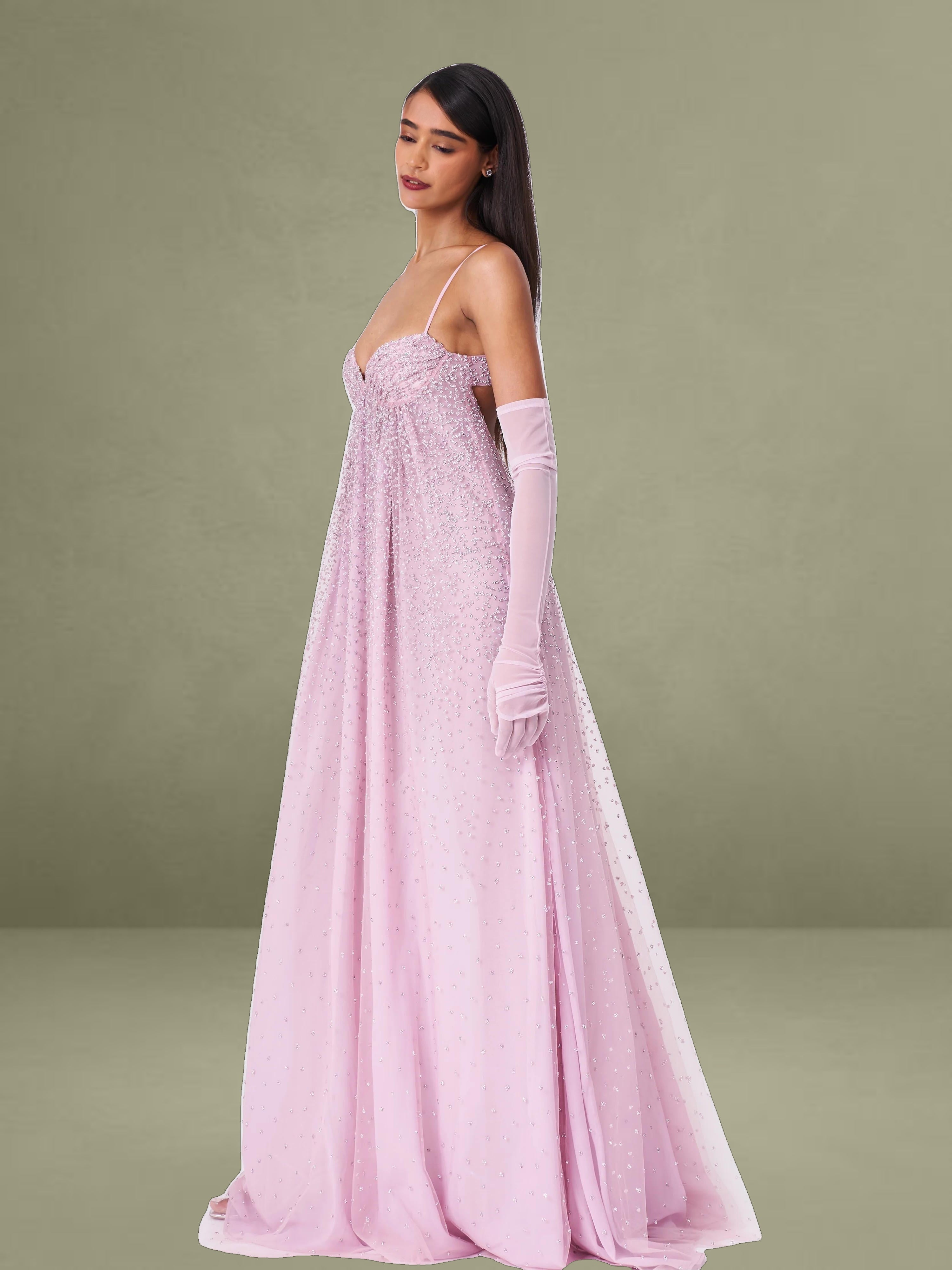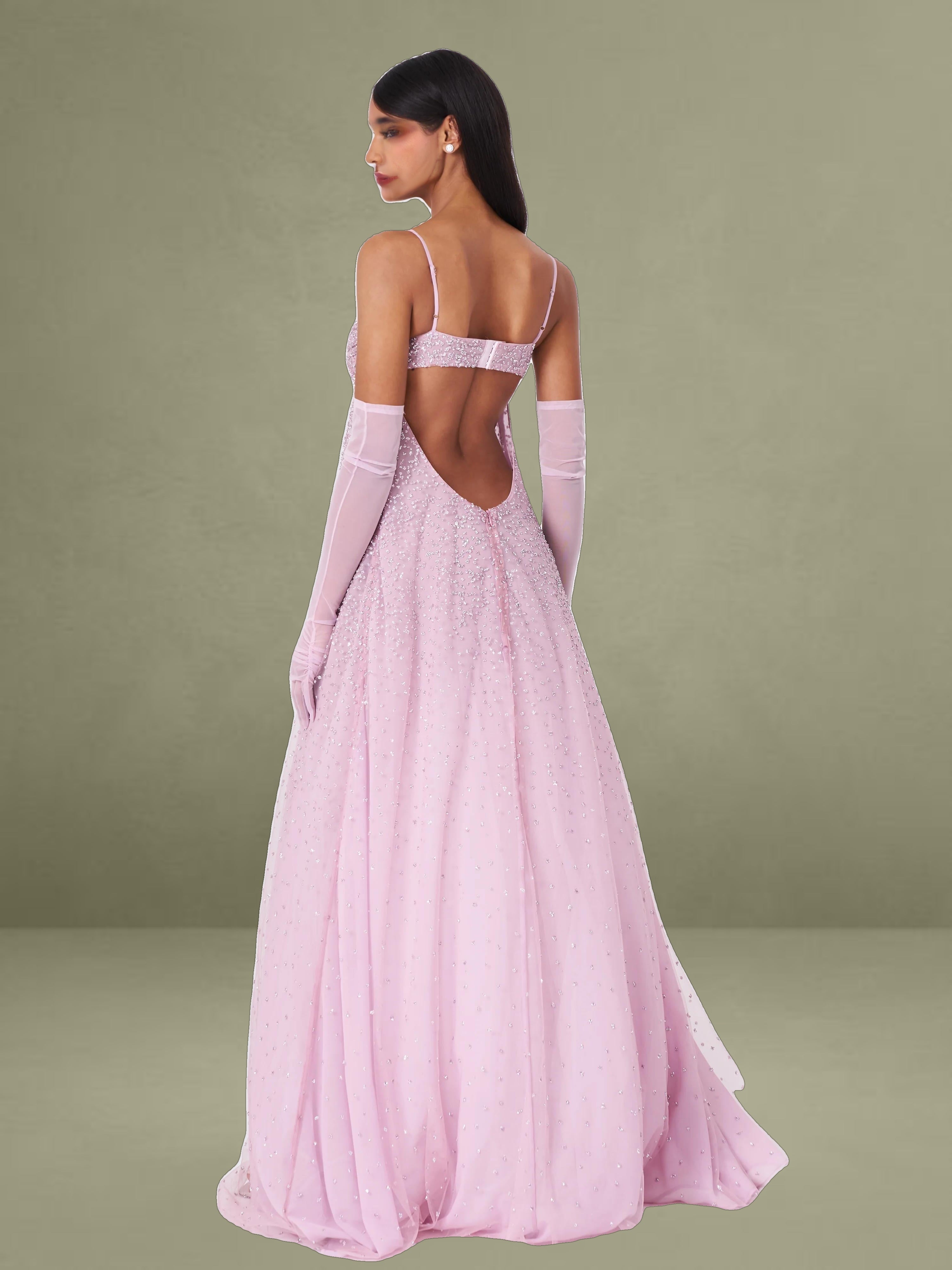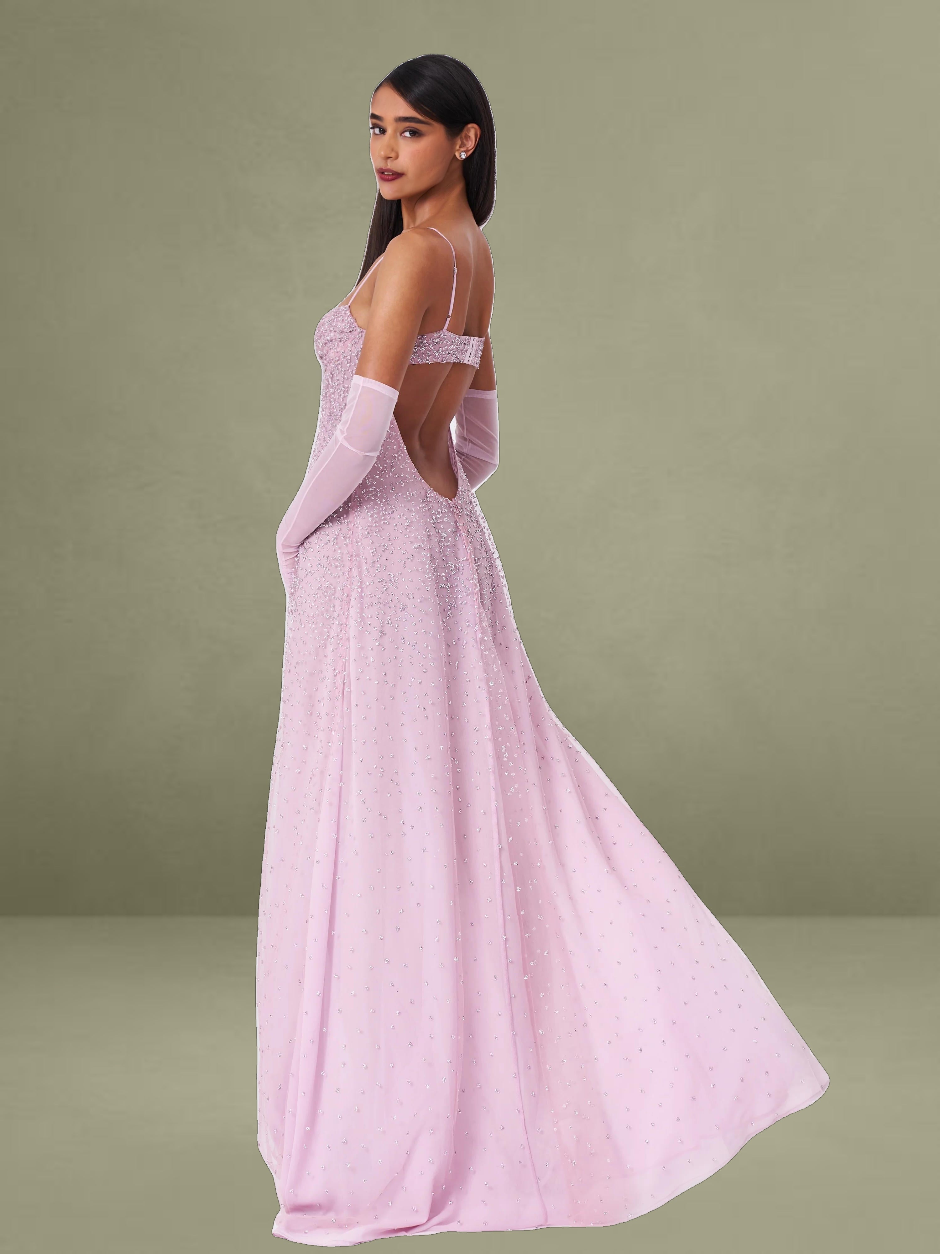 Step into elegance with the ethereal Wallie Gown, crafted from exquisite pink rhinestone mesh fabric for a dazzling, luminous effect. This sleeveless design showcases a backless silhouette with an adjustable strap and back tie for a custom fit. The padded, ruched cups provide added support and style, while the gown’s draping and flowing skirt creates a dreamy, graceful movement with every step. Fully lined for ultimate comfort, the Wallie Gown is your perfect choice for making a radiant entrance at any glamorous occasion. Perfect matches with our Wallis Mesh Opera-length Gloves.