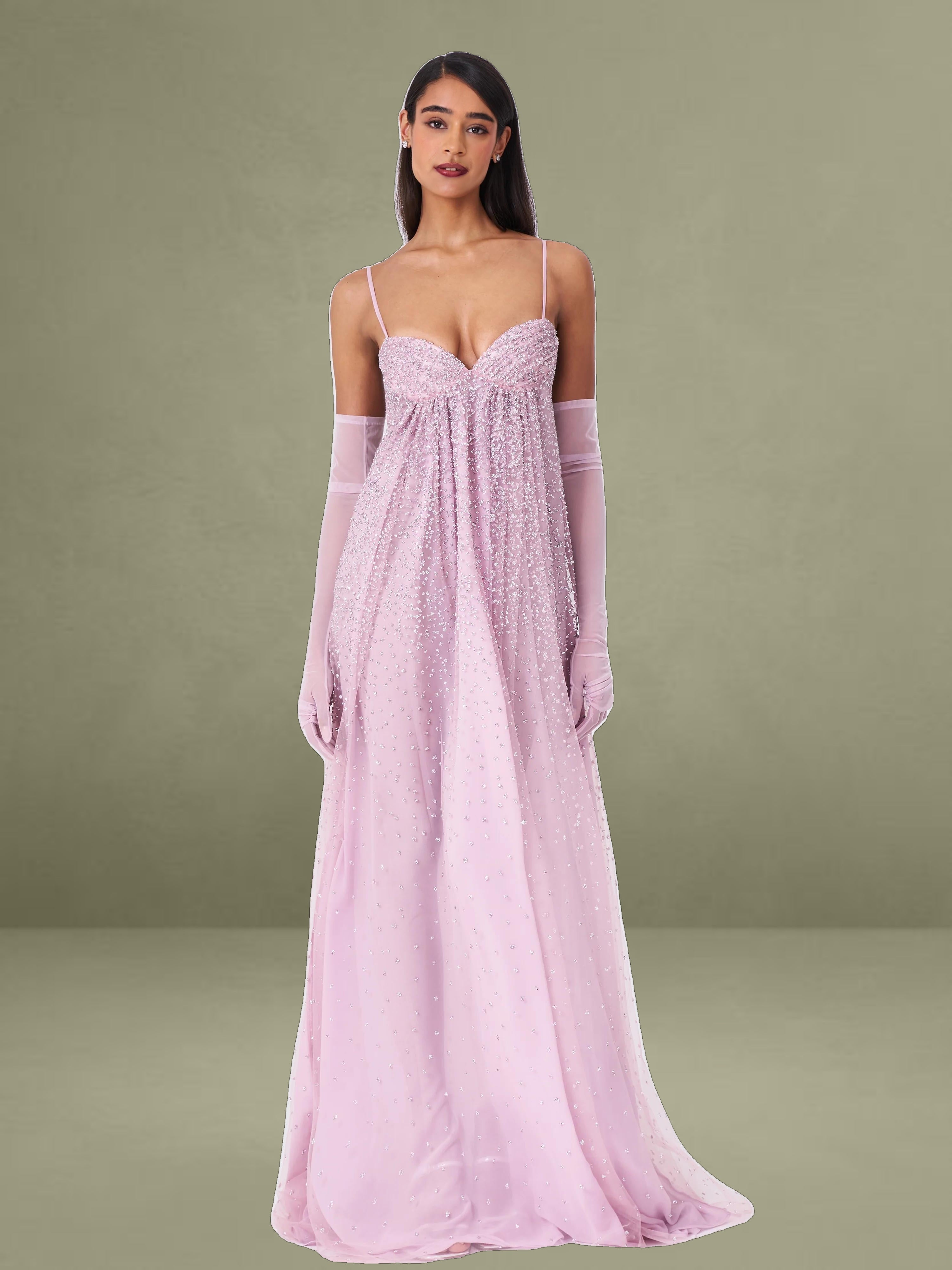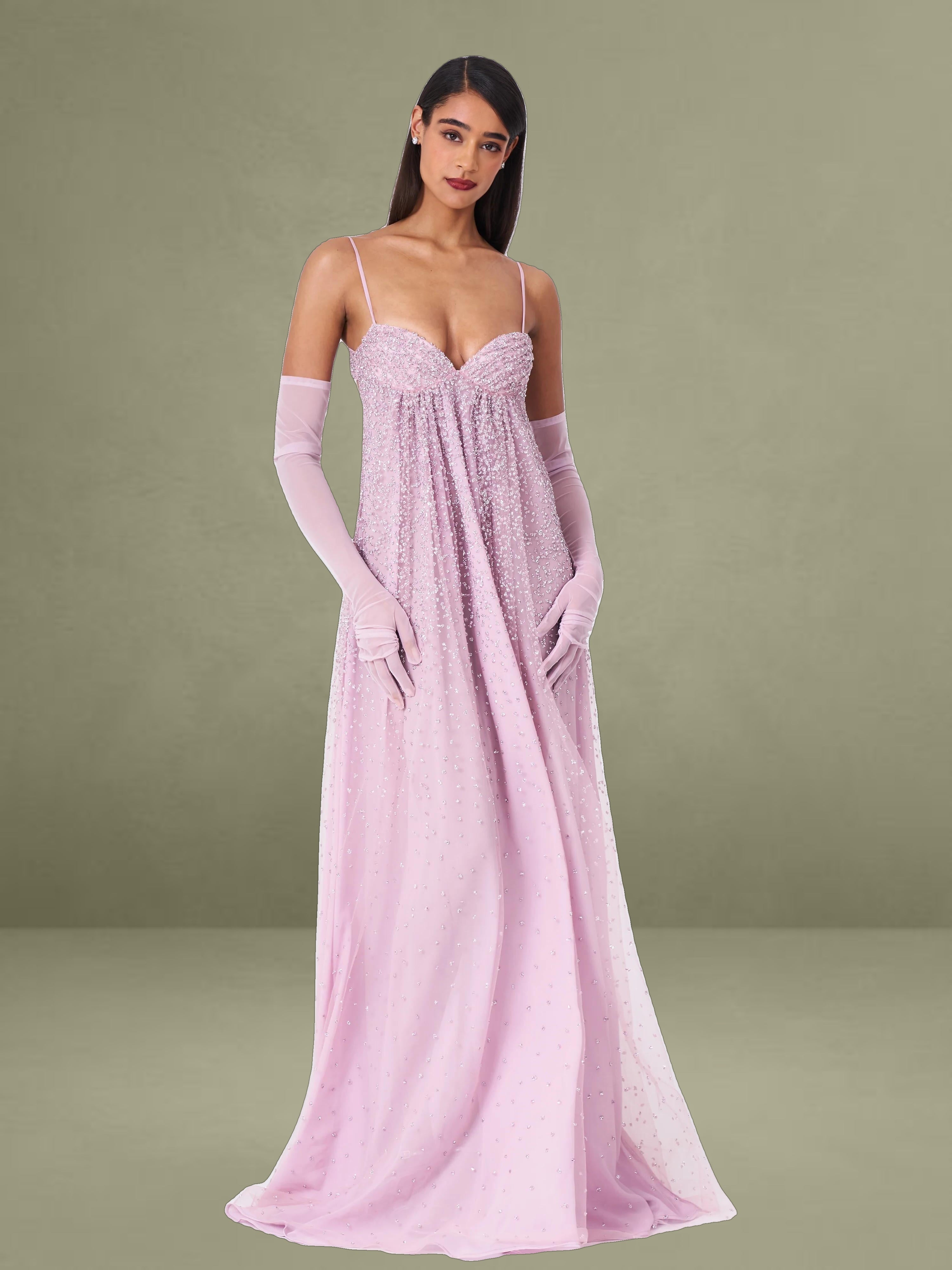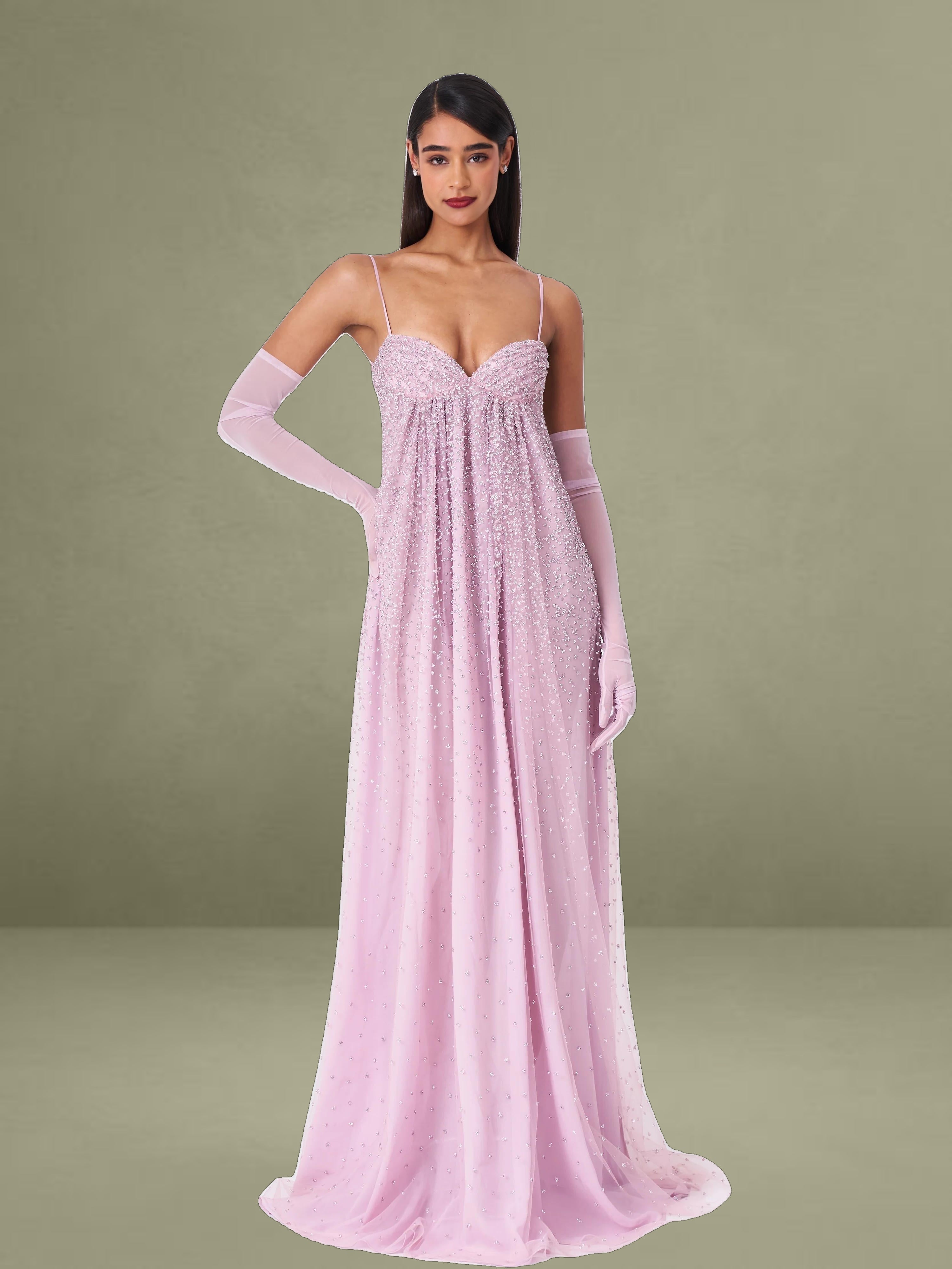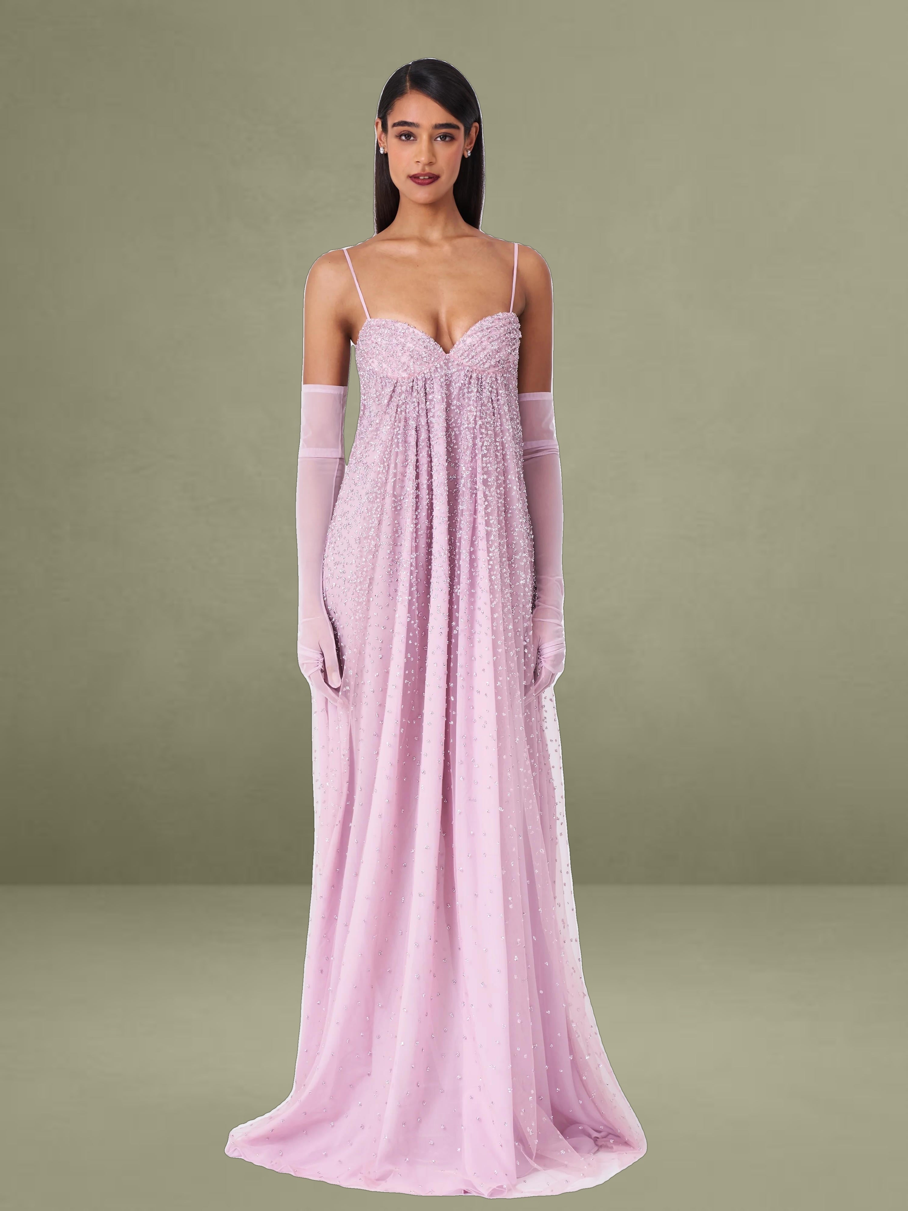 Step into elegance with the ethereal Wallie Gown, crafted from exquisite pink rhinestone mesh fabric for a dazzling, luminous effect. This sleeveless design showcases a backless silhouette with an adjustable strap and back tie for a custom fit. The padded, ruched cups provide added support and style, while the gown’s draping and flowing skirt creates a dreamy, graceful movement with every step. Fully lined for ultimate comfort, the Wallie Gown is your perfect choice for making a radiant entrance at any glamorous occasion. Perfect matches with our Wallis Mesh Opera-length Gloves.