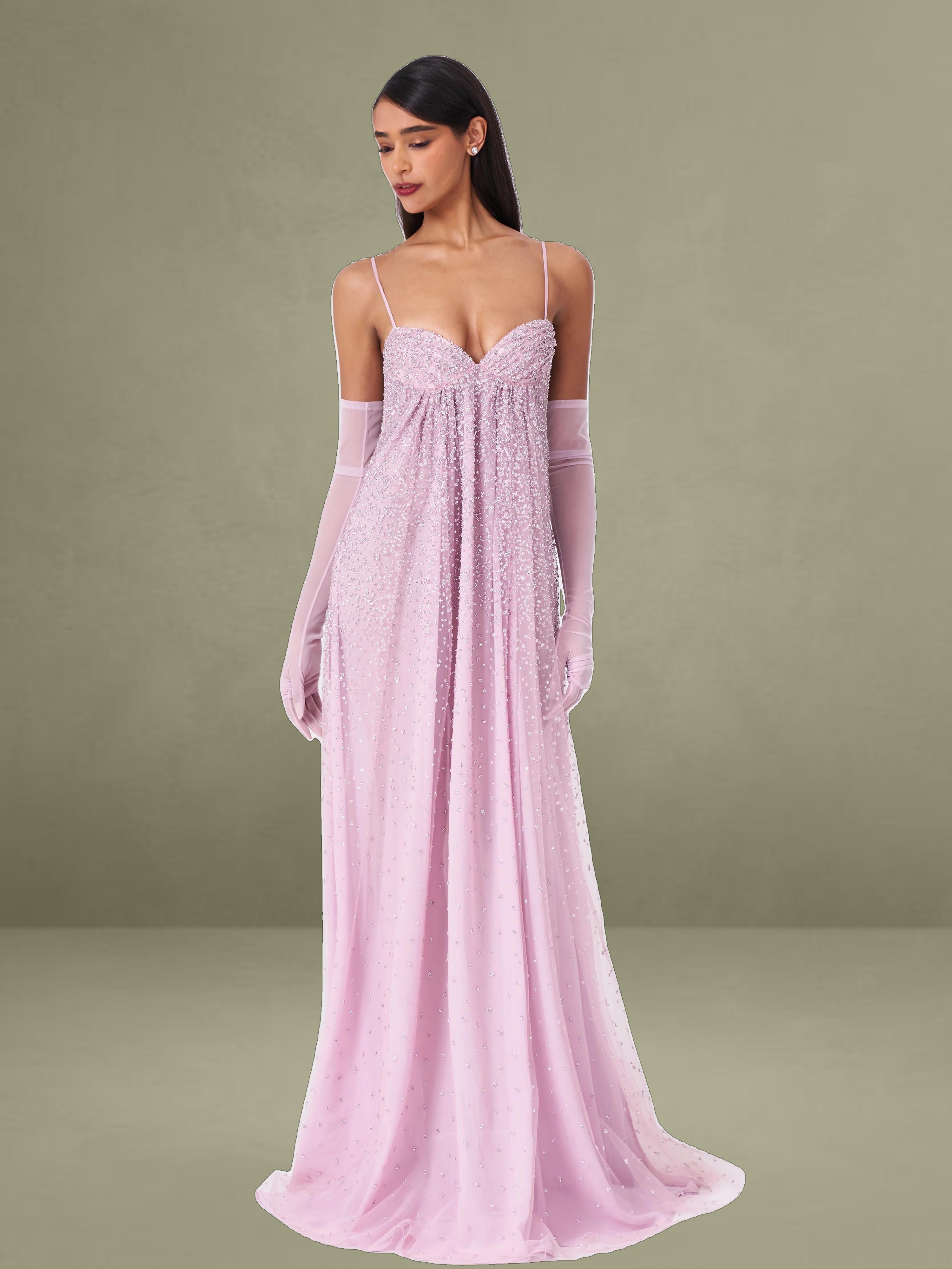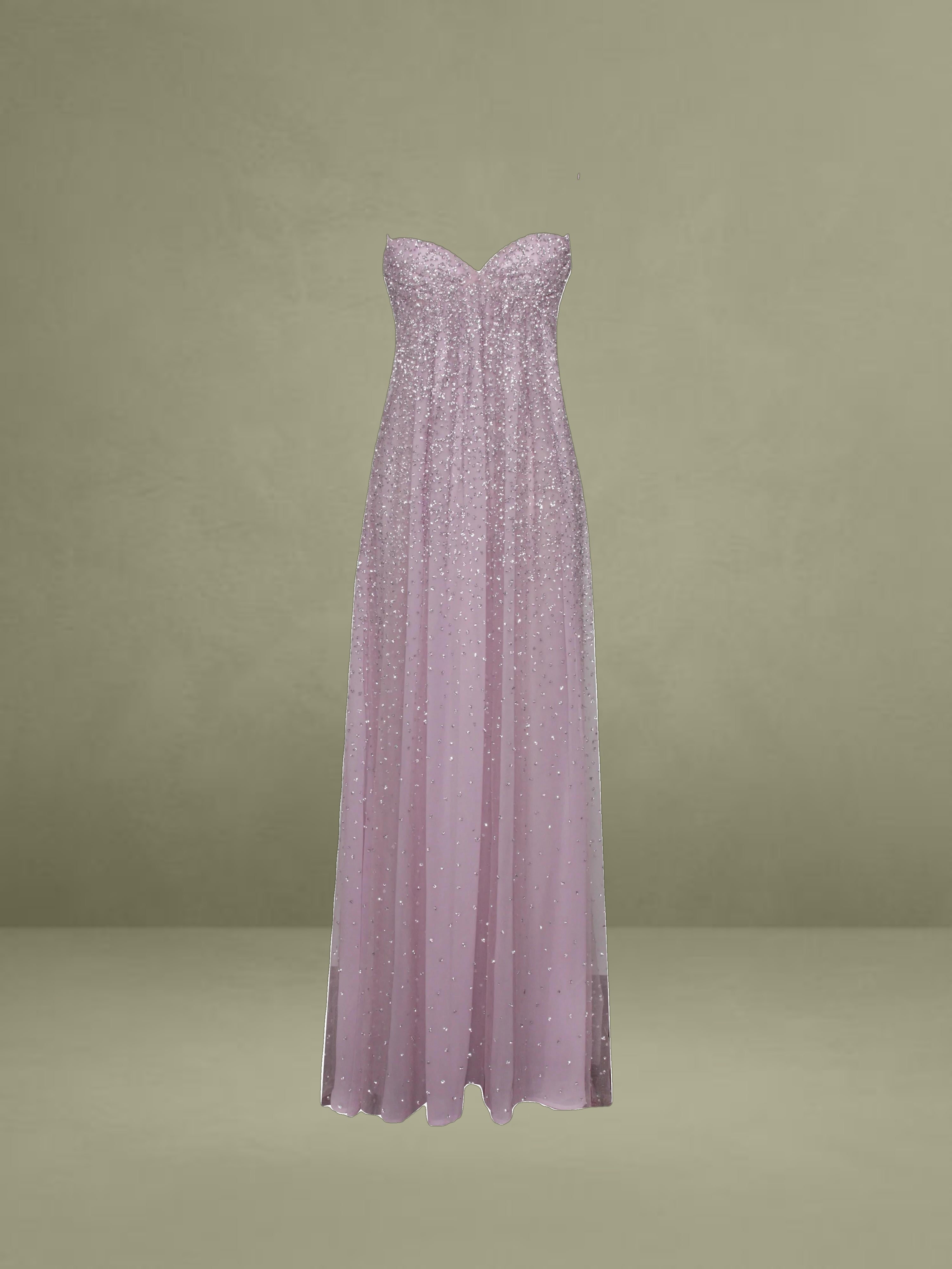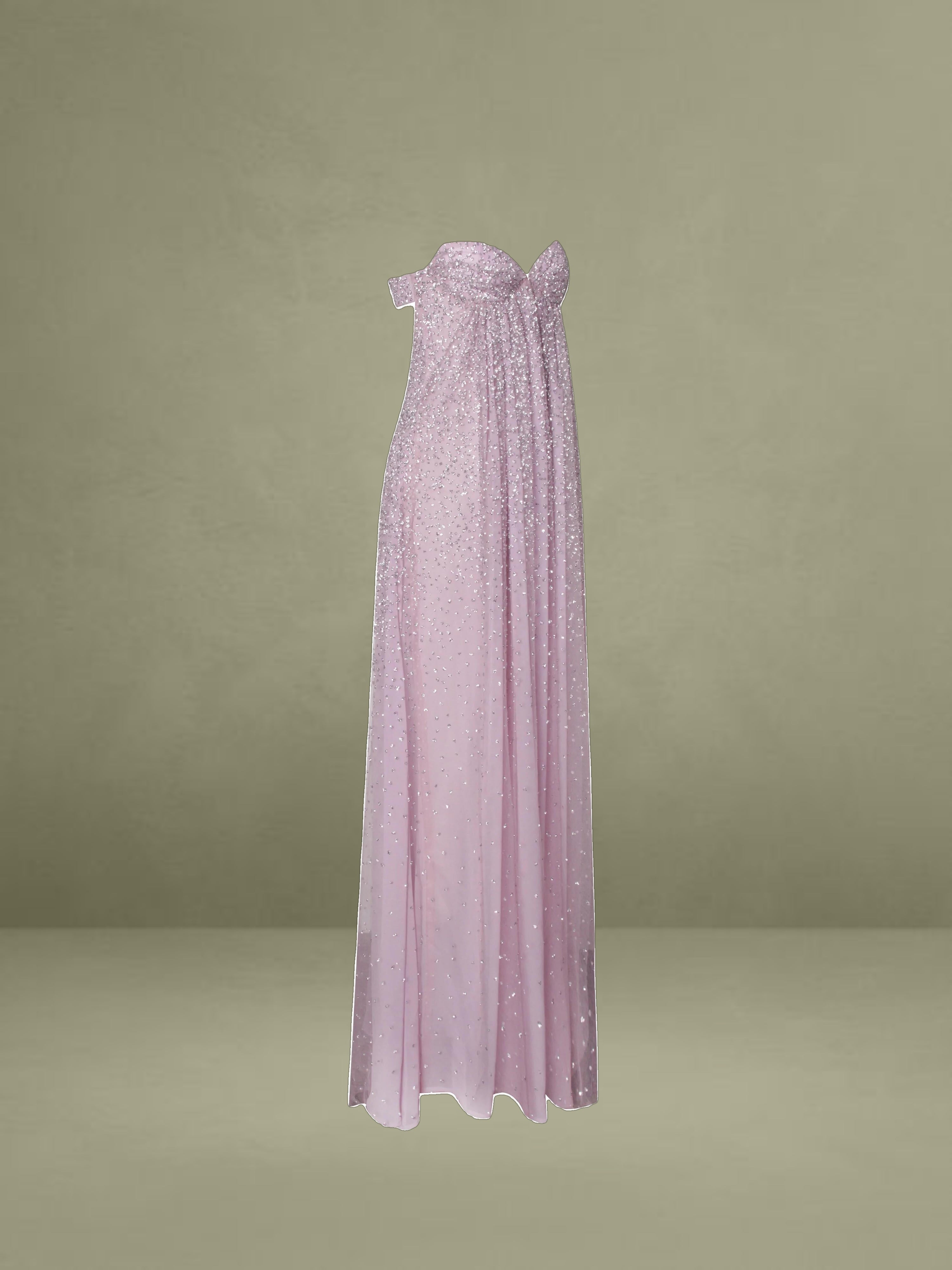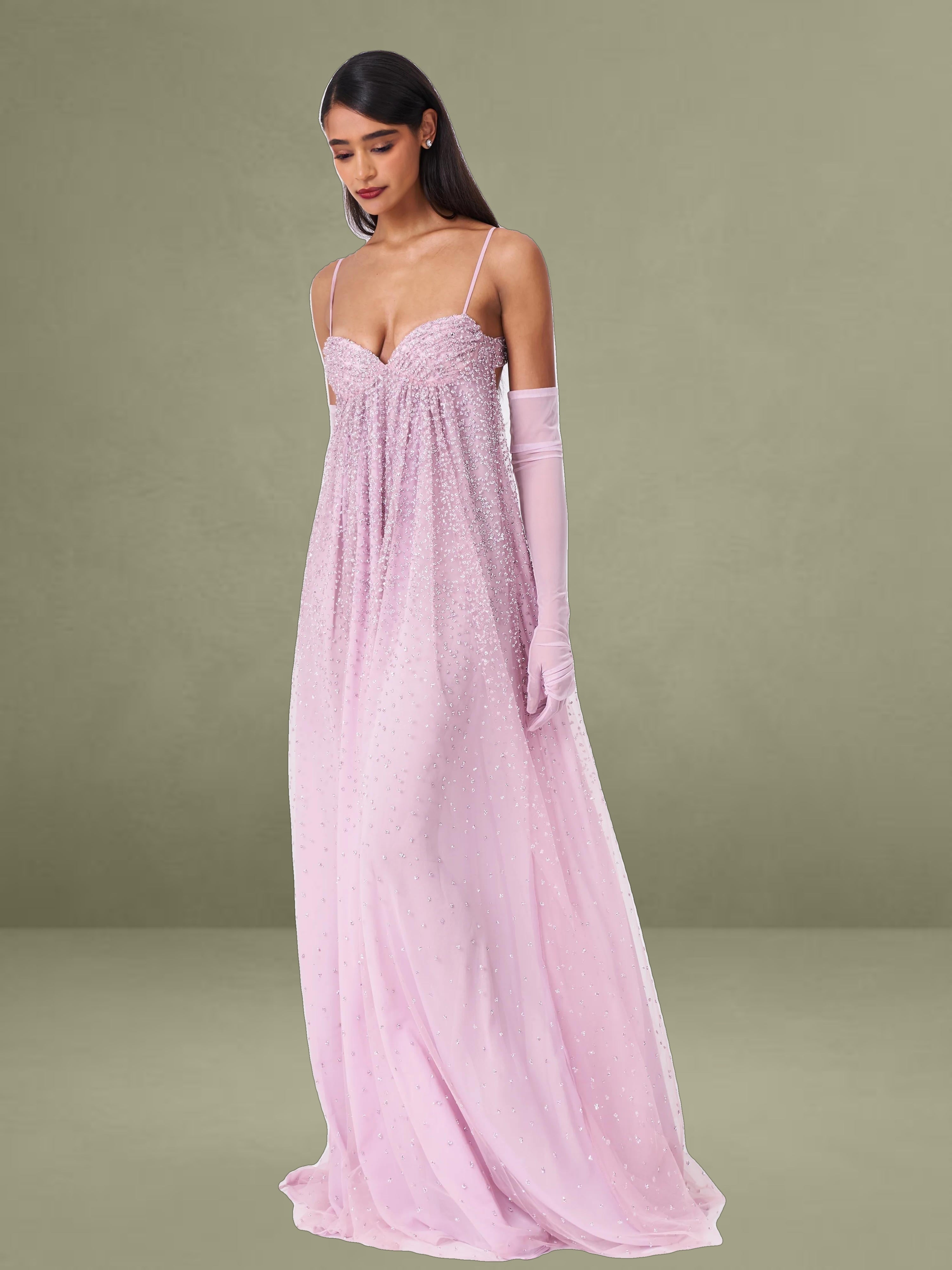 Step into elegance with the ethereal Wallie Gown, crafted from exquisite pink rhinestone mesh fabric for a dazzling, luminous effect. This sleeveless design showcases a backless silhouette with an adjustable strap and back tie for a custom fit. The padded, ruched cups provide added support and style, while the gown’s draping and flowing skirt creates a dreamy, graceful movement with every step. Fully lined for ultimate comfort, the Wallie Gown is your perfect choice for making a radiant entrance at any glamorous occasion. Perfect matches with our Wallis Mesh Opera-length Gloves.
