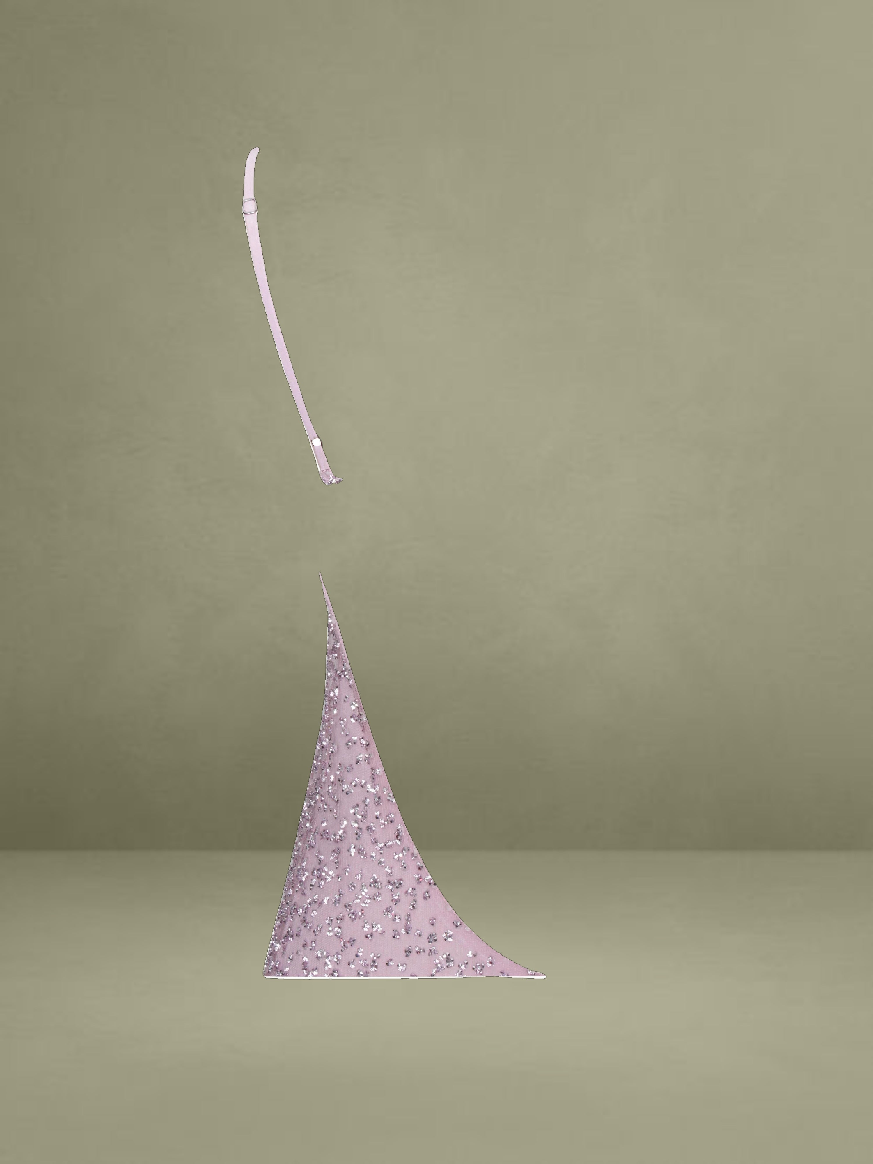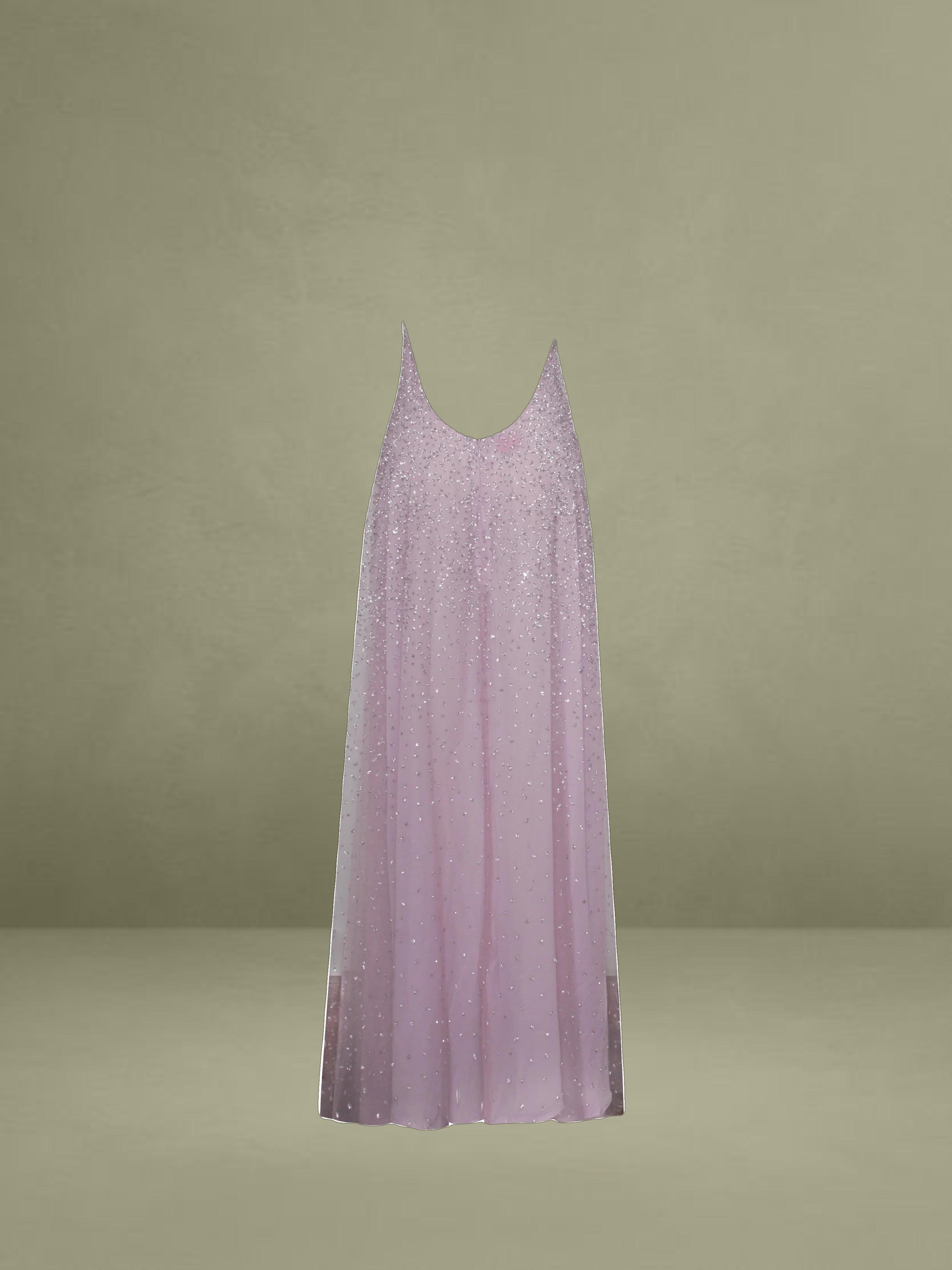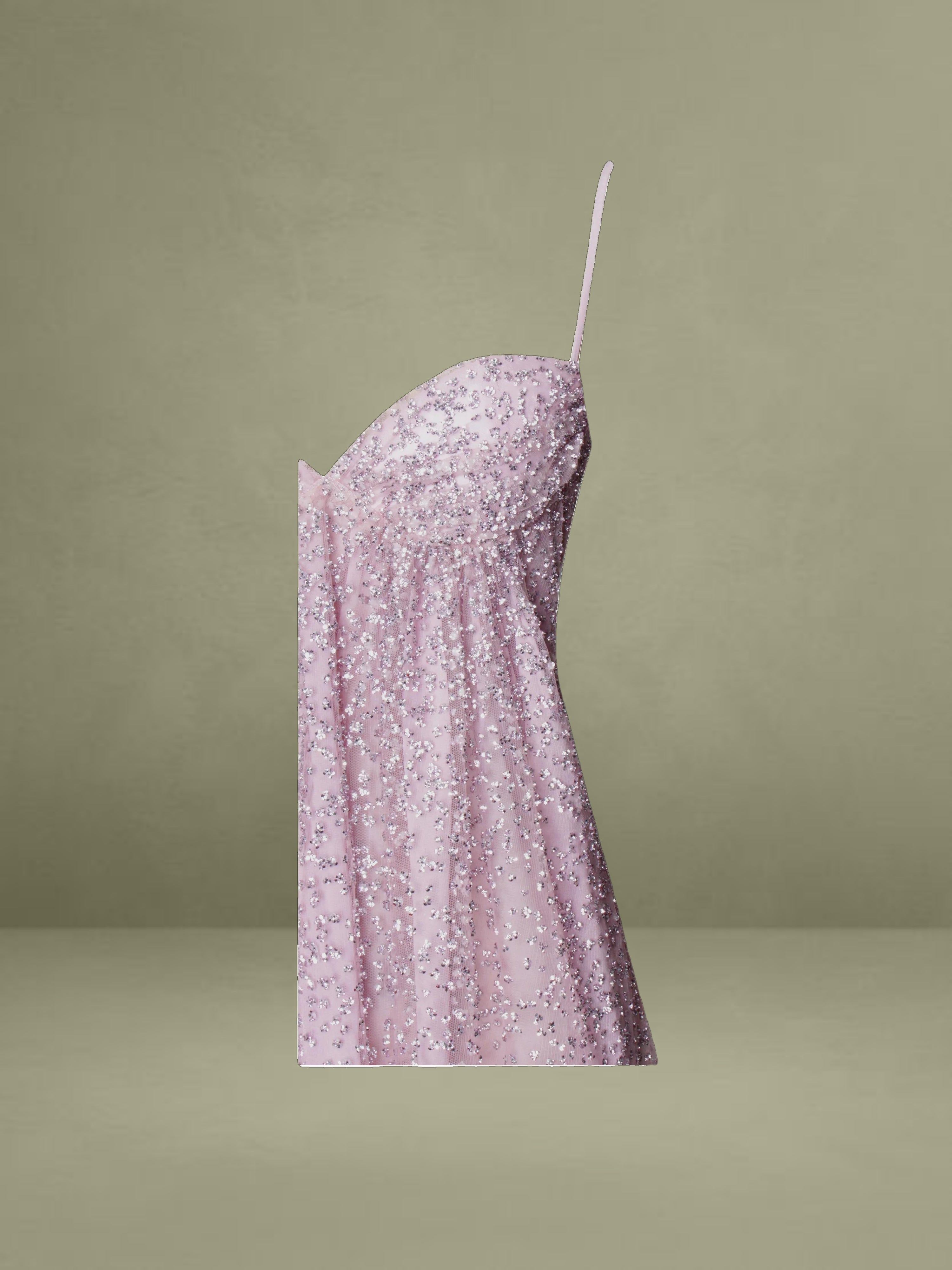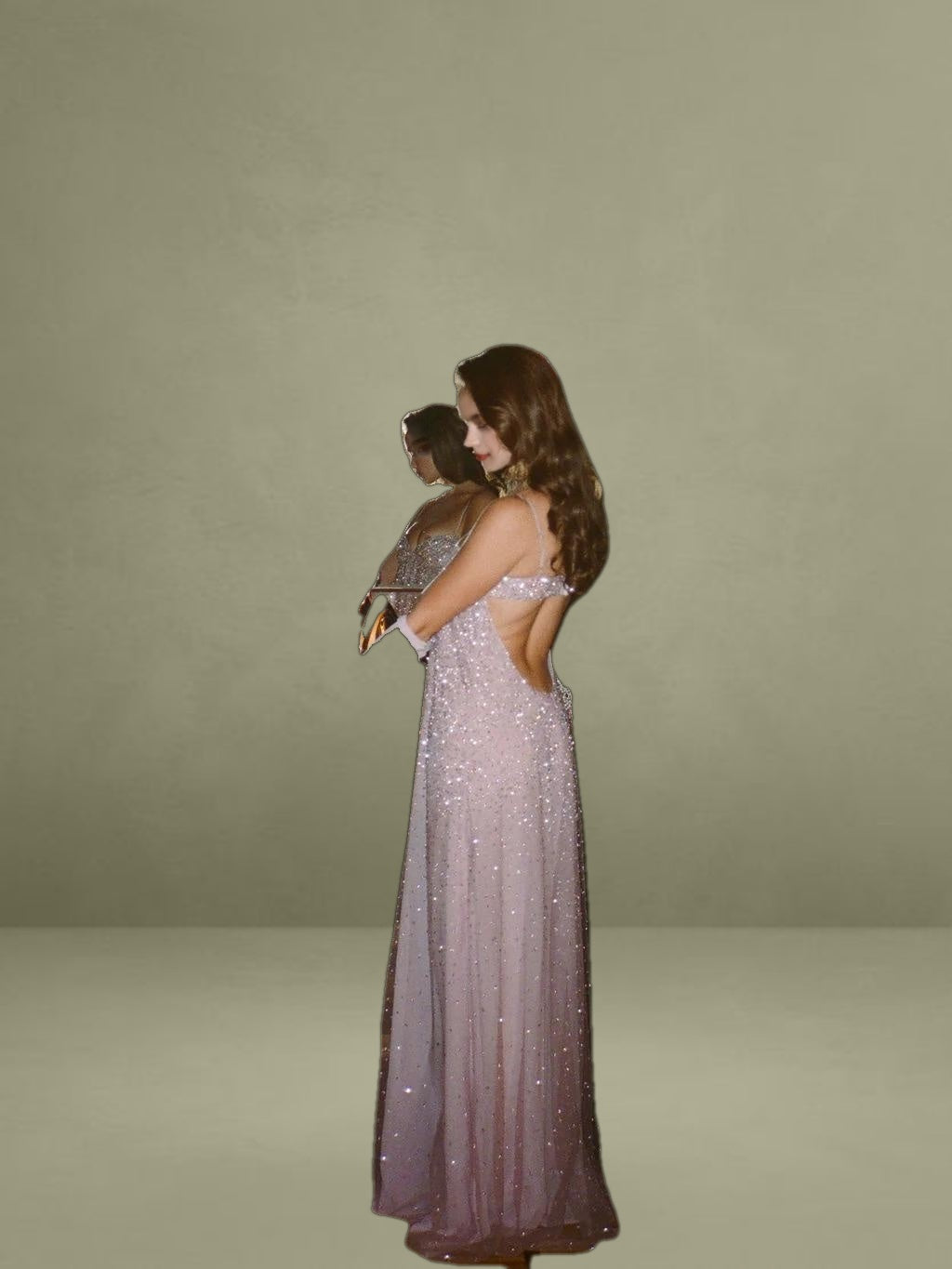 Step into elegance with the ethereal Wallie Gown, crafted from exquisite pink rhinestone mesh fabric for a dazzling, luminous effect. This sleeveless design showcases a backless silhouette with an adjustable strap and back tie for a custom fit. The padded, ruched cups provide added support and style, while the gown’s draping and flowing skirt creates a dreamy, graceful movement with every step. Fully lined for ultimate comfort, the Wallie Gown is your perfect choice for making a radiant entrance at any glamorous occasion. Perfect matches with our Wallis Mesh Opera-length Gloves.