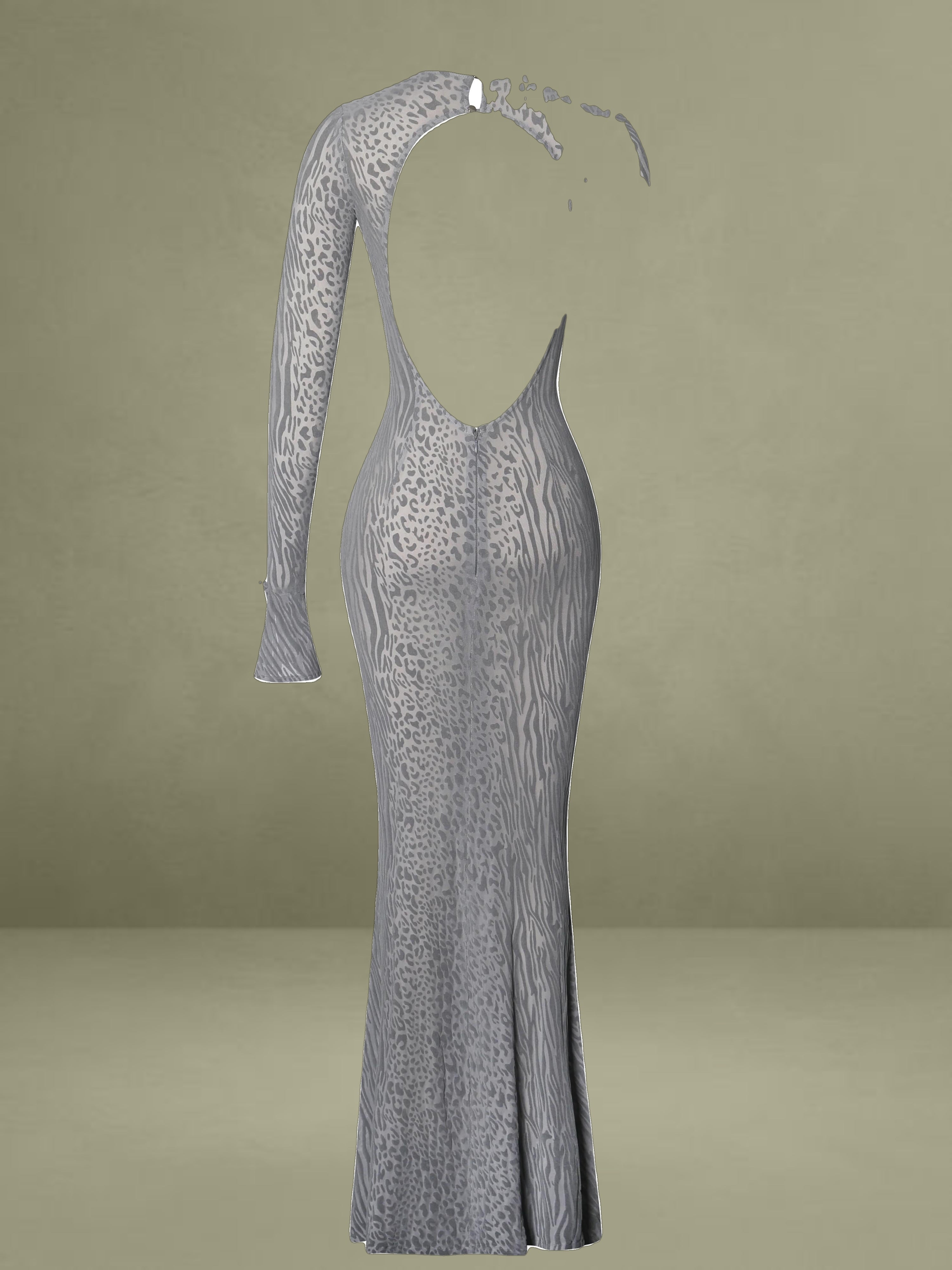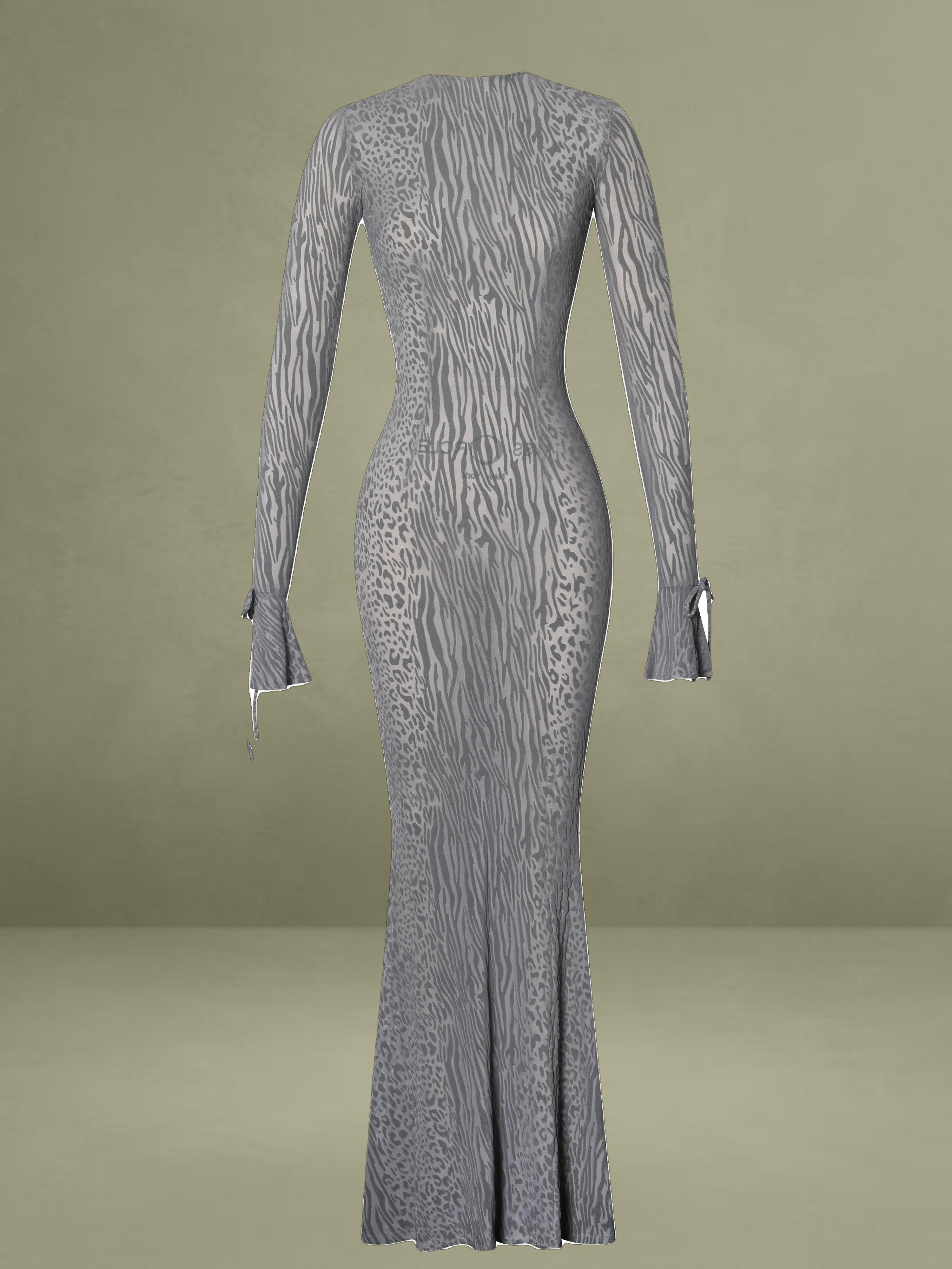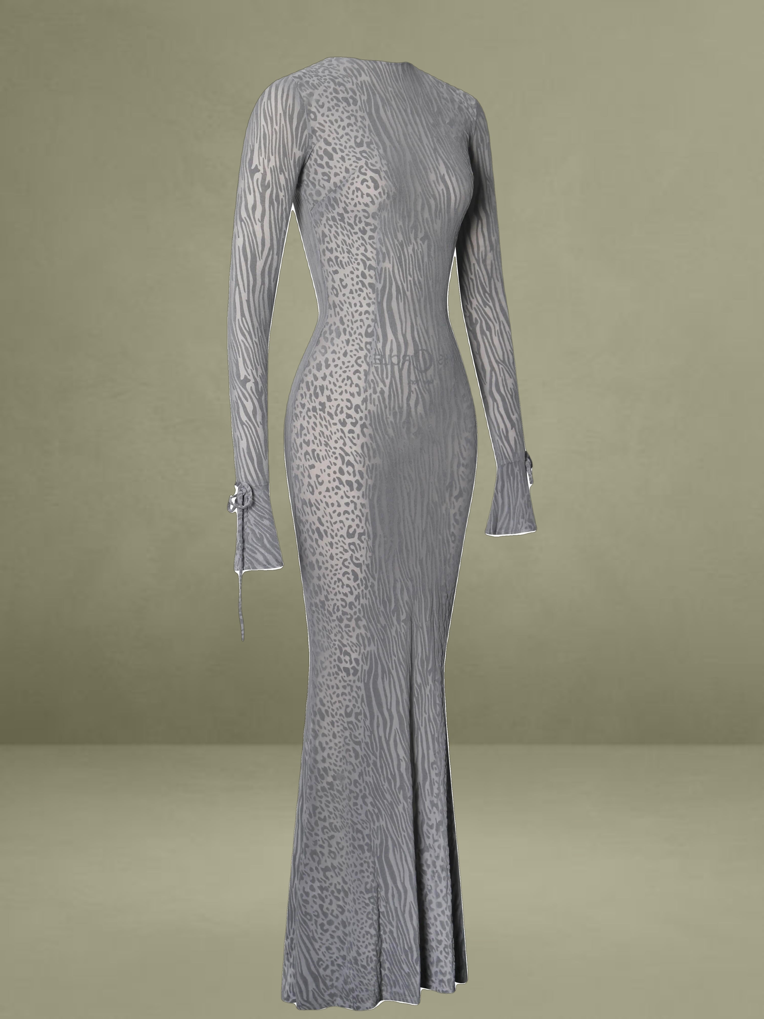 Introducing our latest, Waylynn, a show-stopping sheer animal print velvet burnout cheetah print maxi dress. This iconic long sleeve dress boasts a sexy open back with silver shank button closures at the back neck. The sleeves feature a stylish flare and ribbon tie detail. This design also features a flattering mermaid silhouette that hugs your shape in all the right places. Crafted from high-stretch velvet burnout mesh, its unlined and semi-sheer look exudes sensuality. The invisible zipper at the back enhances its seamless finish. Perfect for birthdays, nights out, vacations, and any special occasion. Elevate your style and captivate the crowd with Waylynn. This dress is also available in Burgundy, Black and Nuve base Black velvet.