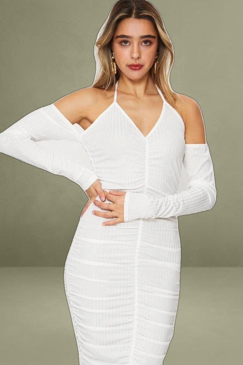 Features: Halter Neck, Ruched Detail, Long Sleeves, Ribbed Fabric