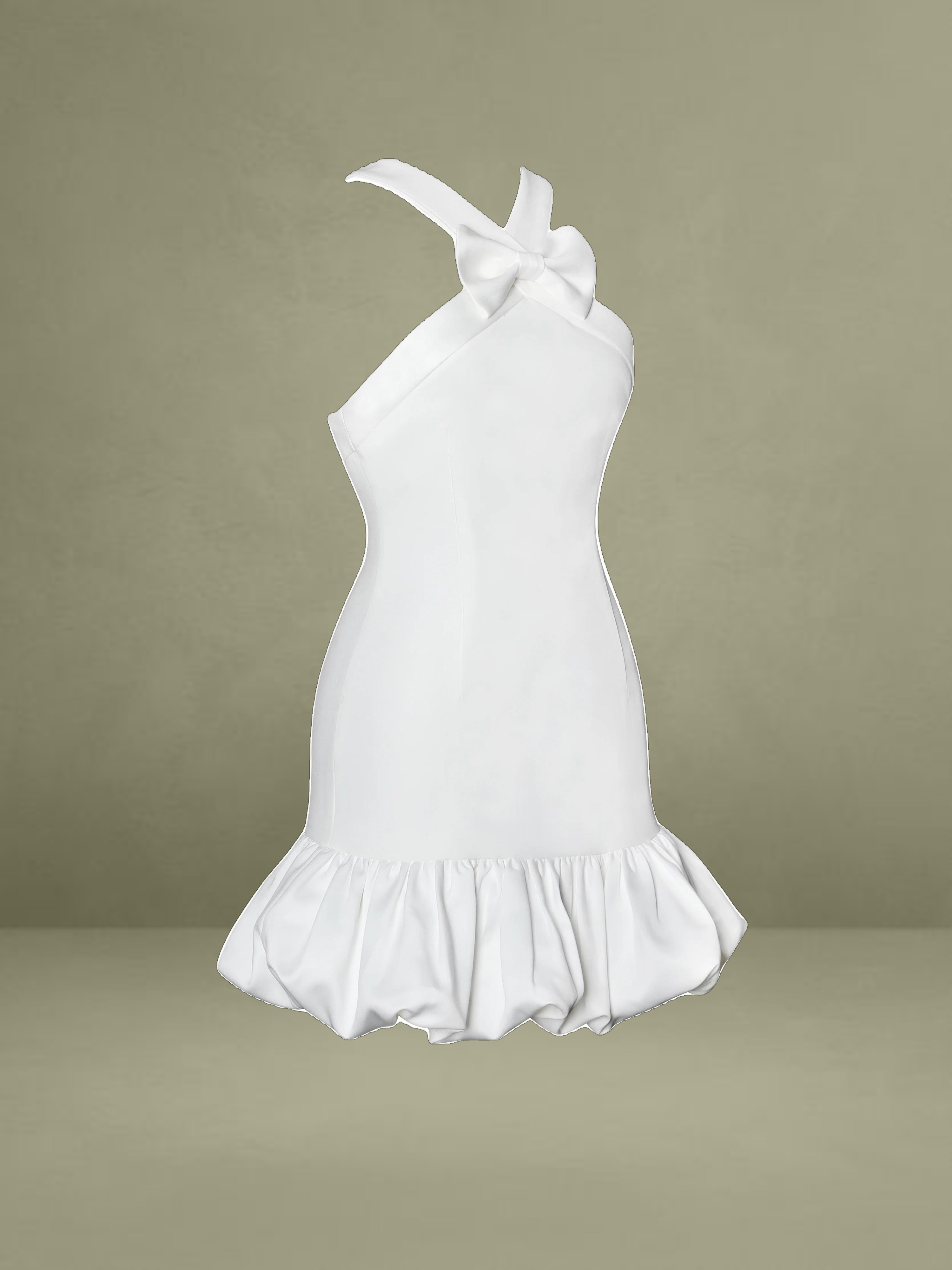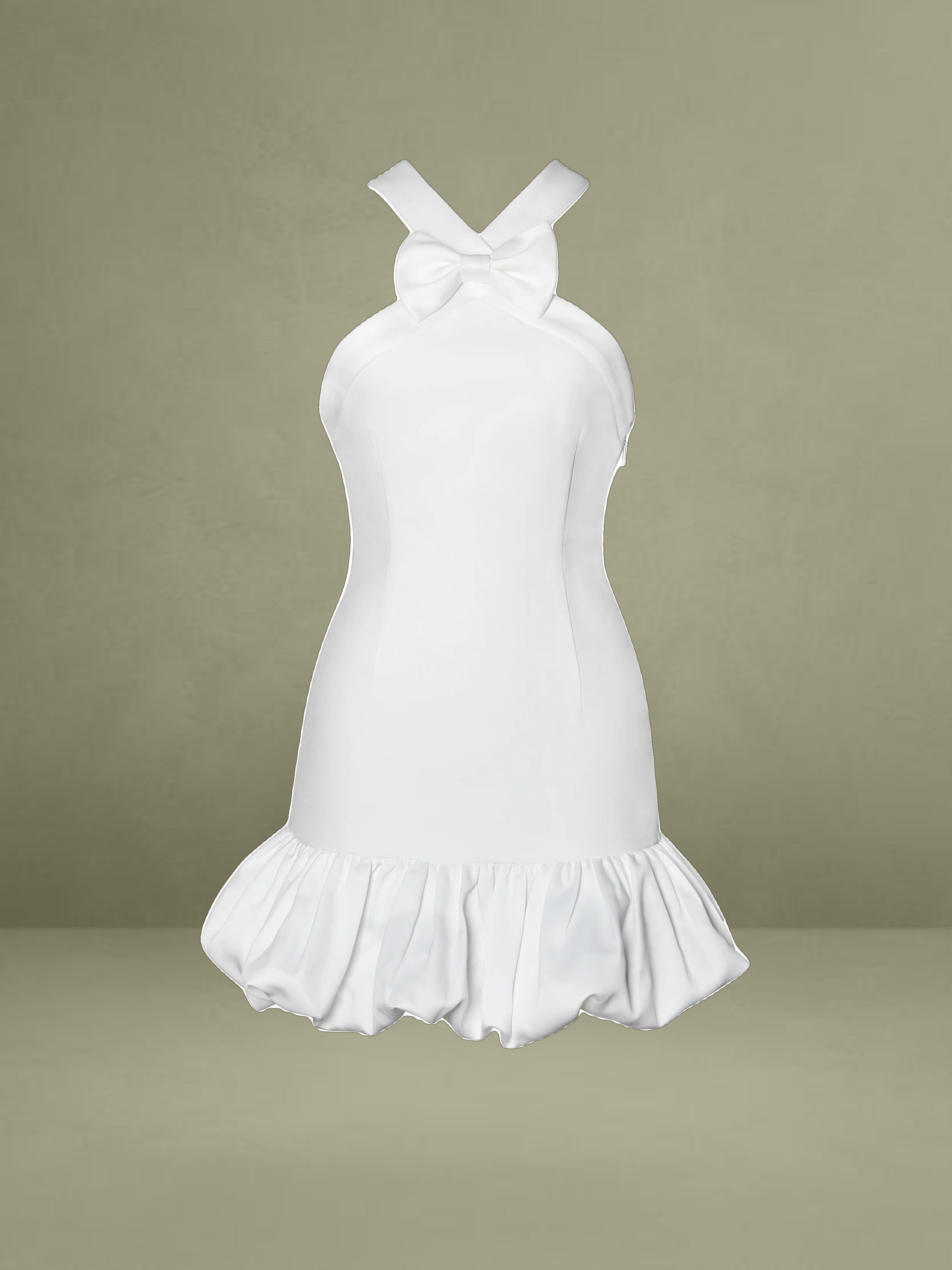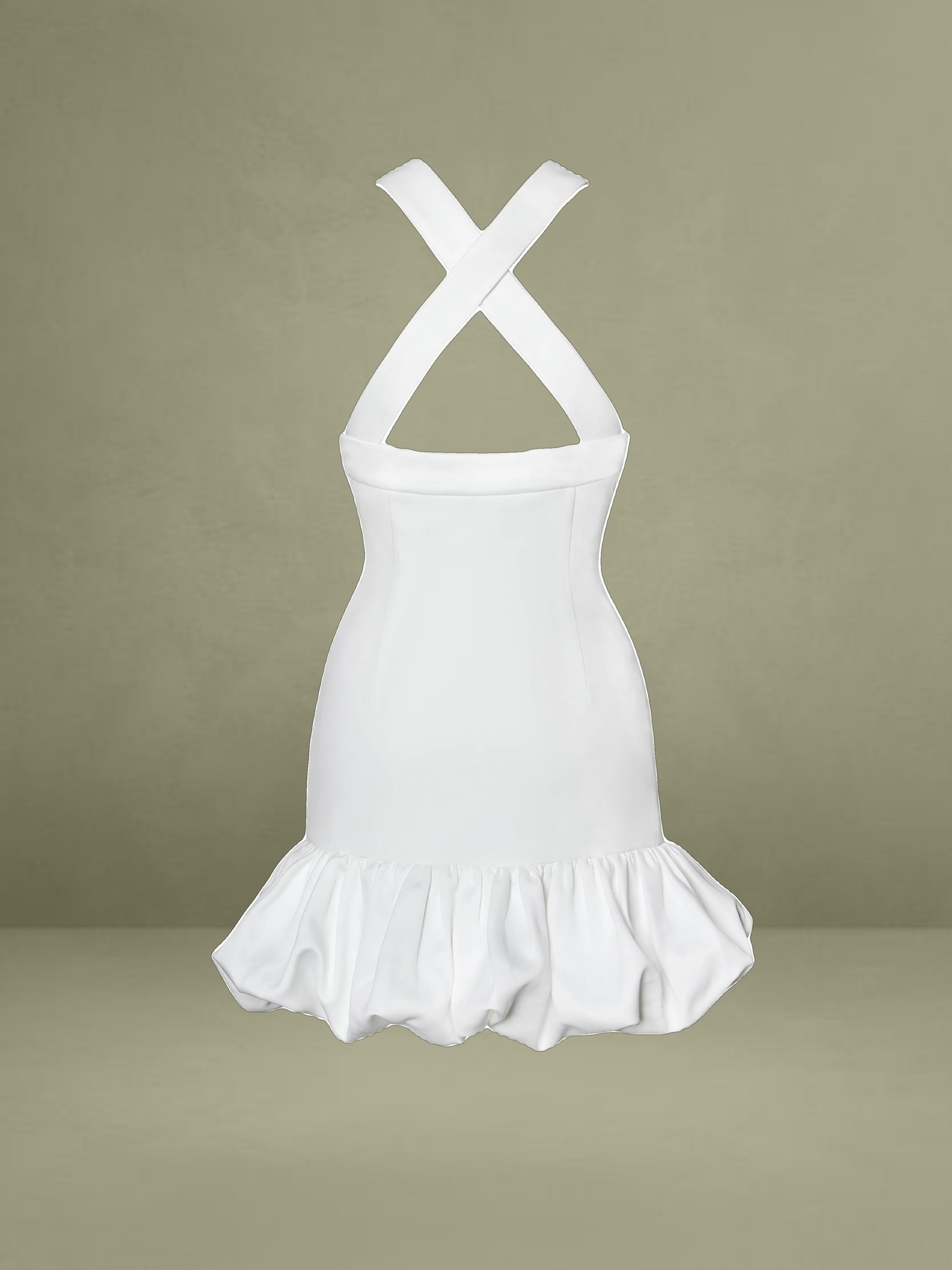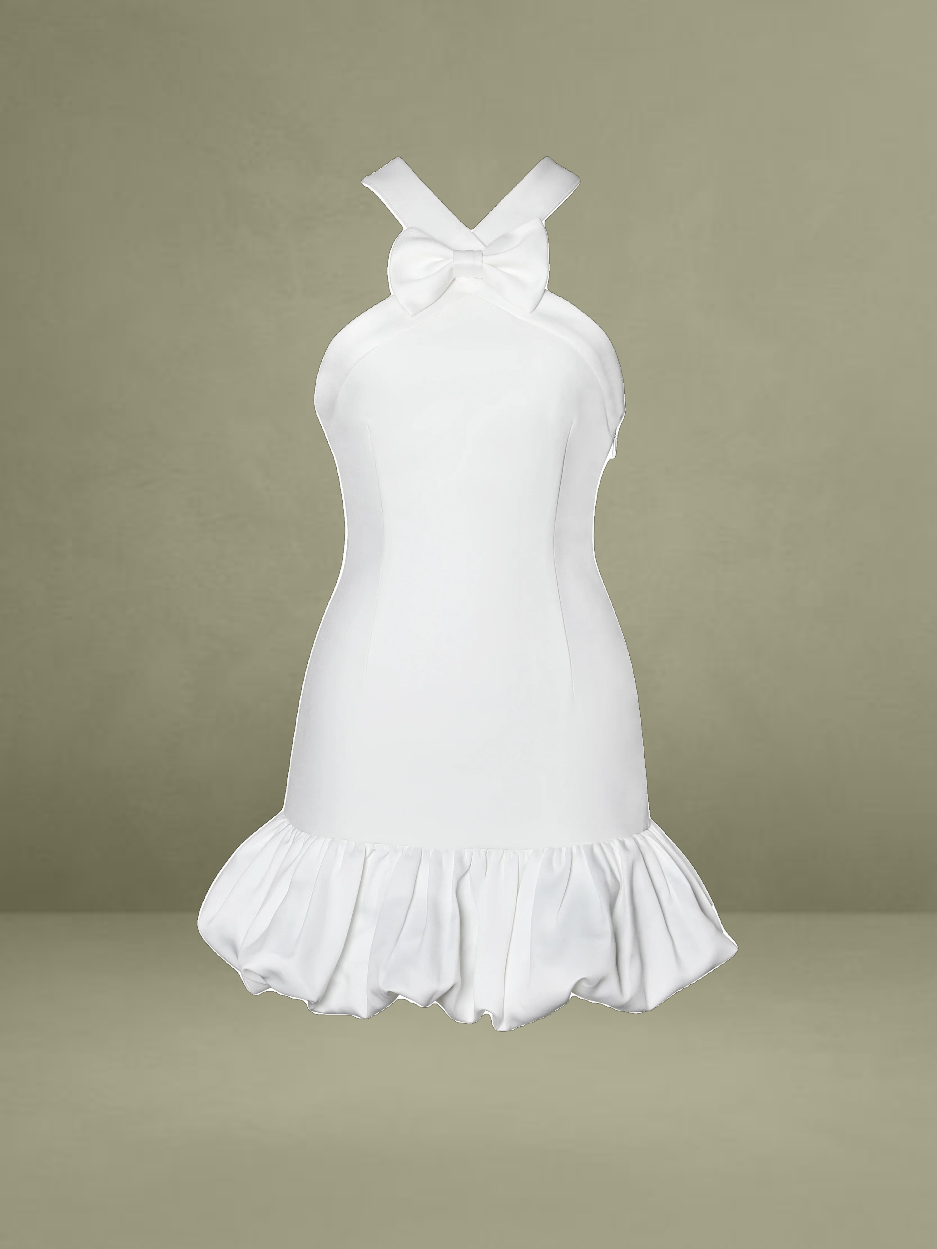 Discover a captivating dress that's perfect for making a statement. This white dress features elegant cross shoulder straps, adding a touch of luxury. A charming bowtie accents the neckline, enhancing its romantic appeal. The body-hugging silhouette beautifully showcases your curves, leading to a playful bubble hem made of high-quality satin for a refined finish. An invisible back zipper ensures a seamless look. Ideal for special occasions, this dress is a bold choice for those who want to stand out. It's also available in Red.