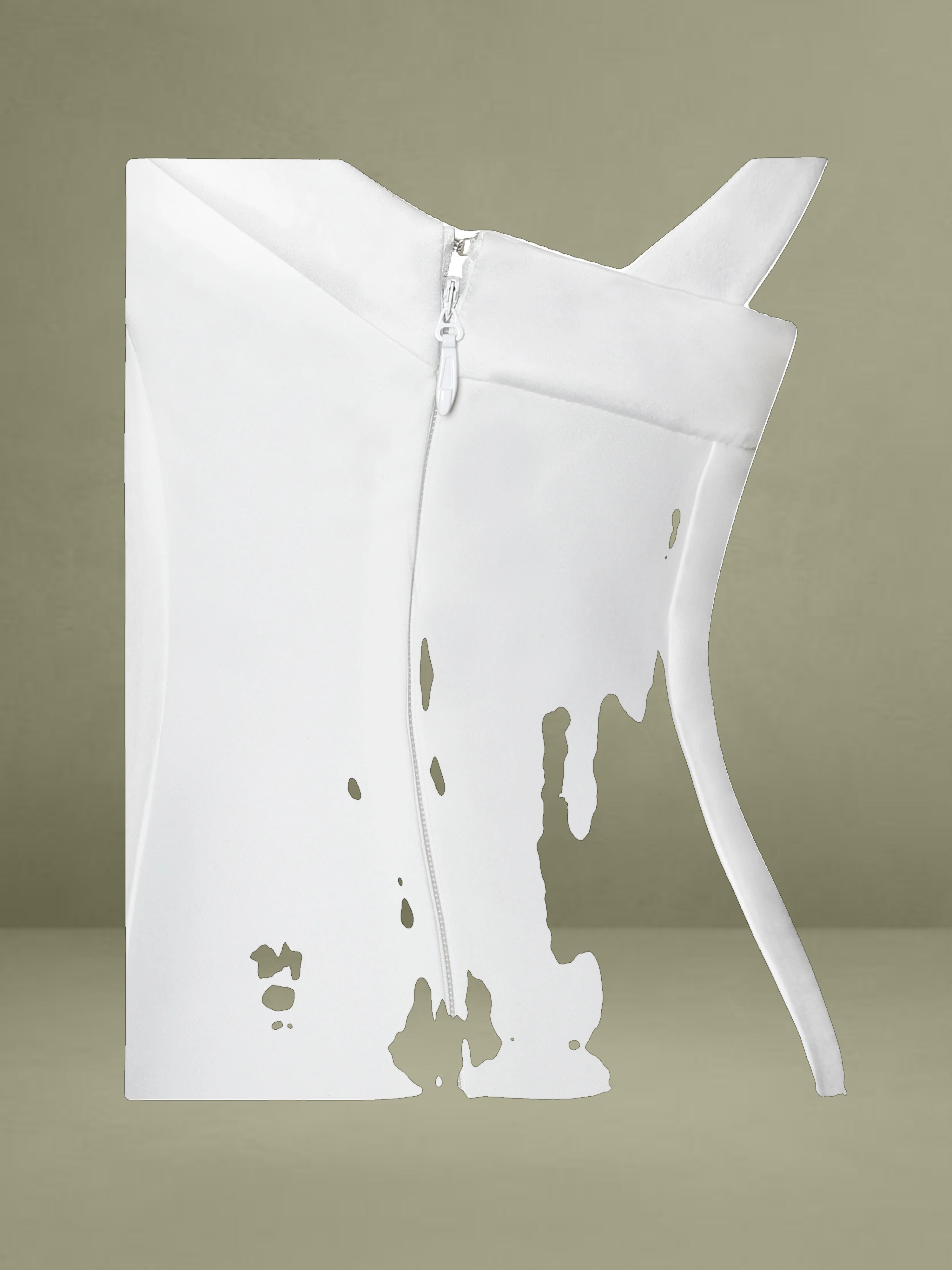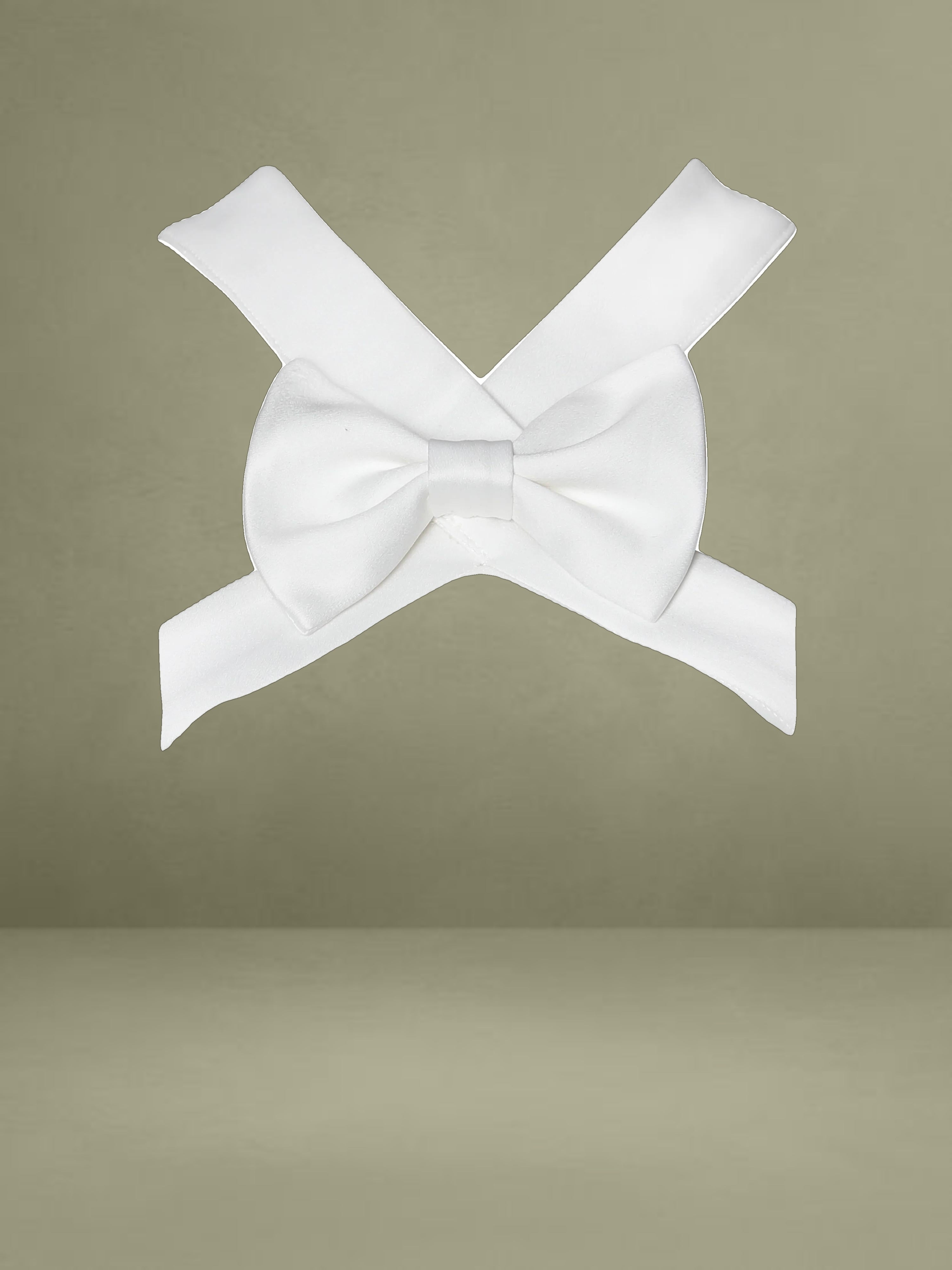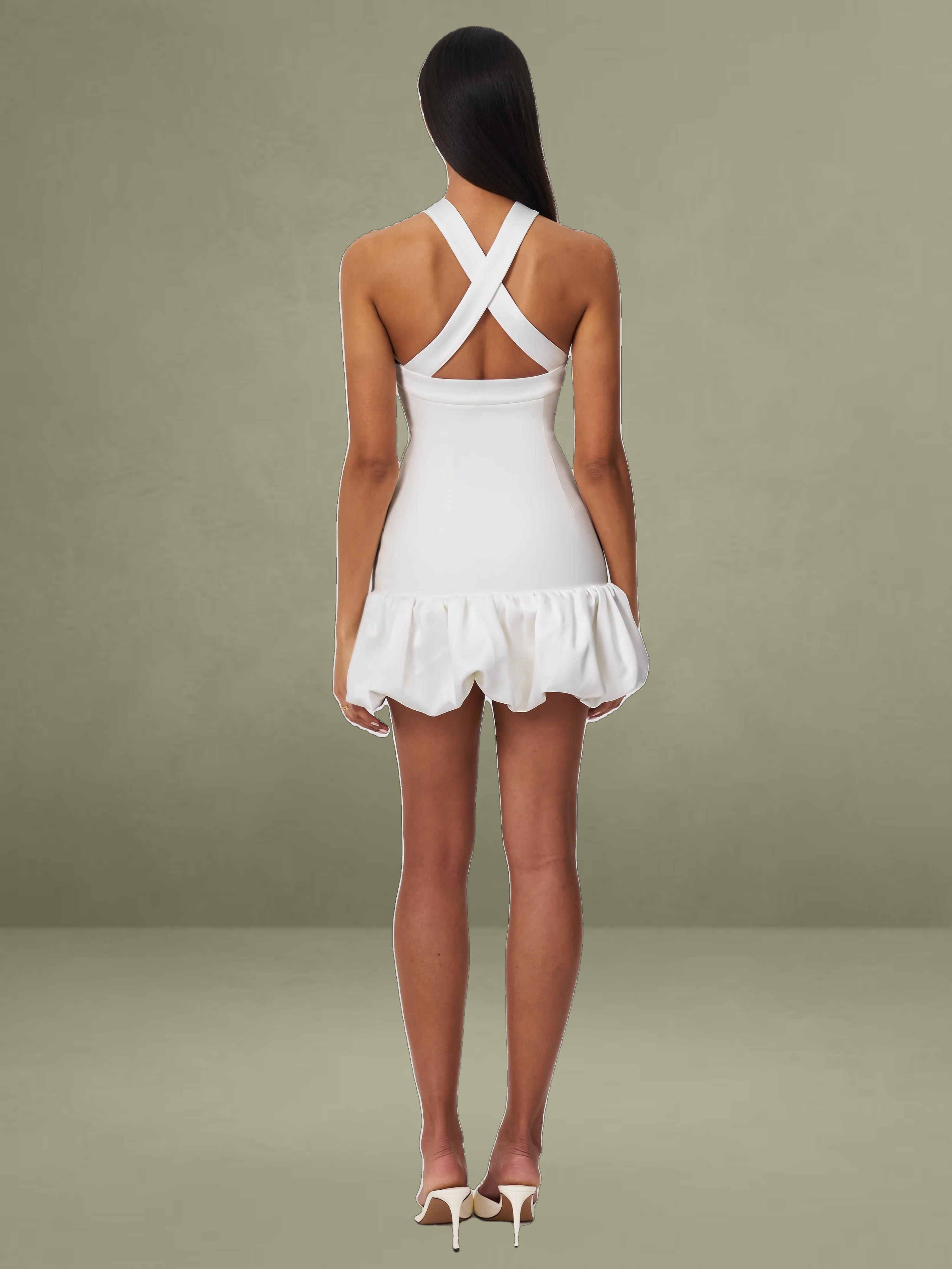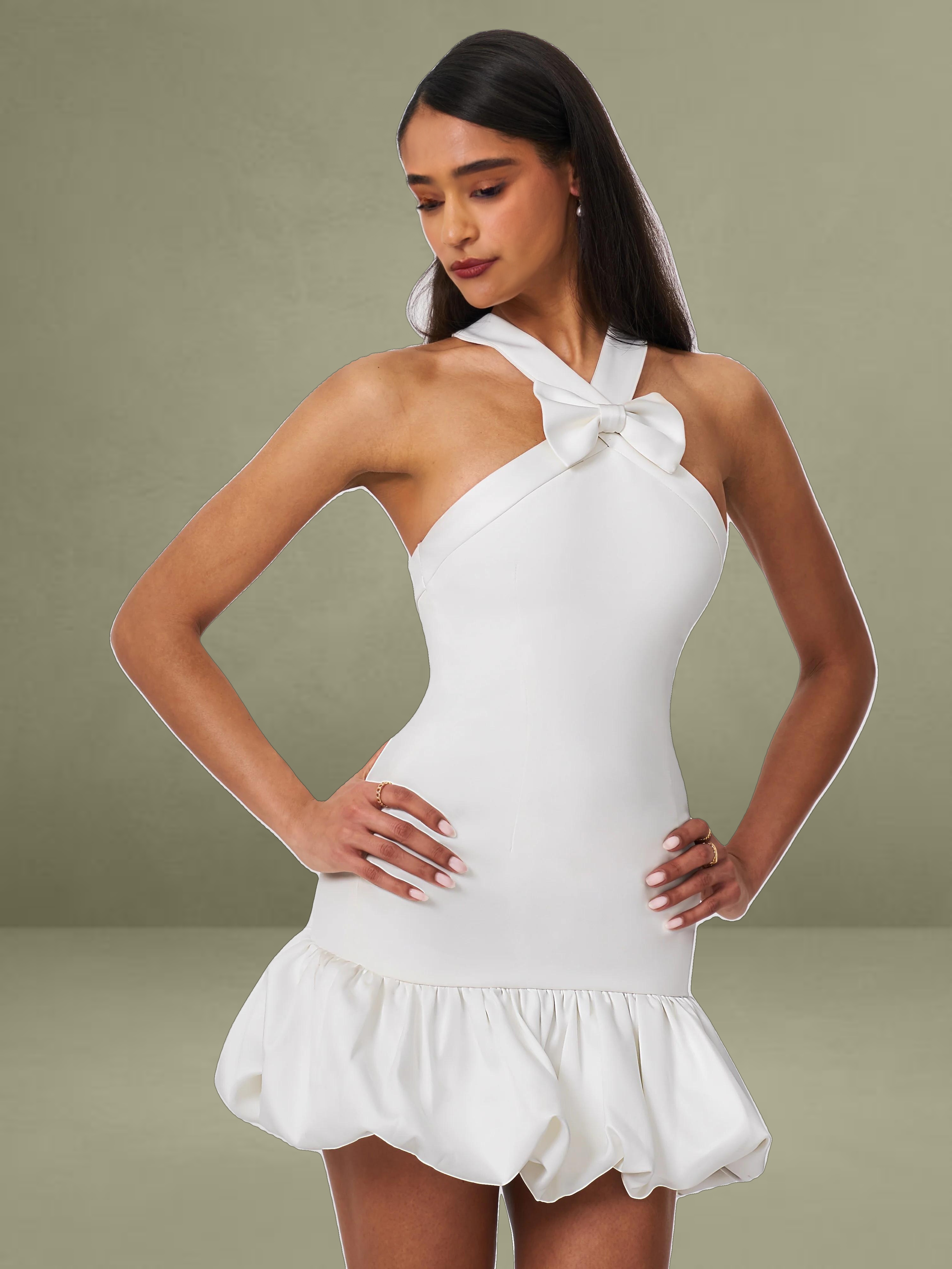 Discover a captivating dress that's perfect for making a statement. This white dress features elegant cross shoulder straps, adding a touch of luxury. A charming bowtie accents the neckline, enhancing its romantic appeal. The body-hugging silhouette beautifully showcases your curves, leading to a playful bubble hem made of high-quality satin for a refined finish. An invisible back zipper ensures a seamless look. Ideal for special occasions, this dress is a bold choice for those who want to stand out. It's also available in Red.