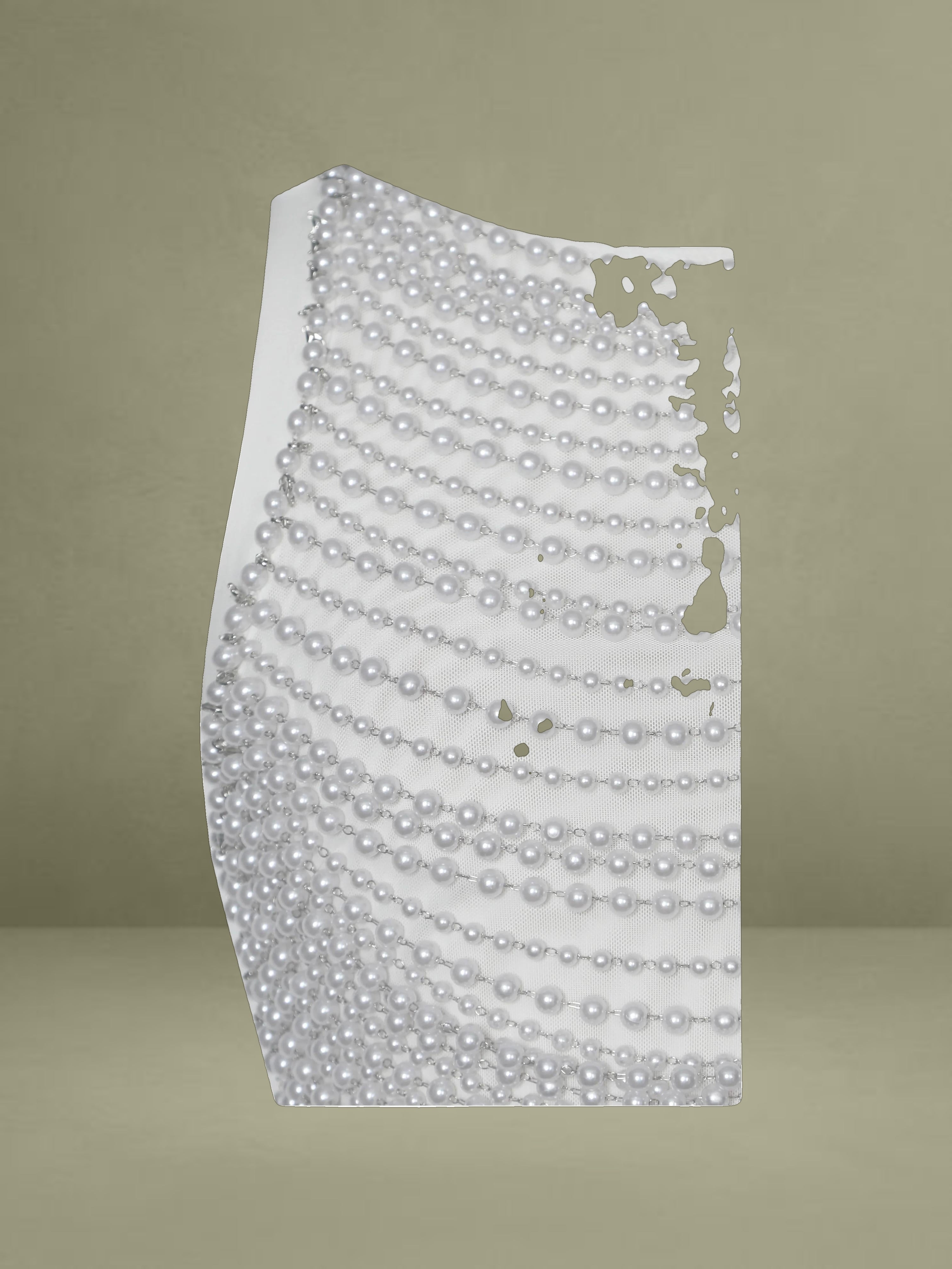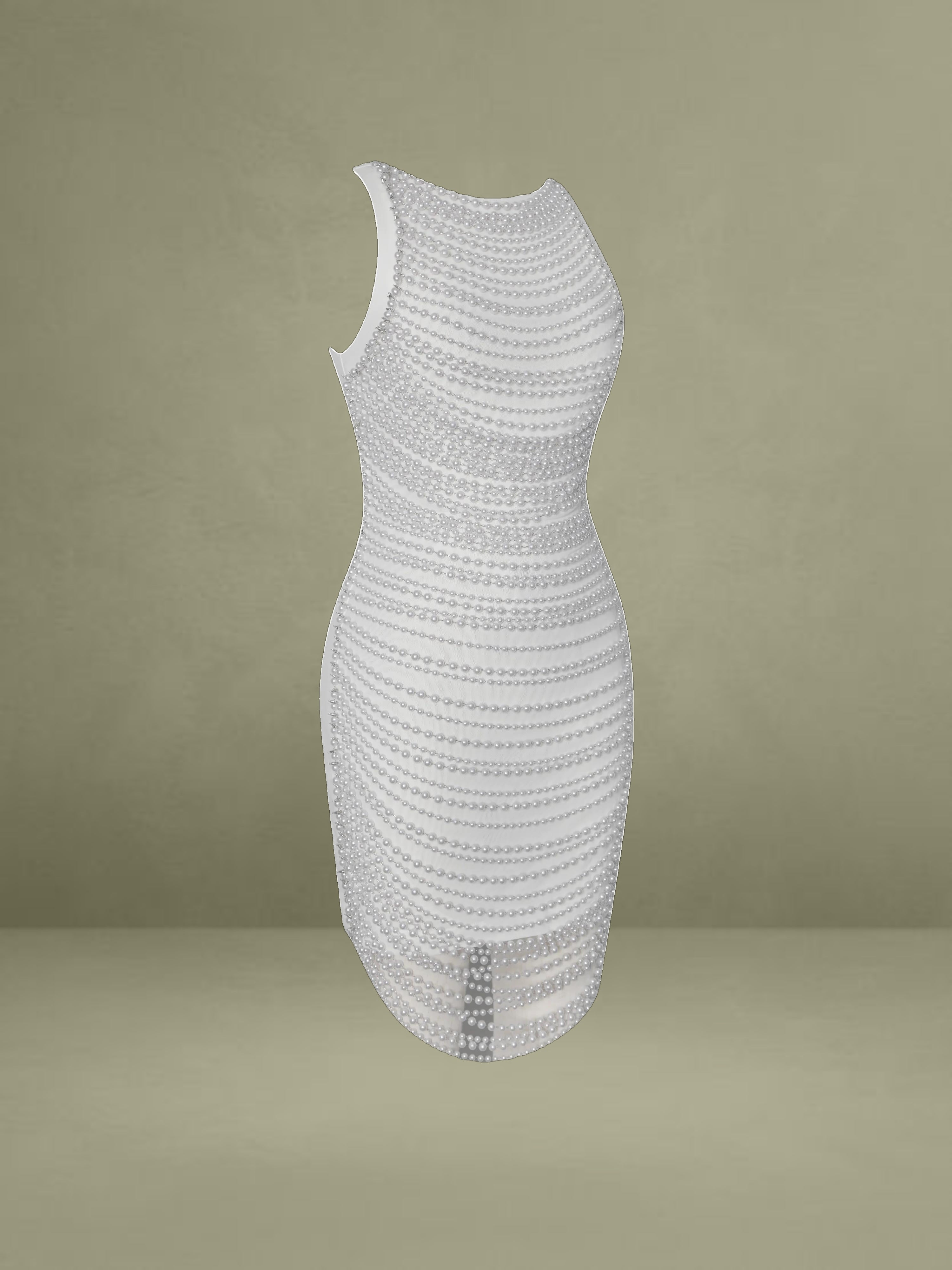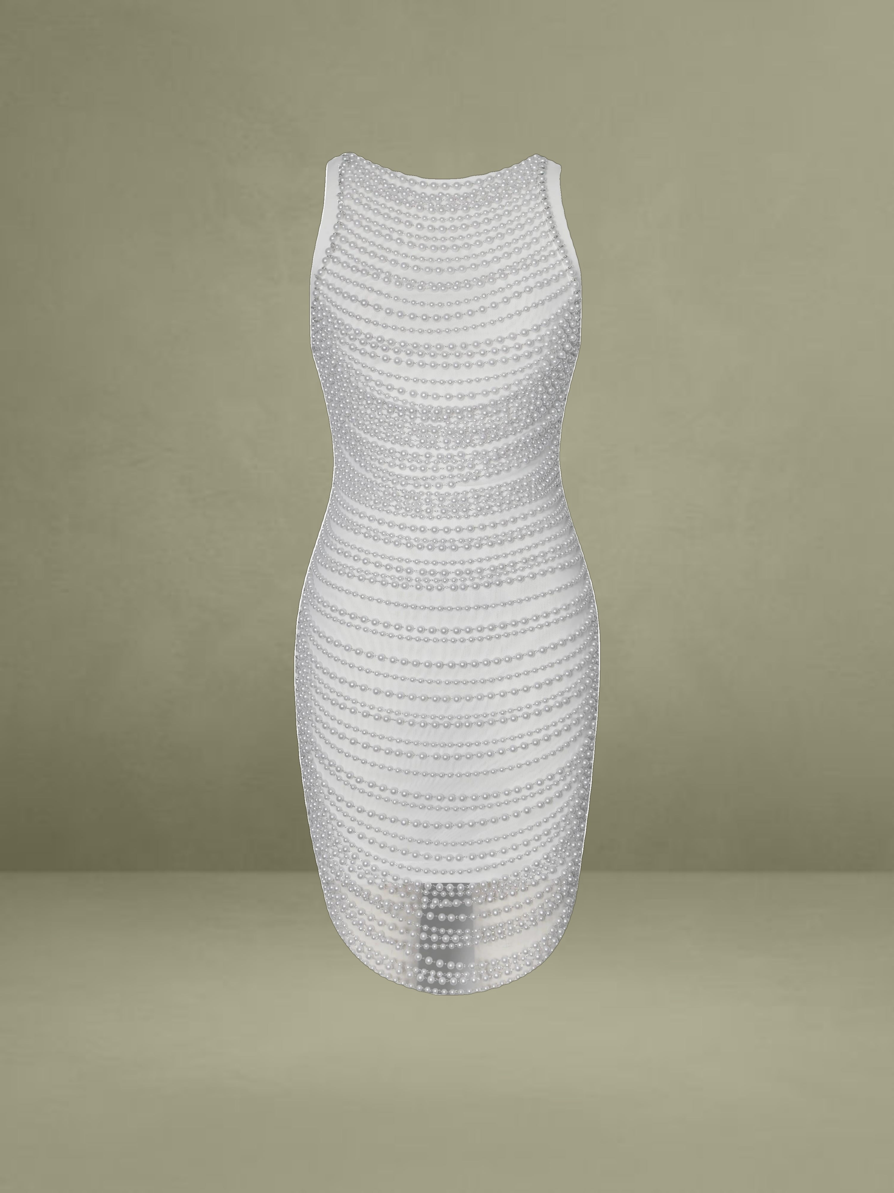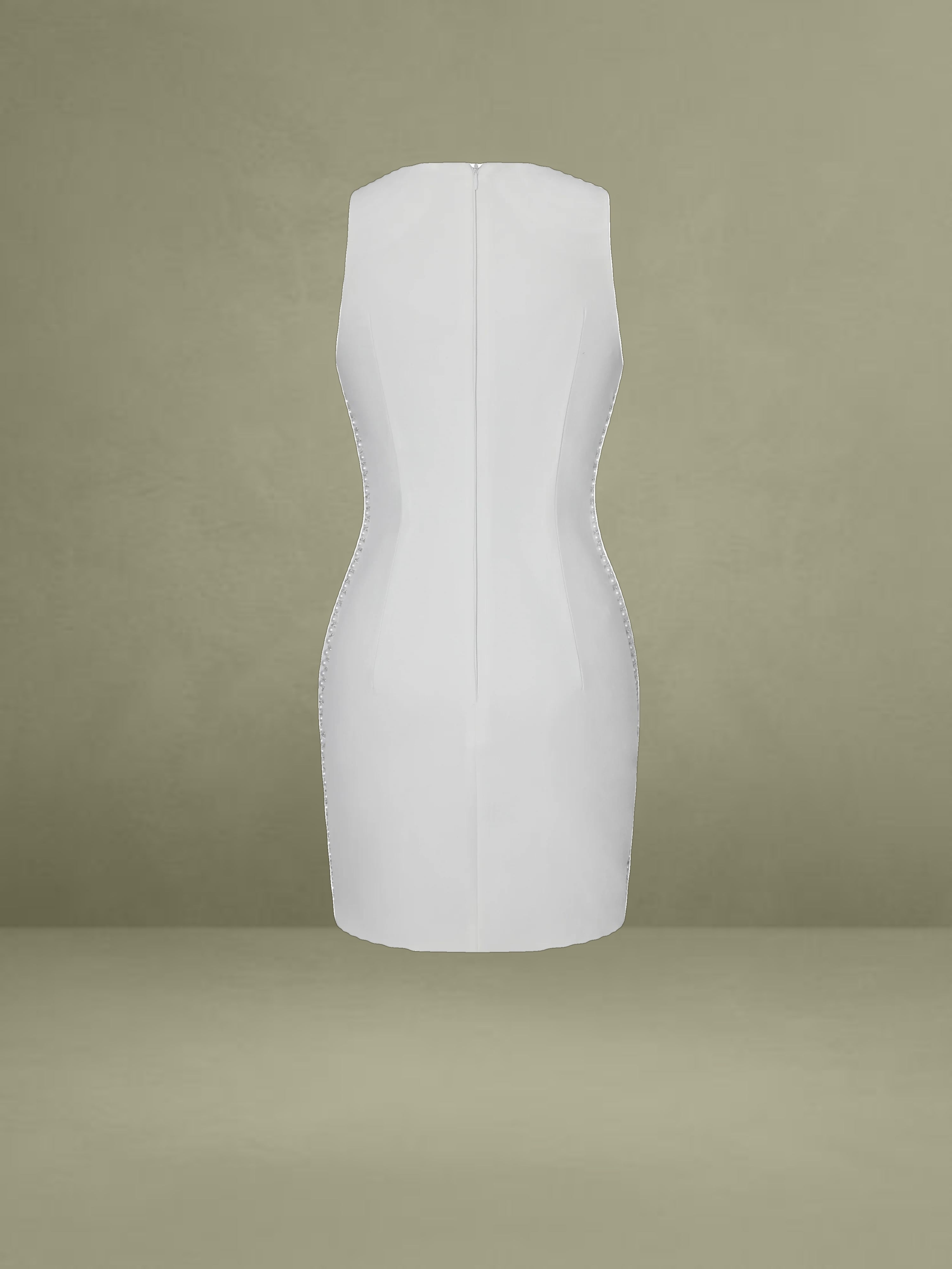 Exuding modern charm, this white midi dress combines sheer and solid elements. It has a soft mesh layer over structured white crepe for a layered appearance. Pearl embellishments flow down the front, creating a shiny and sculpted look. It's sleeveless with a rounded neck and hem, and princess seams shape a well - fitted silhouette. Lined with satin and mesh for comfort and coverage, the back has a hidden zipper for a smooth fit. Ideal for sunny vacations, seaside events, and parties that need a touch of sparkle.