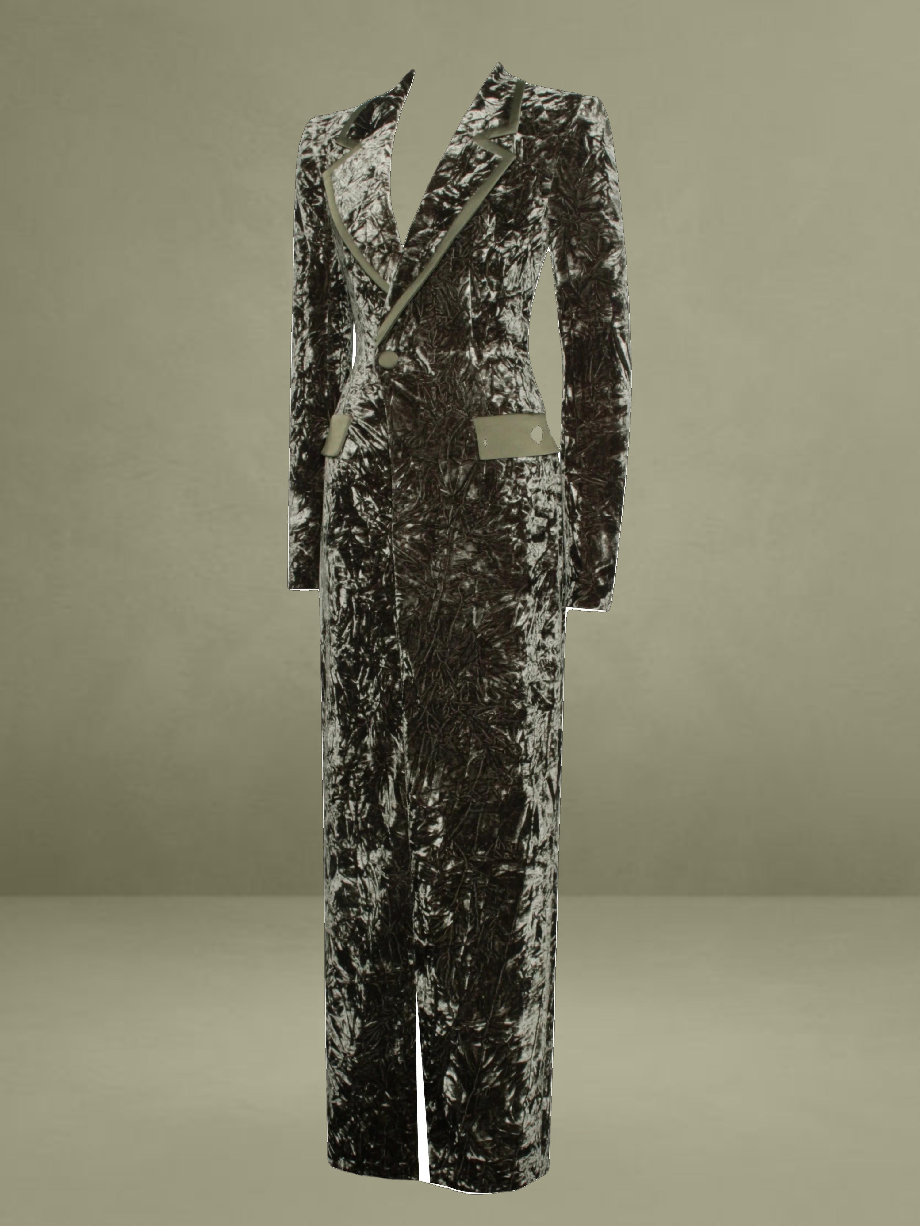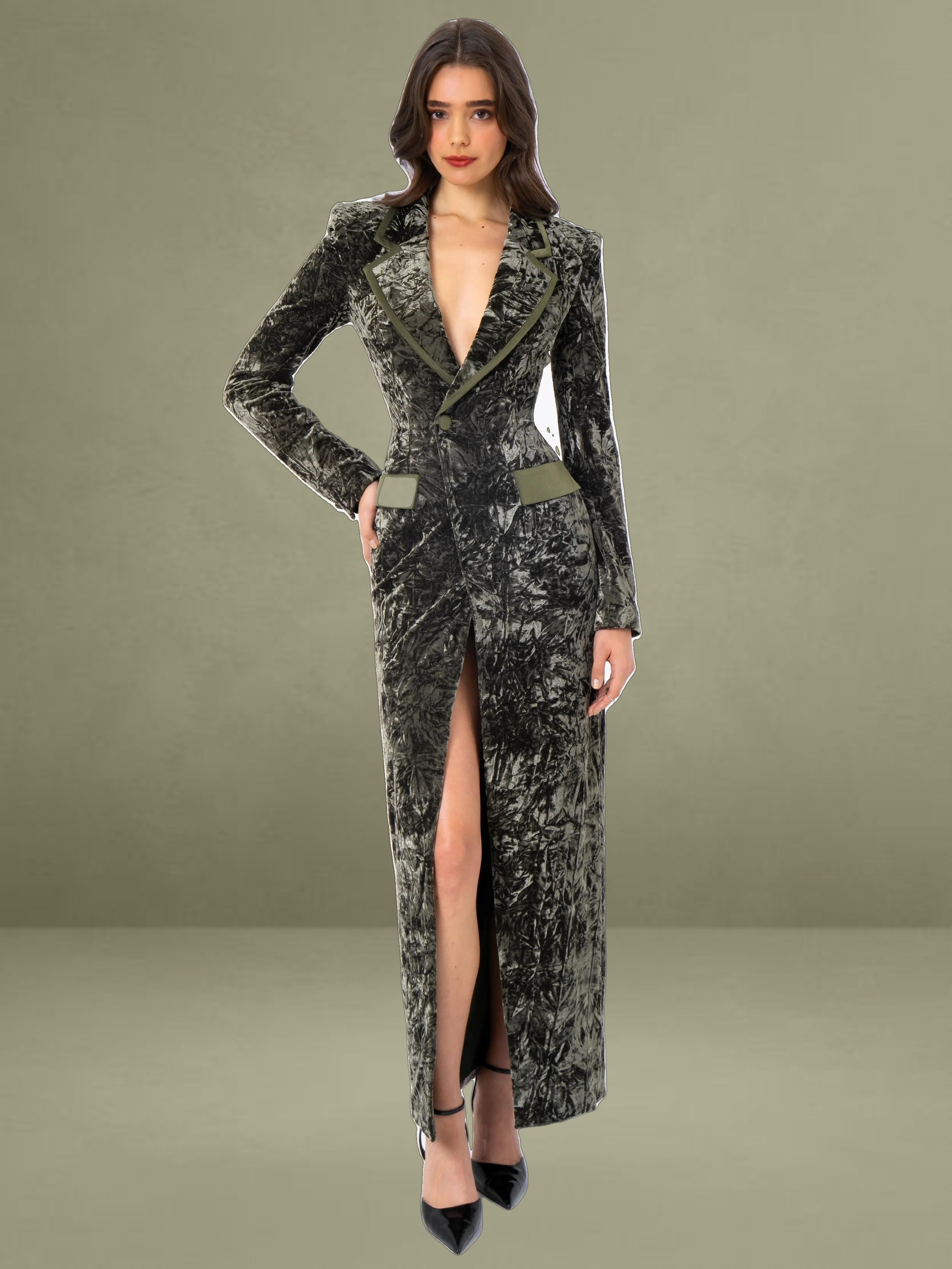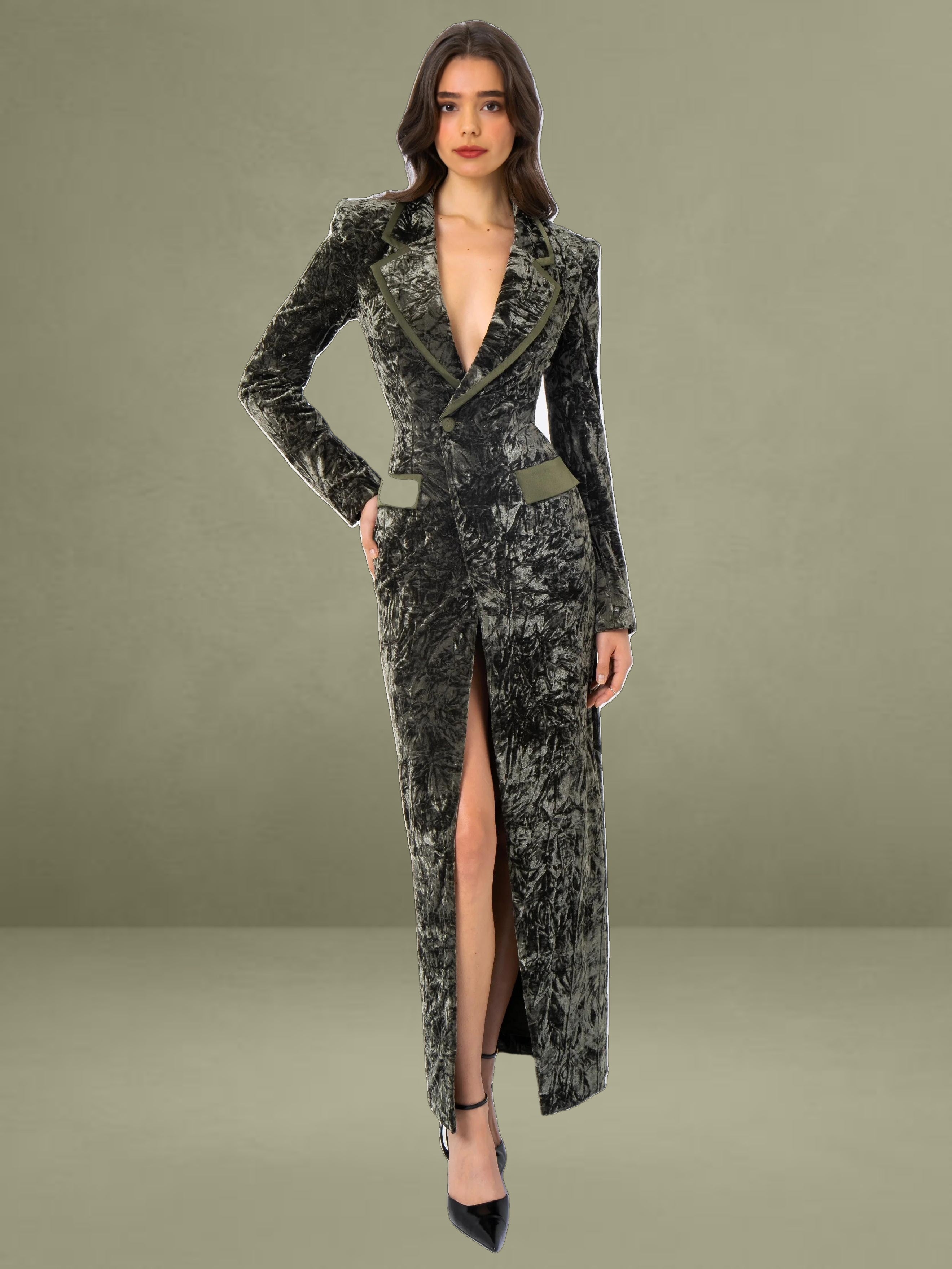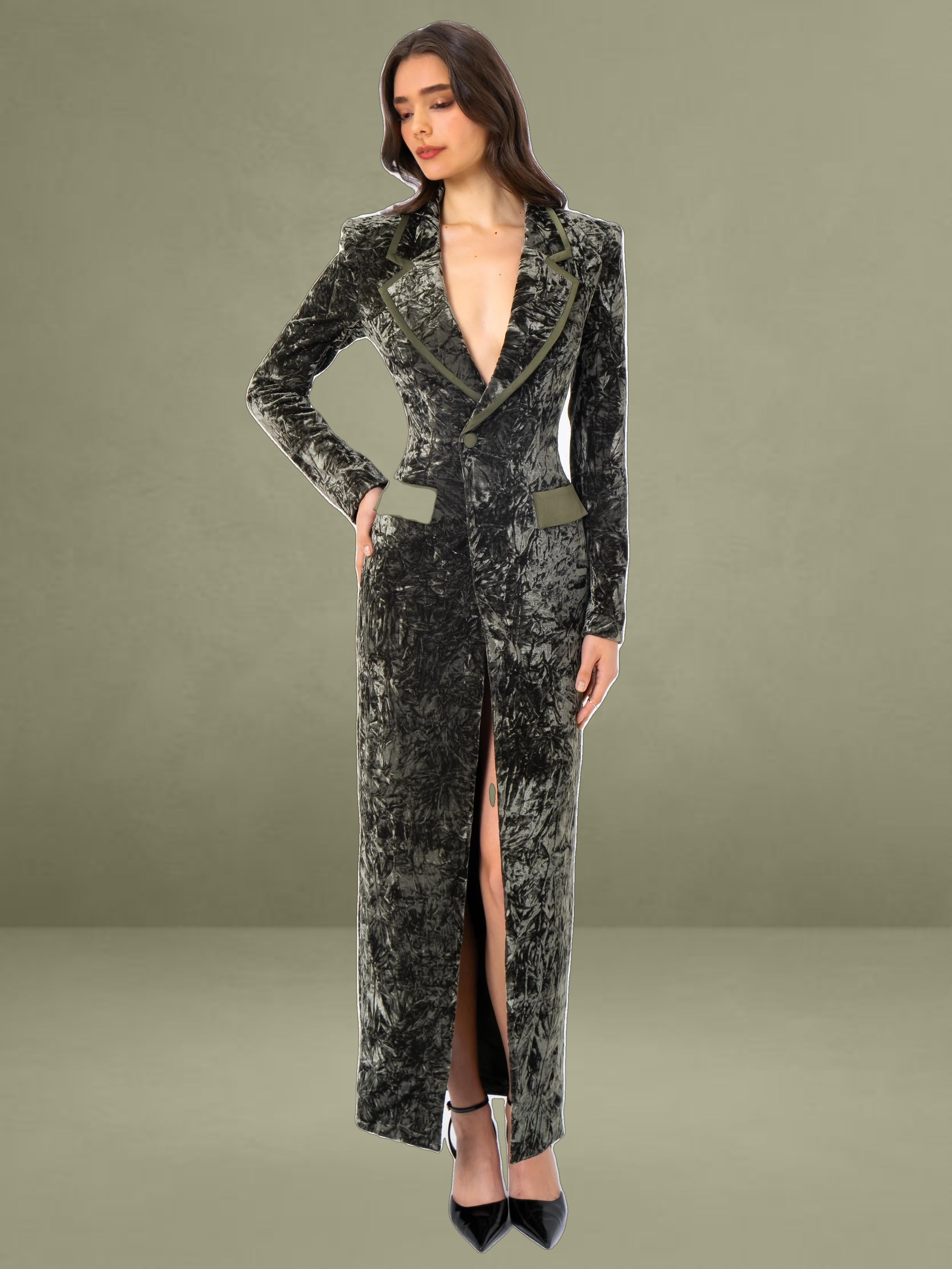 Introducing the Willow Green Glossy Velvet High Slit Blazer Gown Evening Coat, a striking blend of elegance and power. Crafted from luxurious glossy and shiny Diamond Velvet, this gown exudes sophistication with its sleek, tailored blazer design. The long sleeves feature structured shoulder pads, while the luxe satin trim and pocket cap decorations add refined details. A daring high slit offers a dramatic flair, perfect for making a statement. The gown is fully lined for a smooth fit, and the front is adorned with a satin-covered button for a polished finish. Ideal for high-end events, and it's also available in timeless black.
