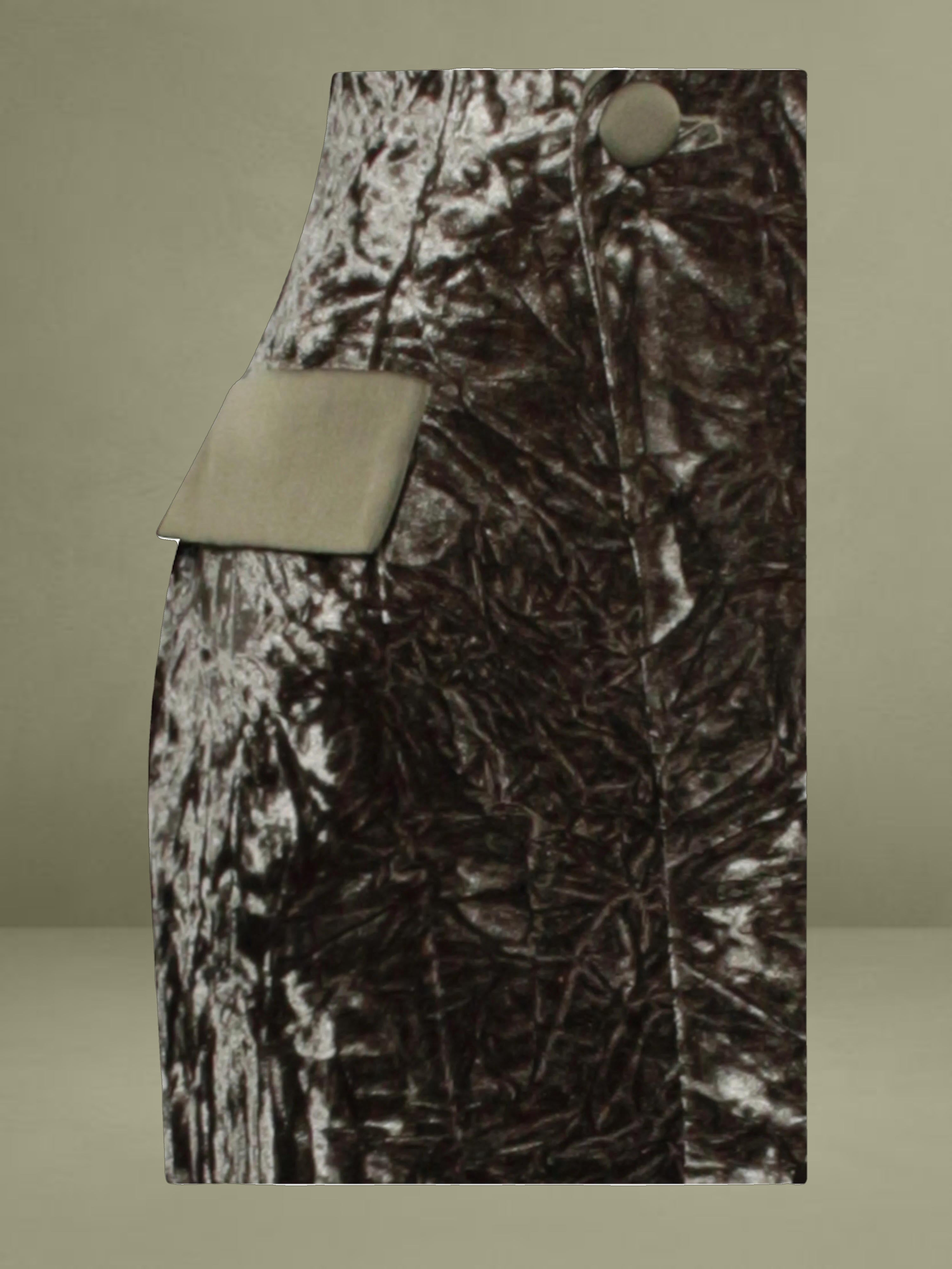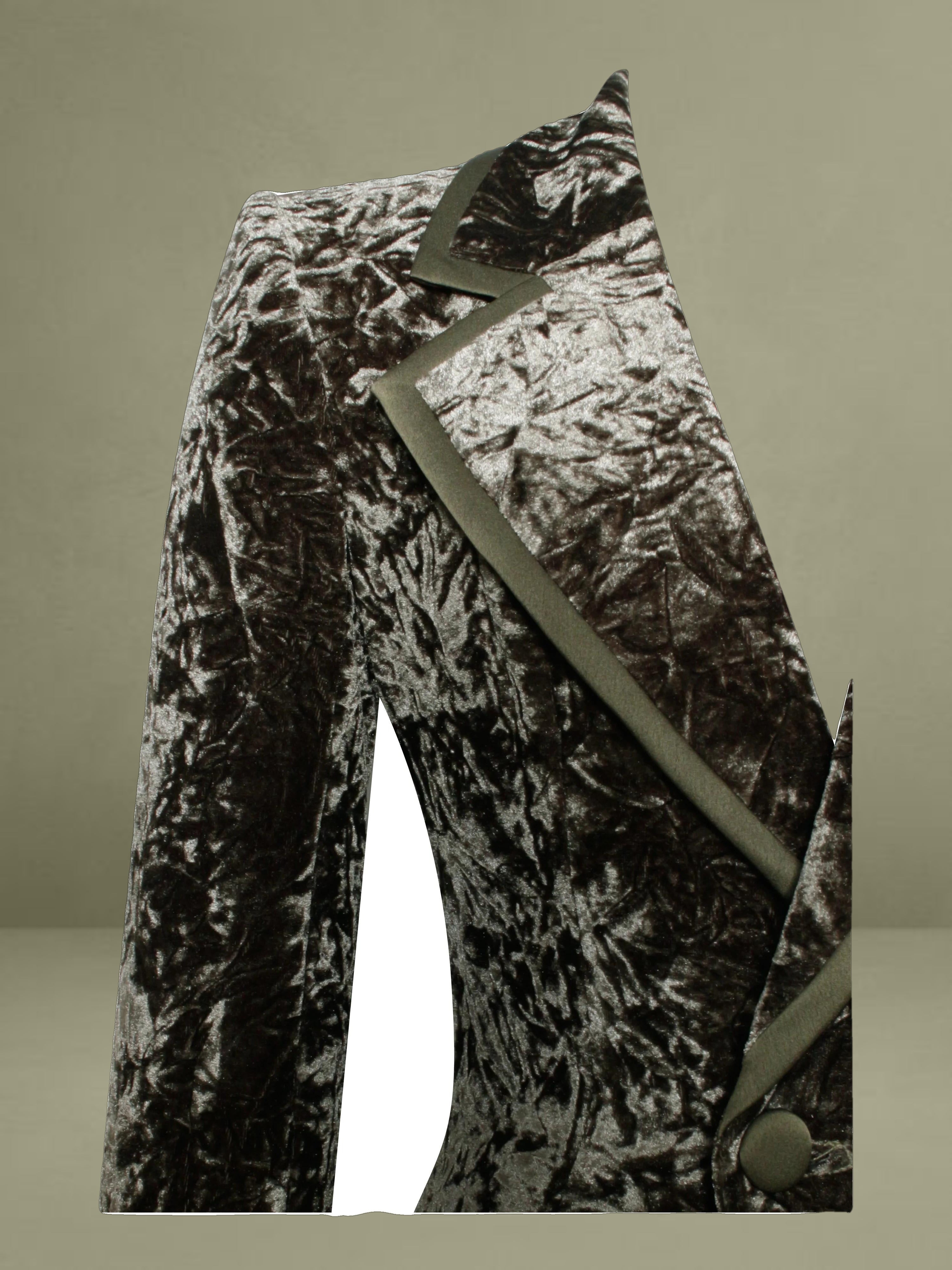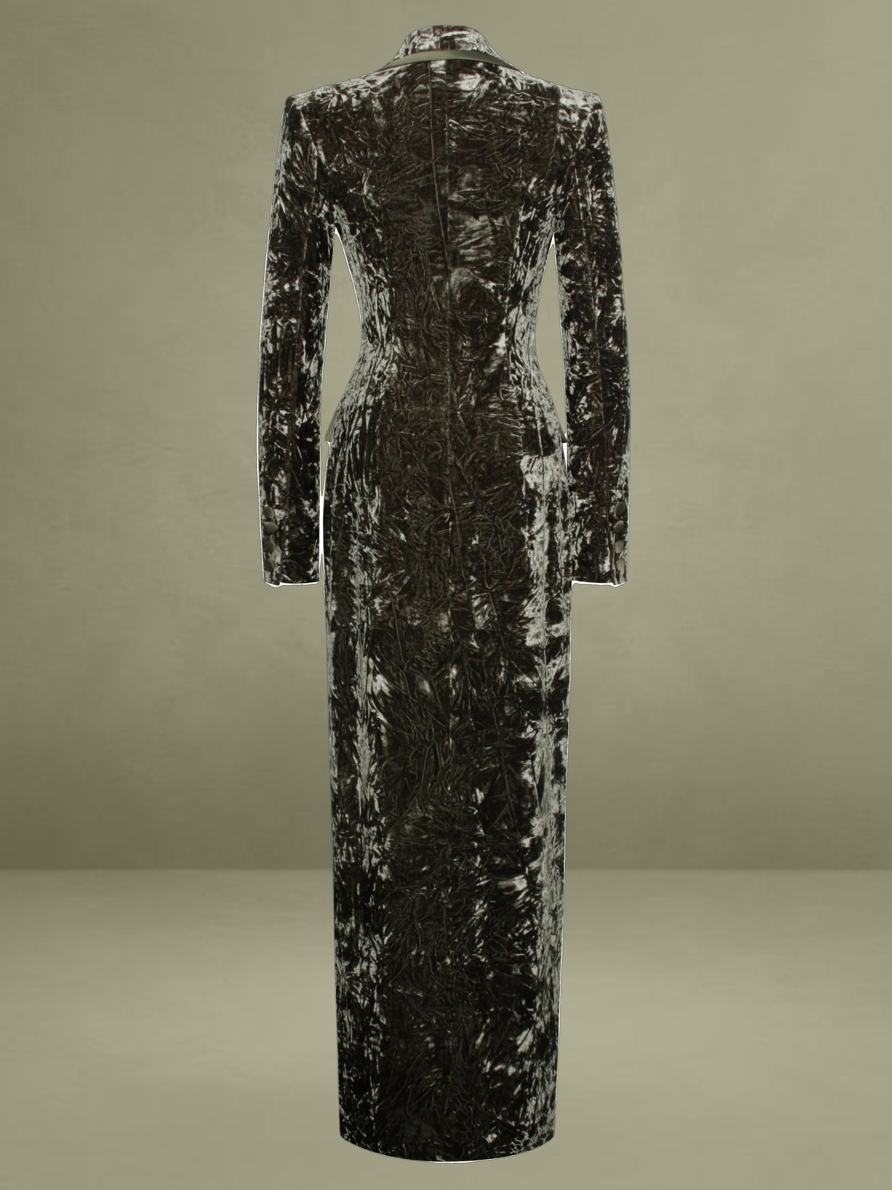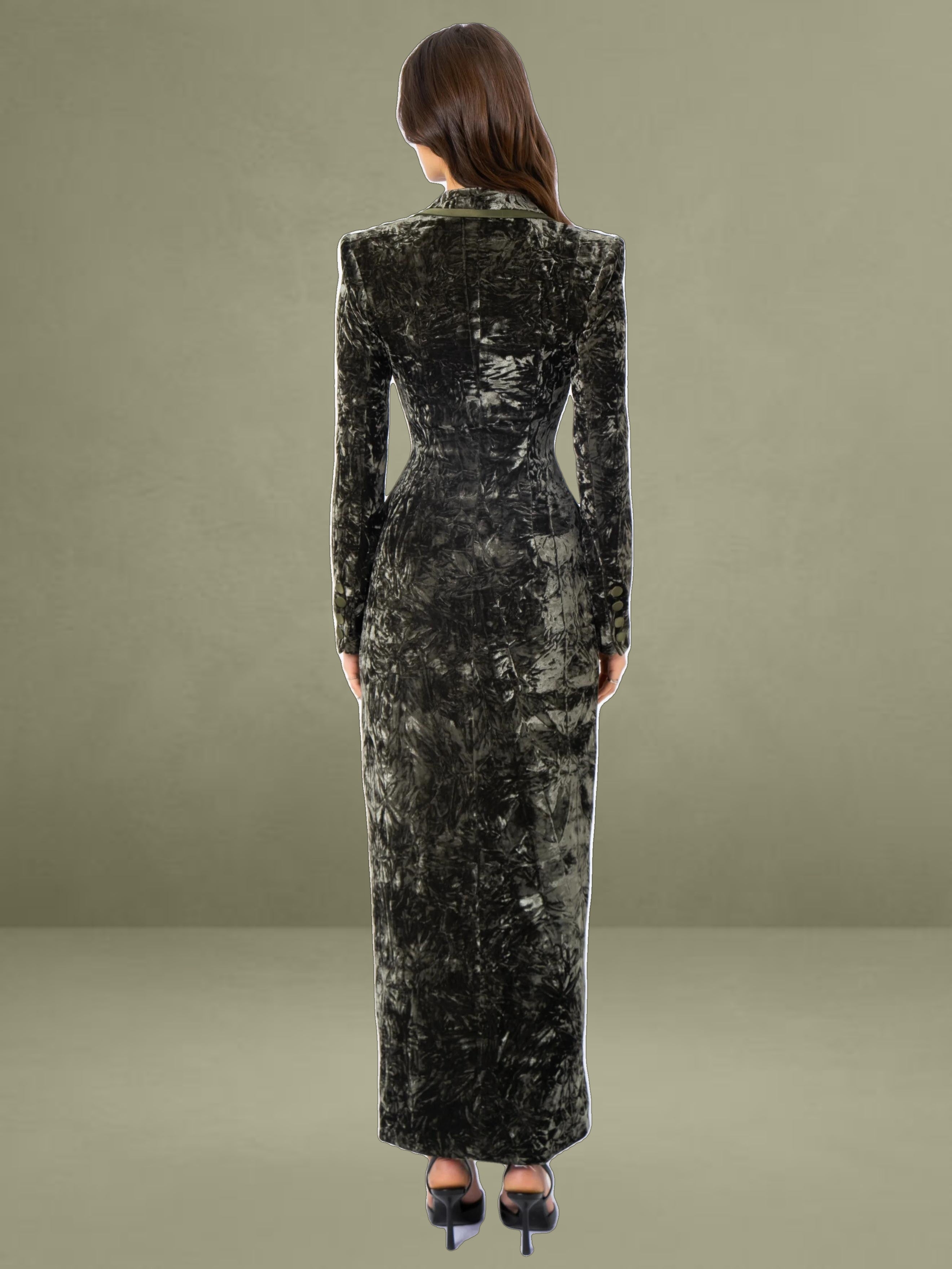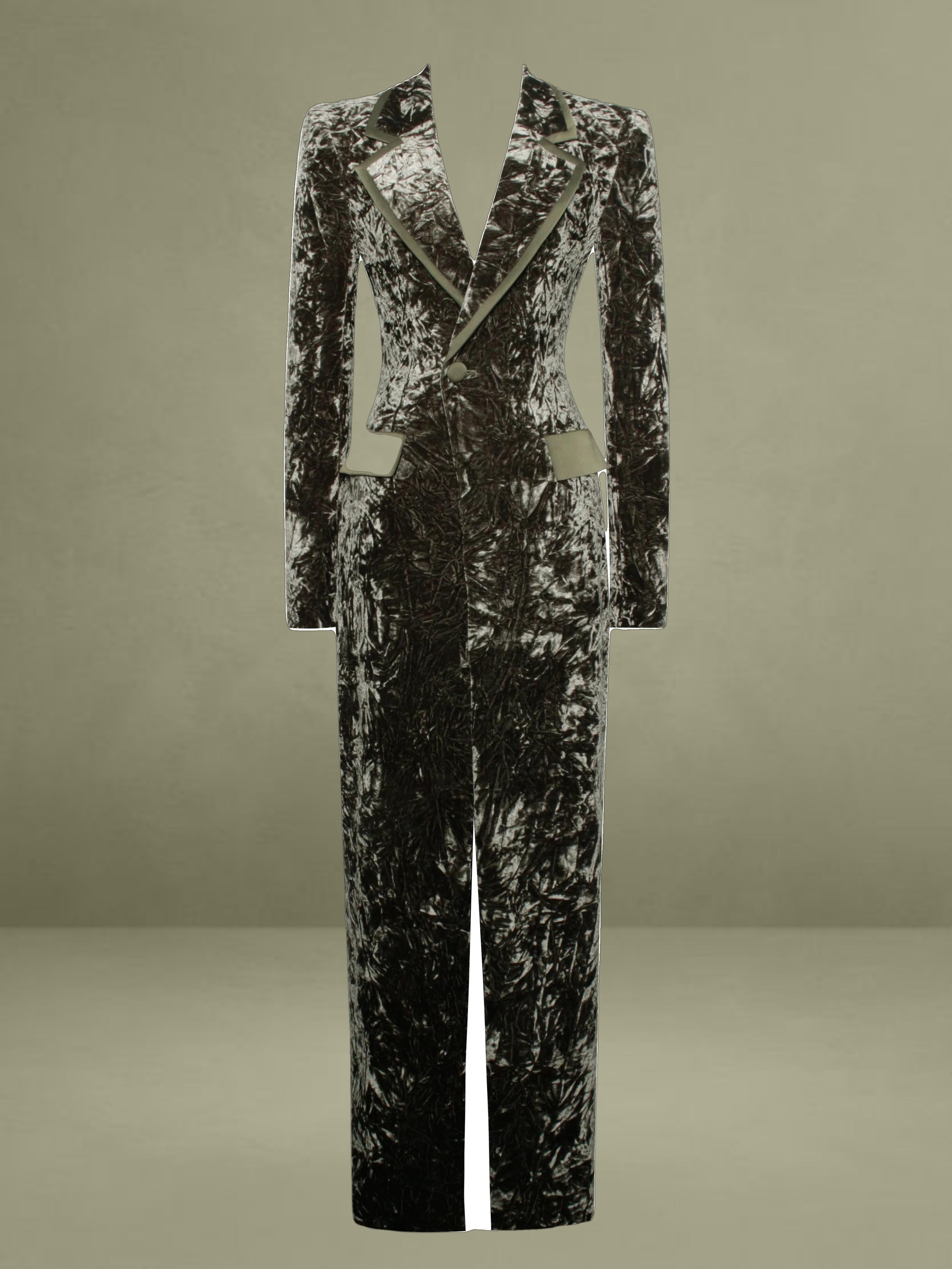 Introducing the Willow Green Glossy Velvet High Slit Blazer Gown Evening Coat, a striking blend of elegance and power. Crafted from luxurious glossy and shiny Diamond Velvet, this gown exudes sophistication with its sleek, tailored blazer design. The long sleeves feature structured shoulder pads, while the luxe satin trim and pocket cap decorations add refined details. A daring high slit offers a dramatic flair, perfect for making a statement. The gown is fully lined for a smooth fit, and the front is adorned with a satin-covered button for a polished finish. Ideal for high-end events, and it's also available in timeless black.