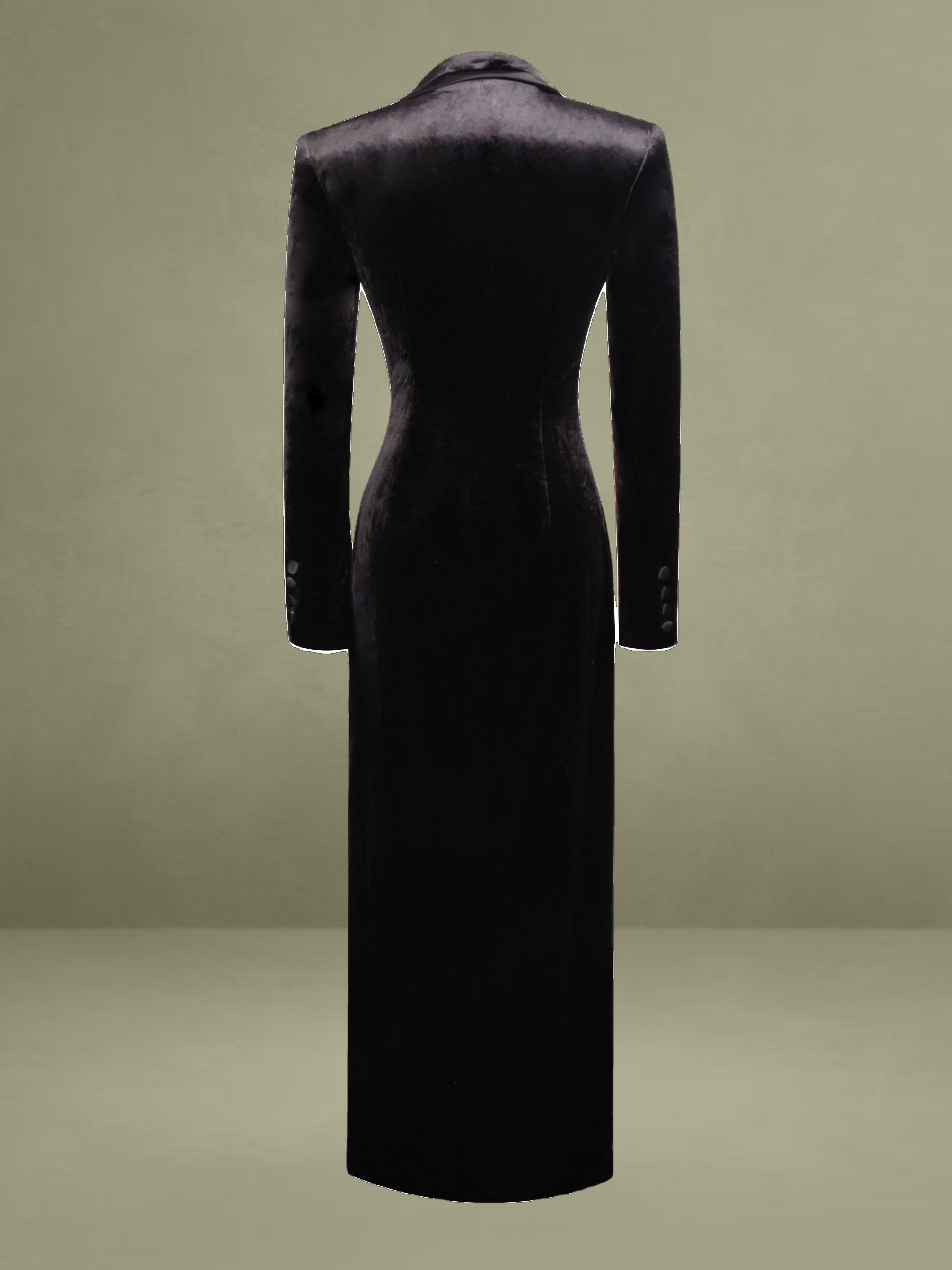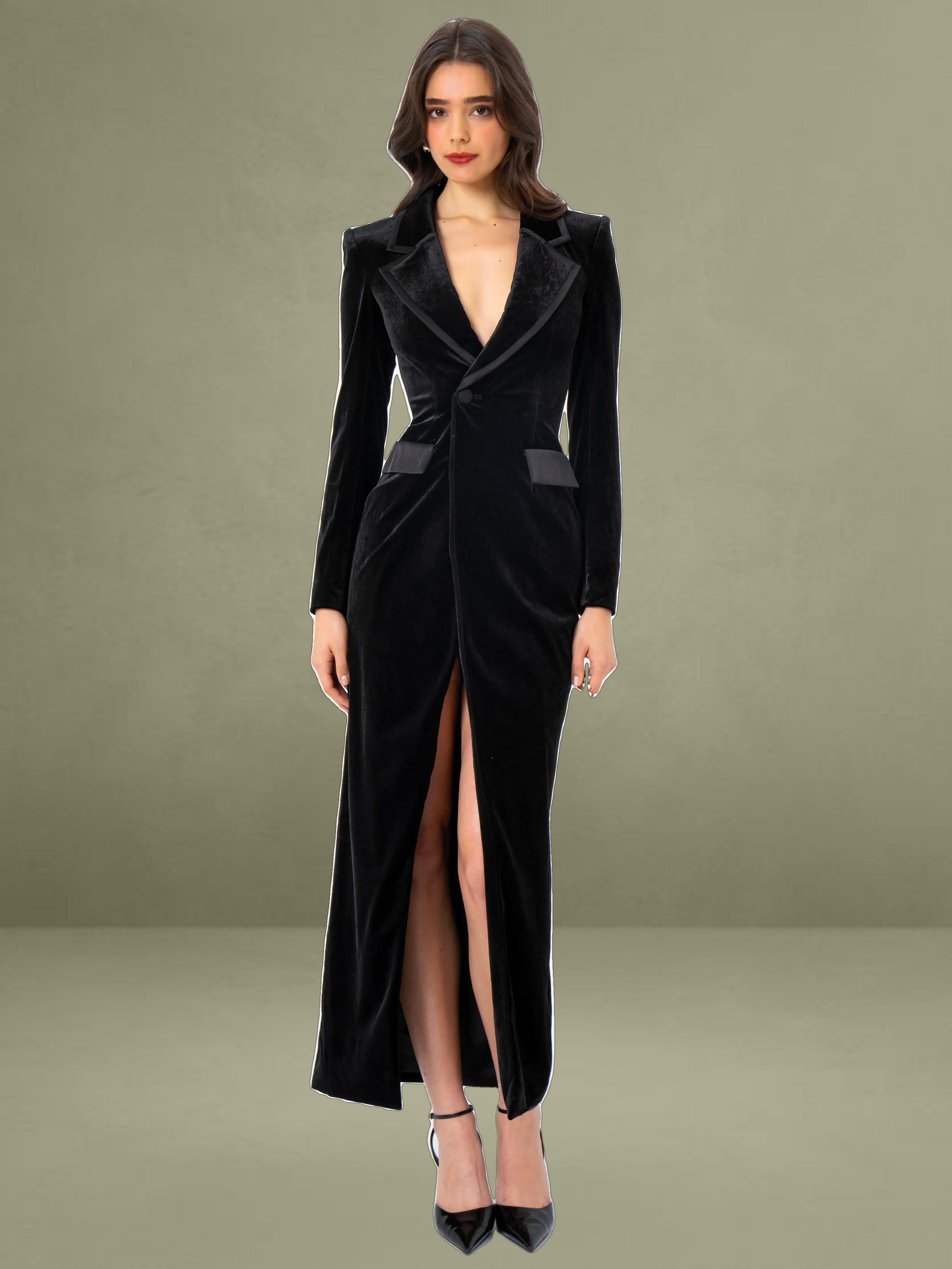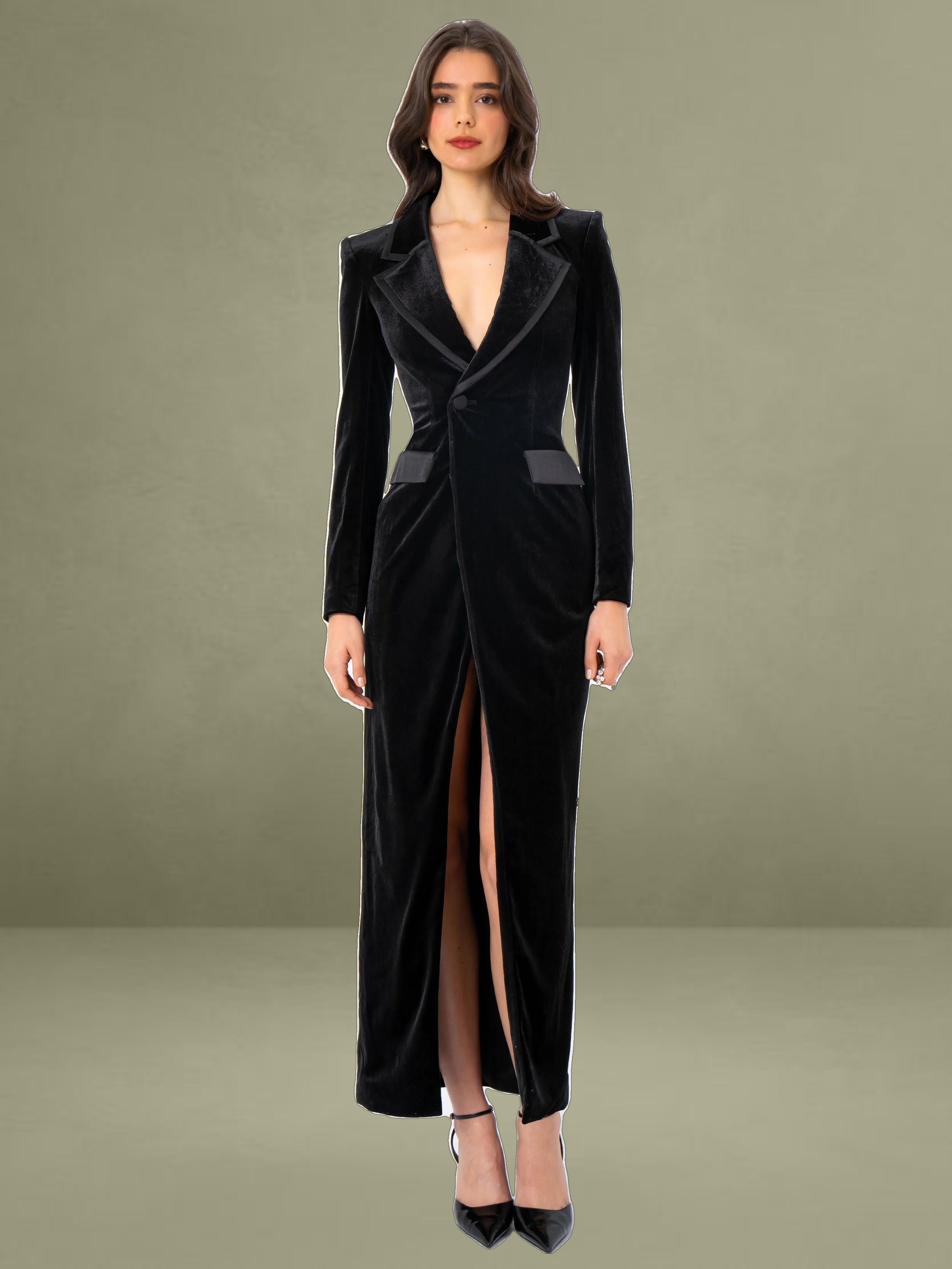 Introducing the Willow Velvet High Slit Blazer Gown Evening Coat, a striking blend of elegance and power. Crafted from luxurious black velvet, this gown exudes sophistication with its sleek, tailored blazer design. The long sleeves feature structured shoulder pads, while the luxe satin trim and pocket cap decorations add refined details. A daring high slit offers a dramatic flair, perfect for making a statement. The gown is fully lined for a smooth fit, and the front is adorned with a satin-covered button for a polished finish. Ideal for high-end events.