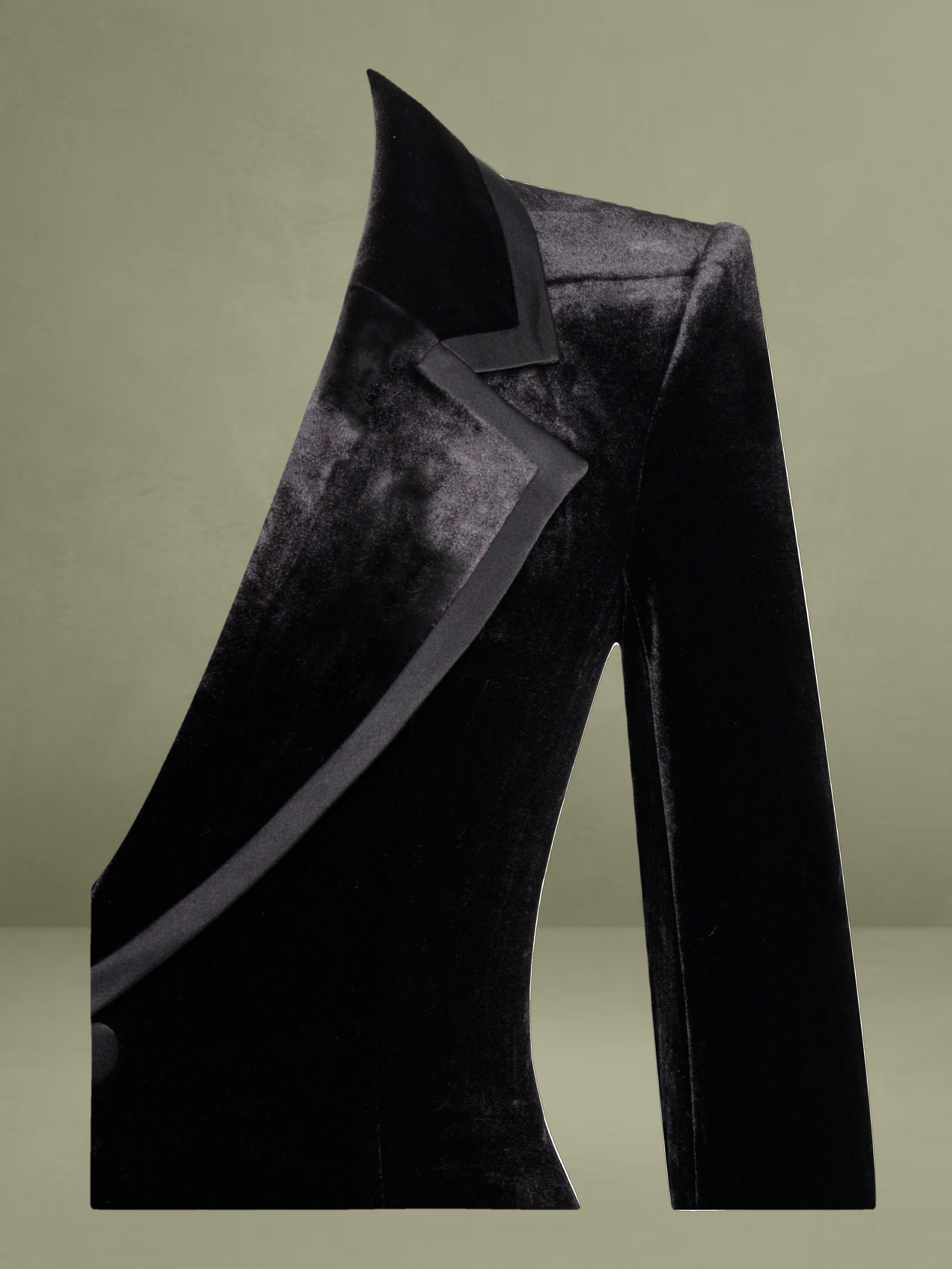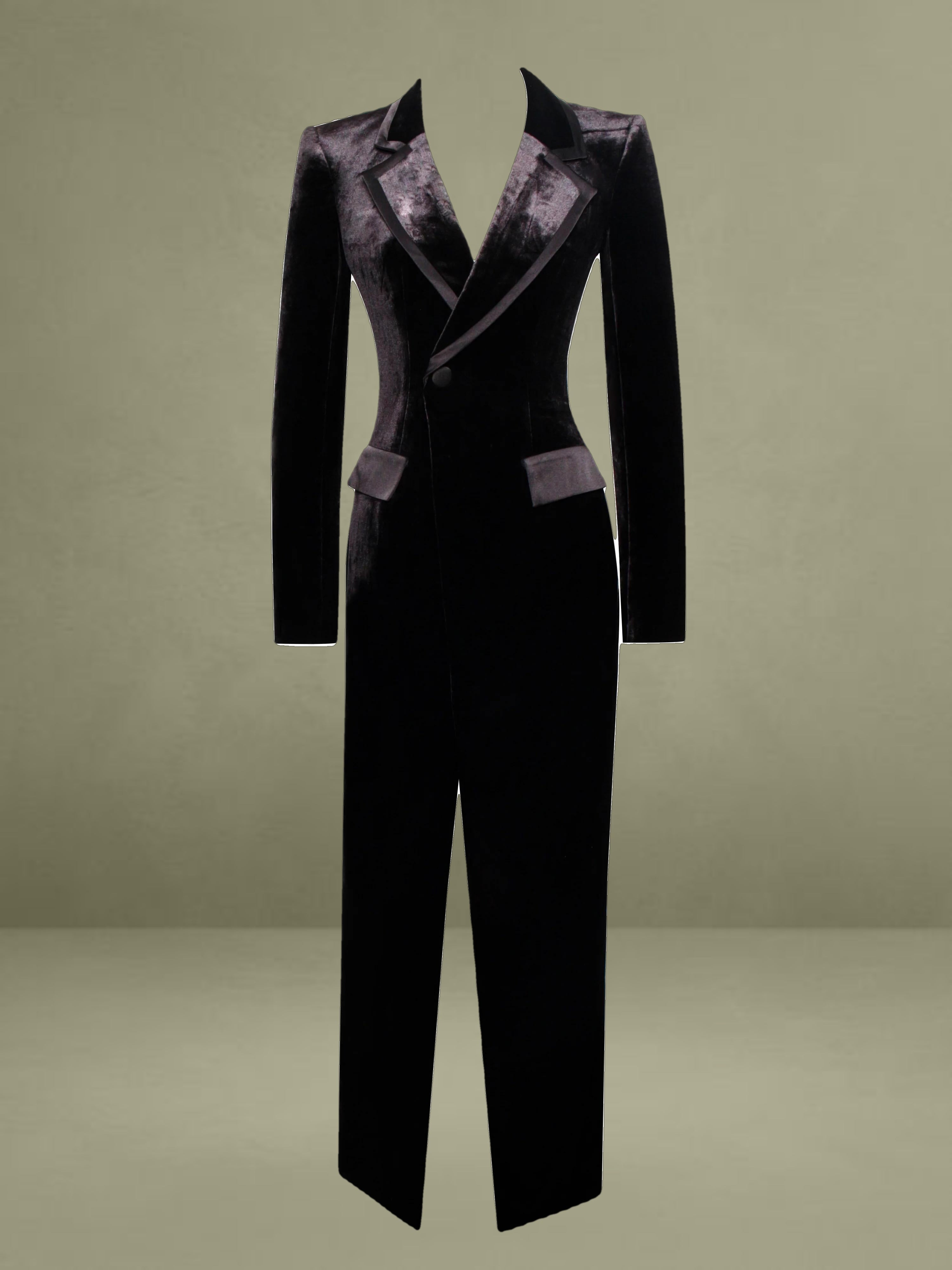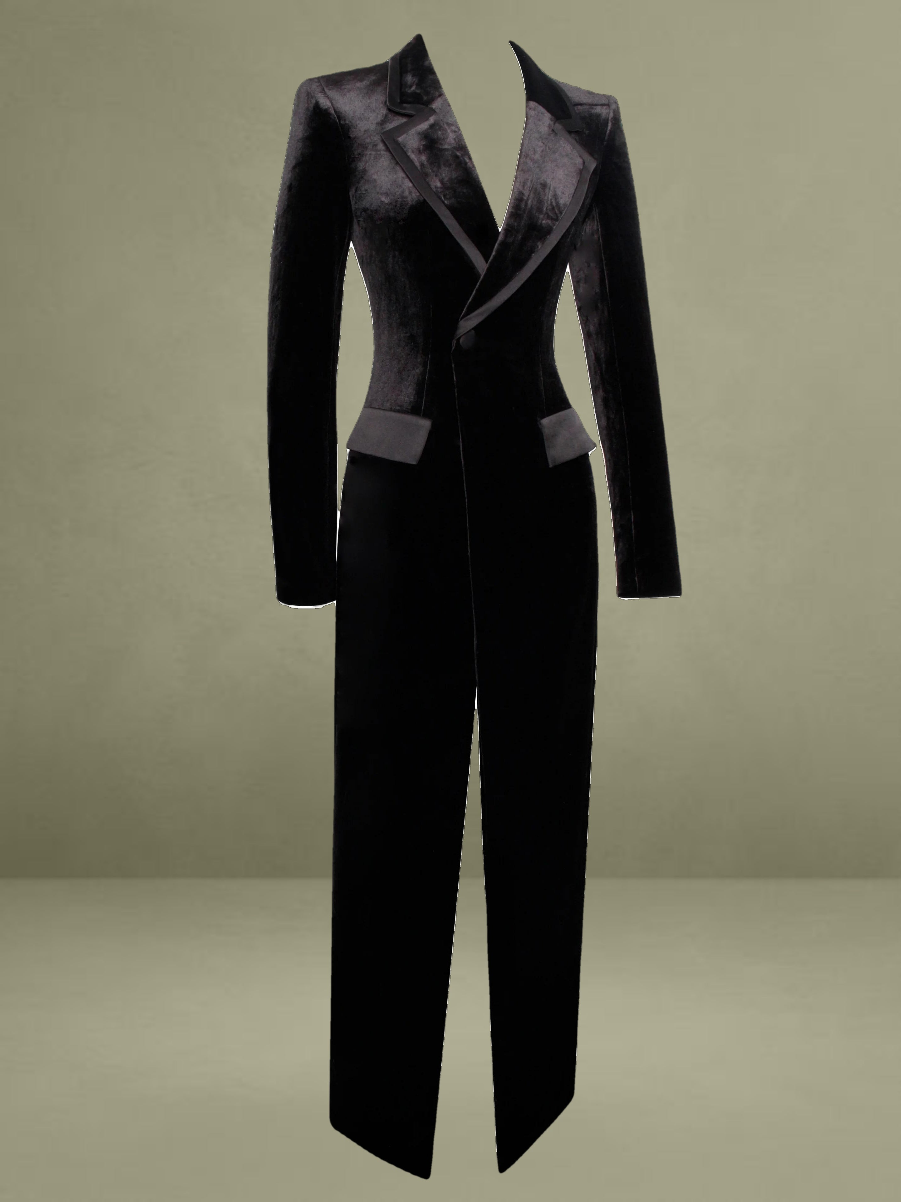 Introducing the Willow Velvet High Slit Blazer Gown Evening Coat, a striking blend of elegance and power. Crafted from luxurious black velvet, this gown exudes sophistication with its sleek, tailored blazer design. The long sleeves feature structured shoulder pads, while the luxe satin trim and pocket cap decorations add refined details. A daring high slit offers a dramatic flair, perfect for making a statement. The gown is fully lined for a smooth fit, and the front is adorned with a satin-covered button for a polished finish. Ideal for high-end events.