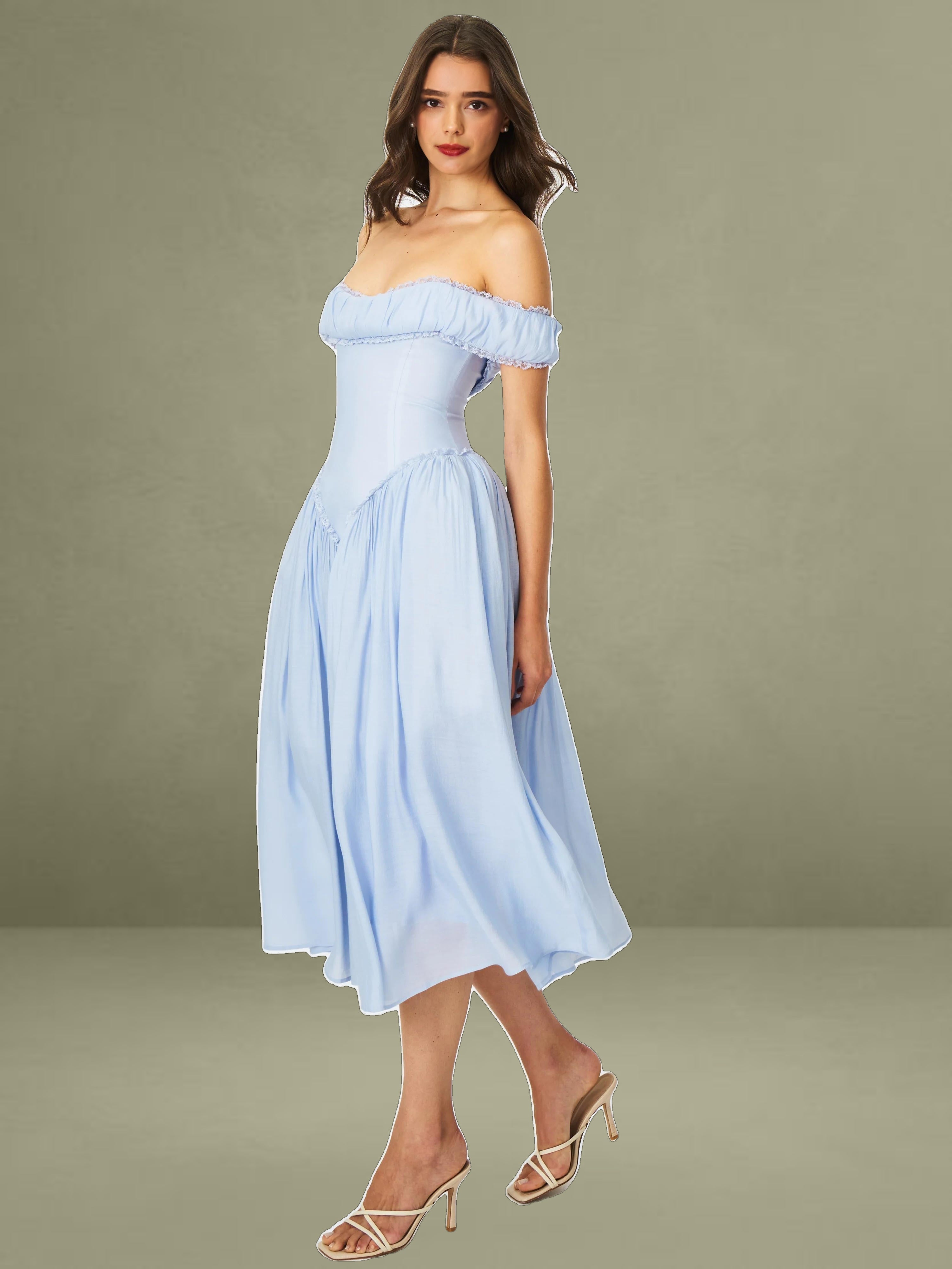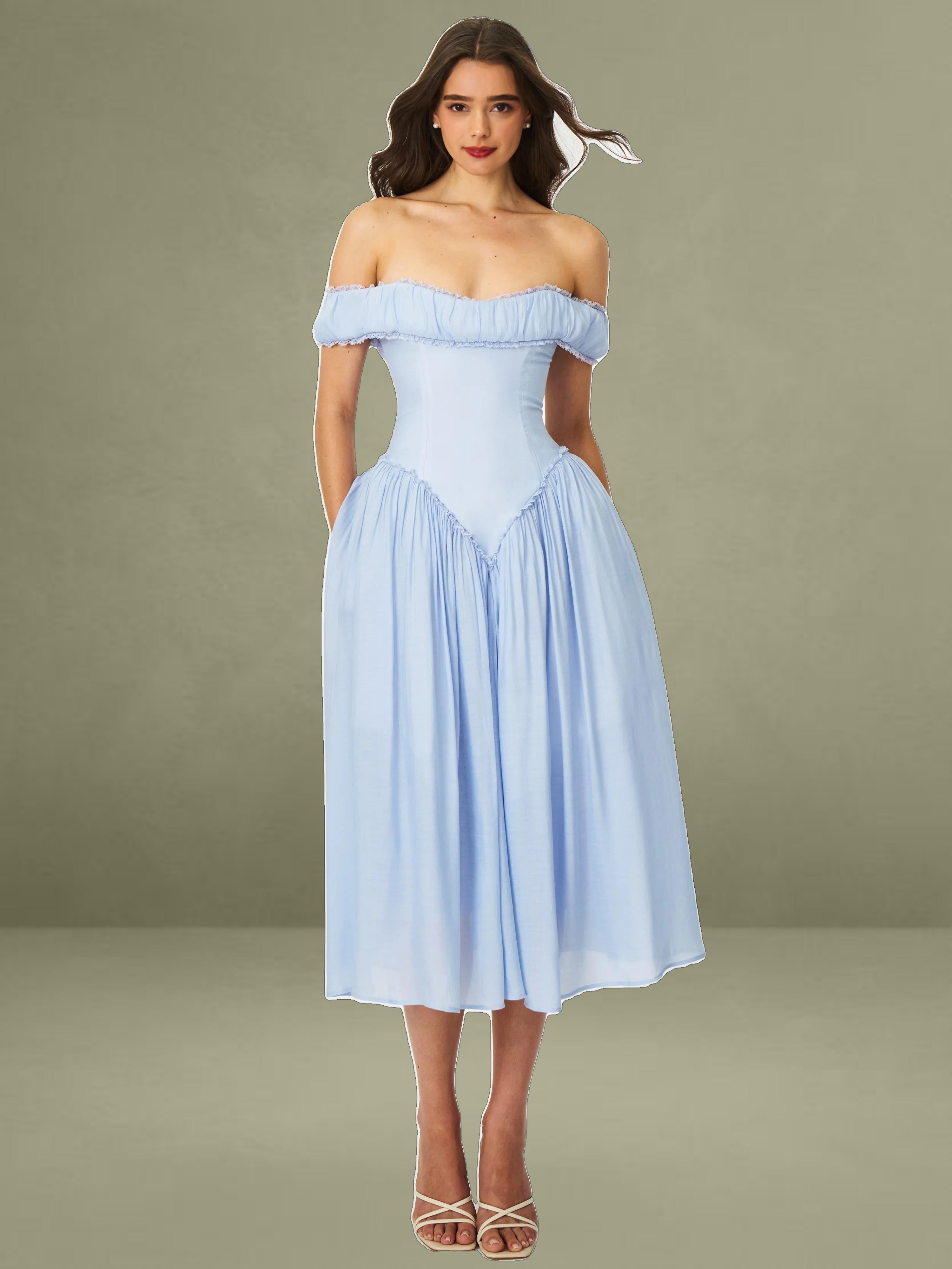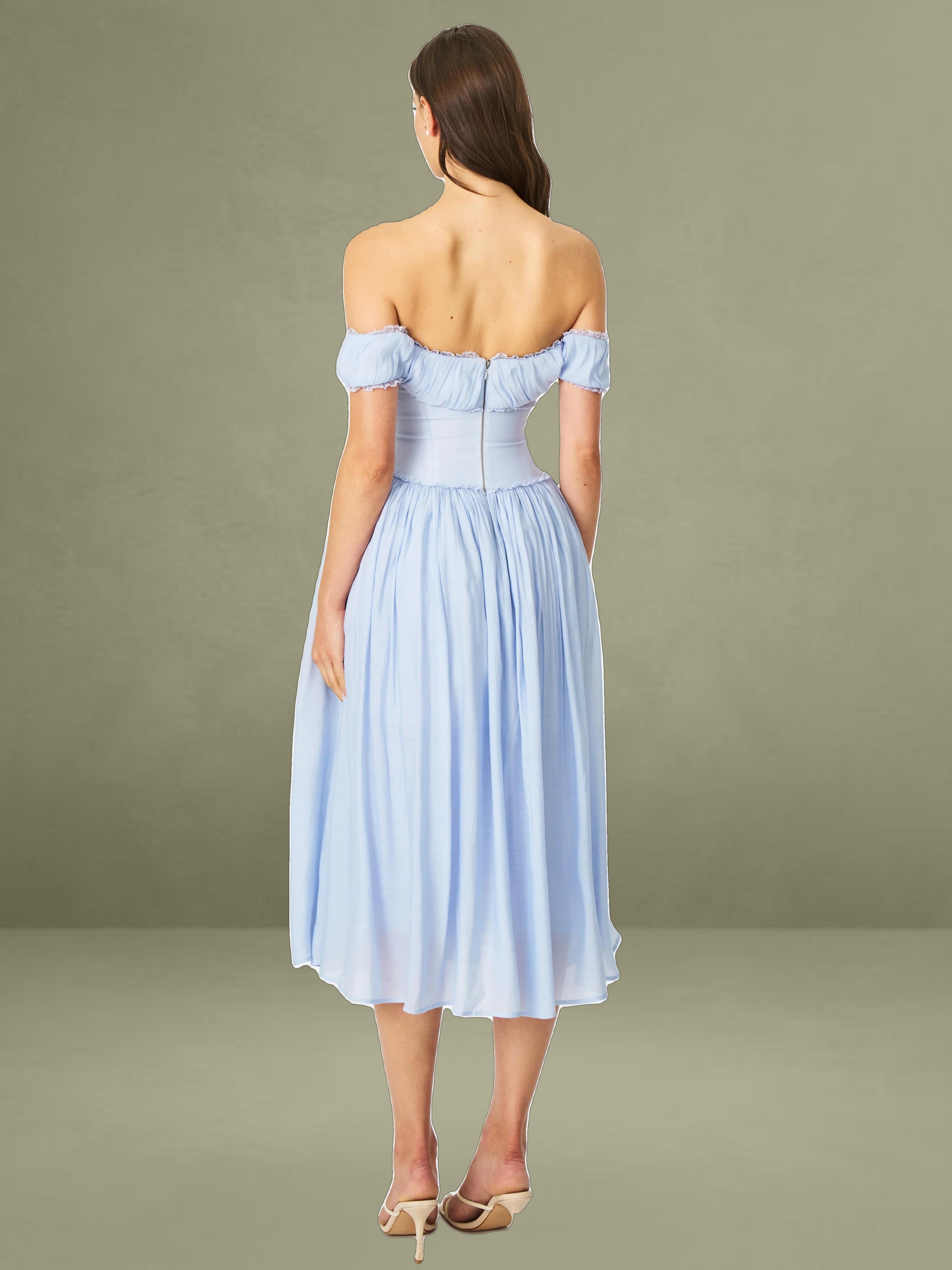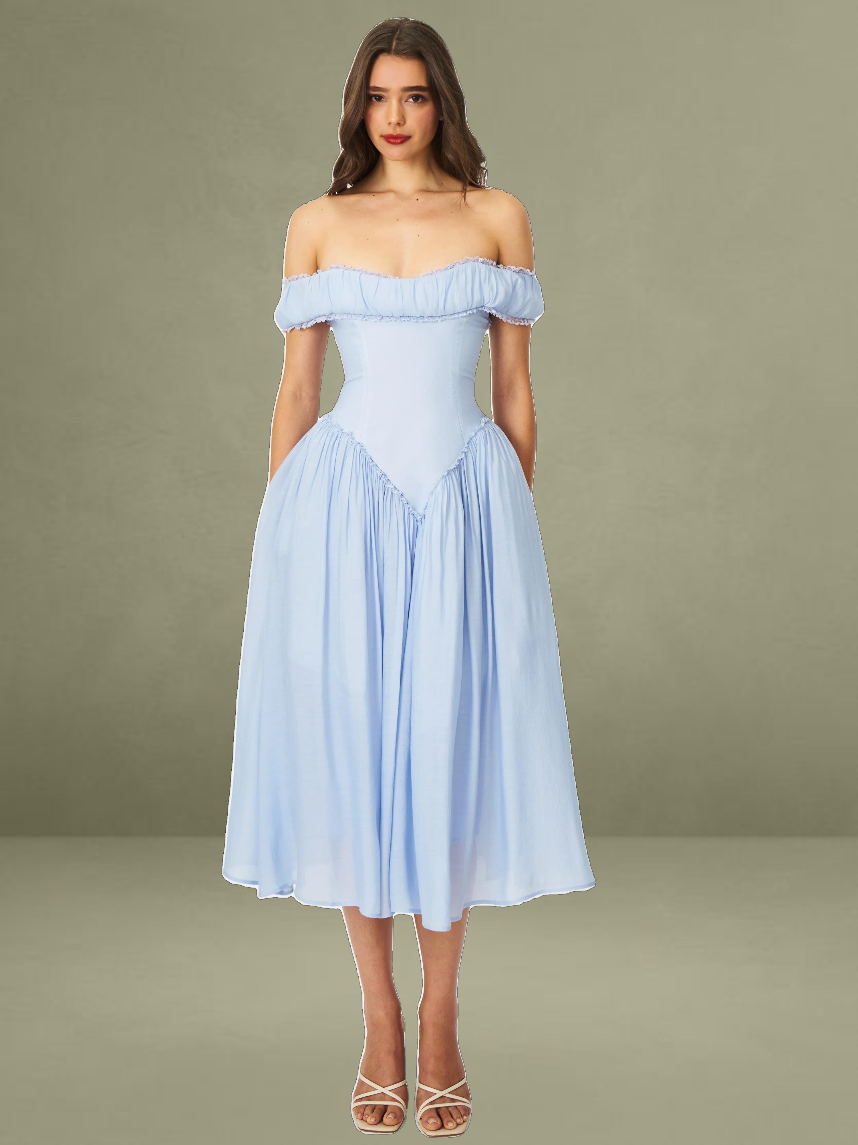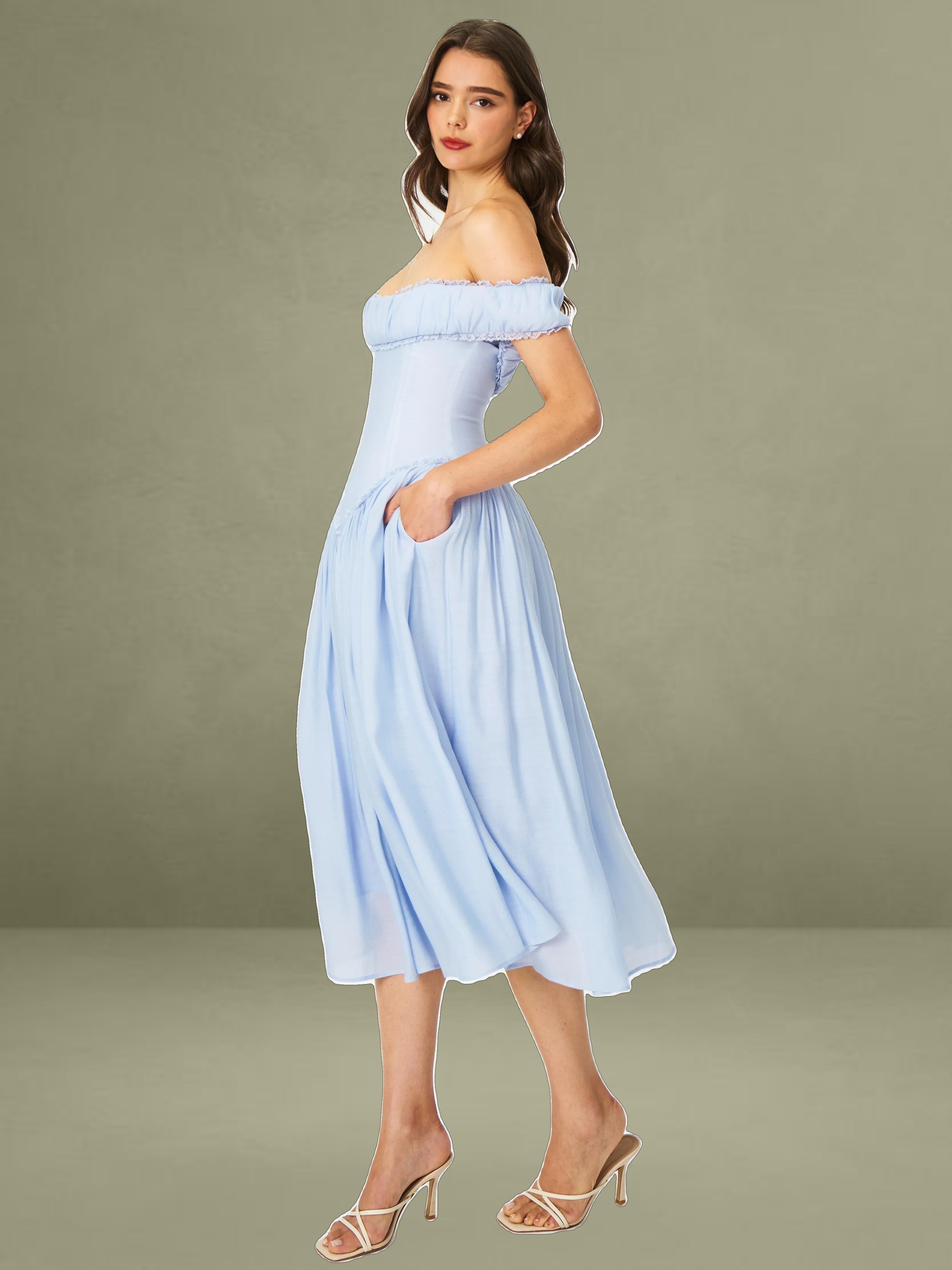 Embrace timeless elegance with the Xavy Dress in a striking baby blue hue. This off-shoulder masterpiece features a delicately ruched neckline, enhanced by intricate lace trim for a romantic touch. The V-shape drop waist flatters the figure, while a built-in corset and hidden tulle support sculpt the silhouette with grace. Fully lined with an invisible zipper and discreet side pockets, the Xavy Dress is both polished and practical—perfect for weddings, formal events, or any moment worth celebrating. And it's also available in Teal Green.