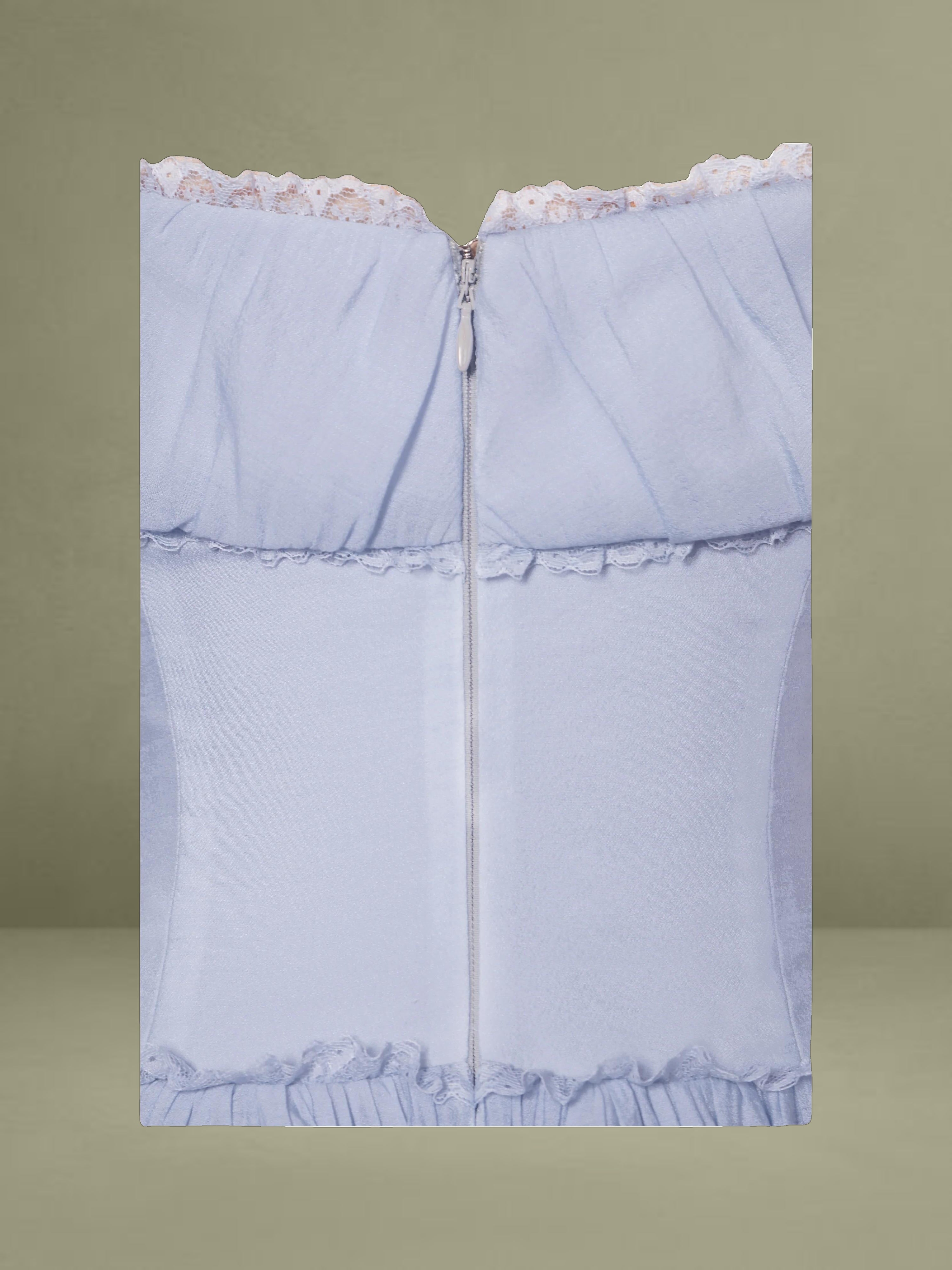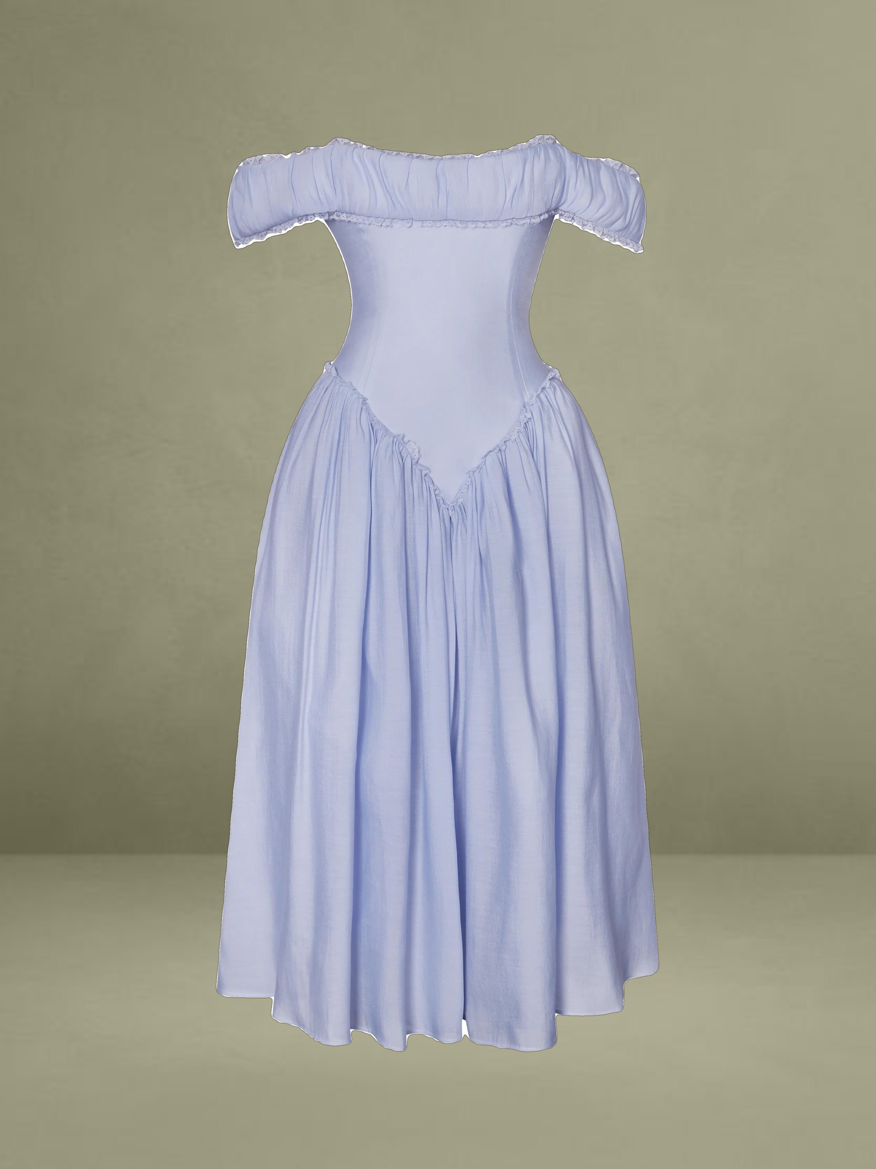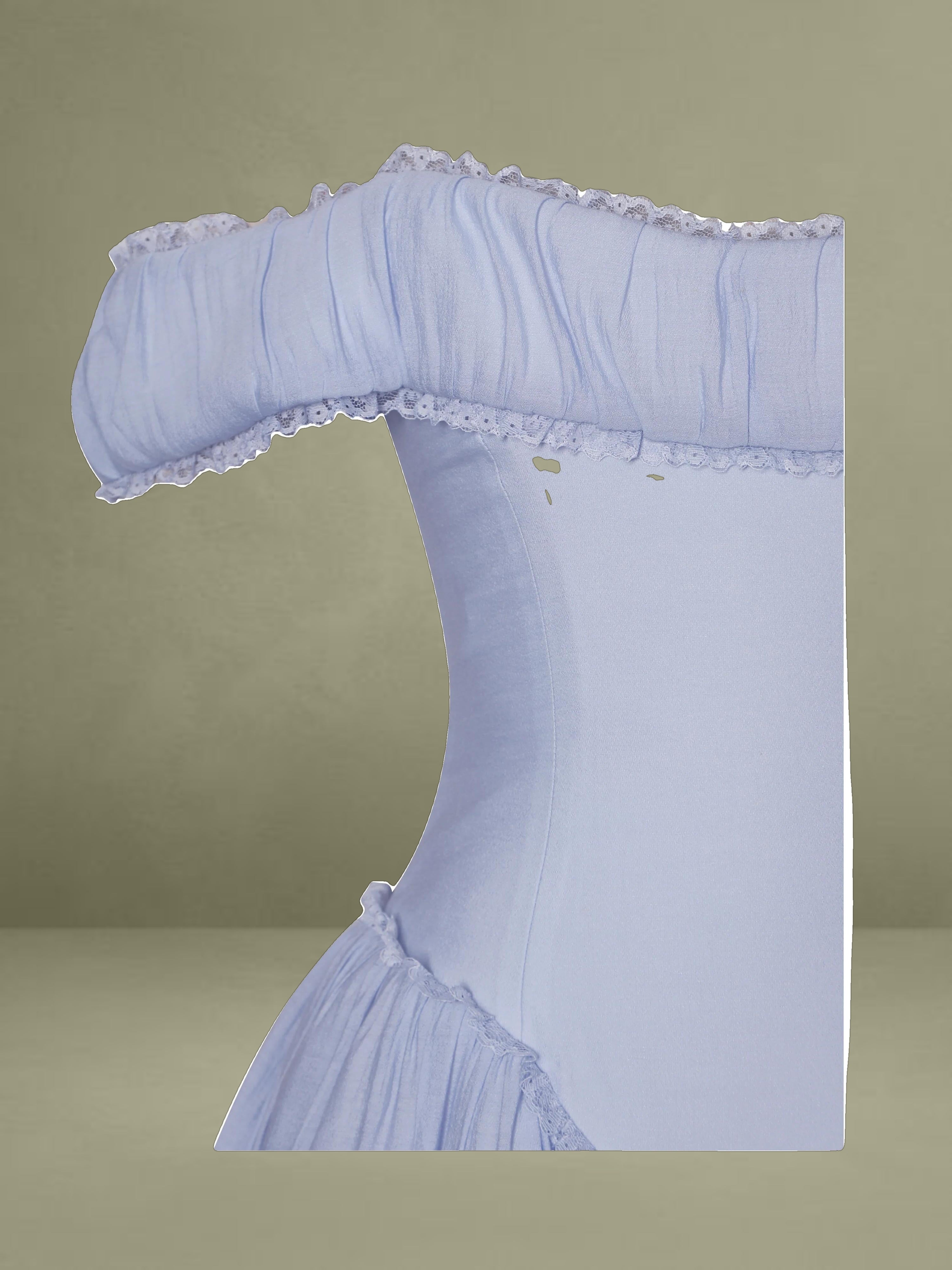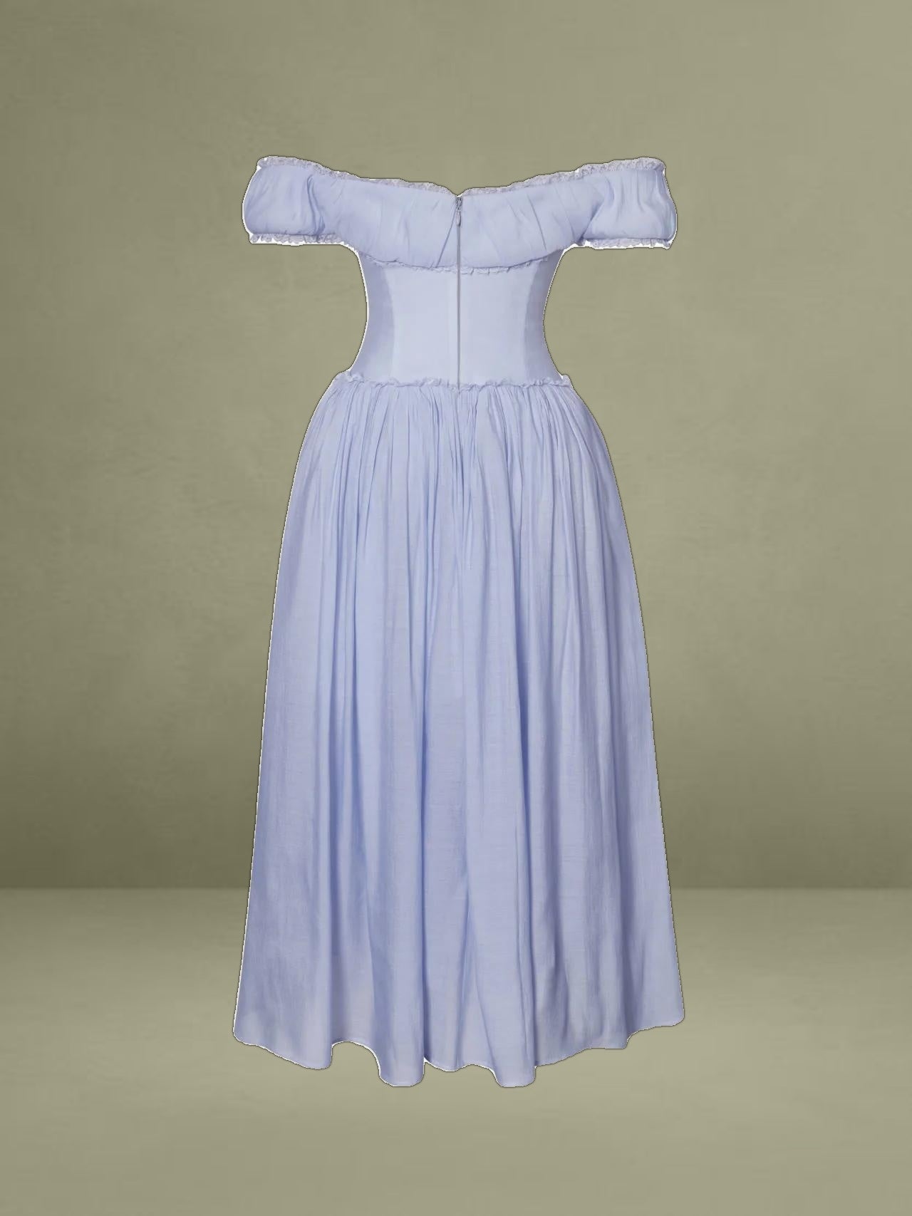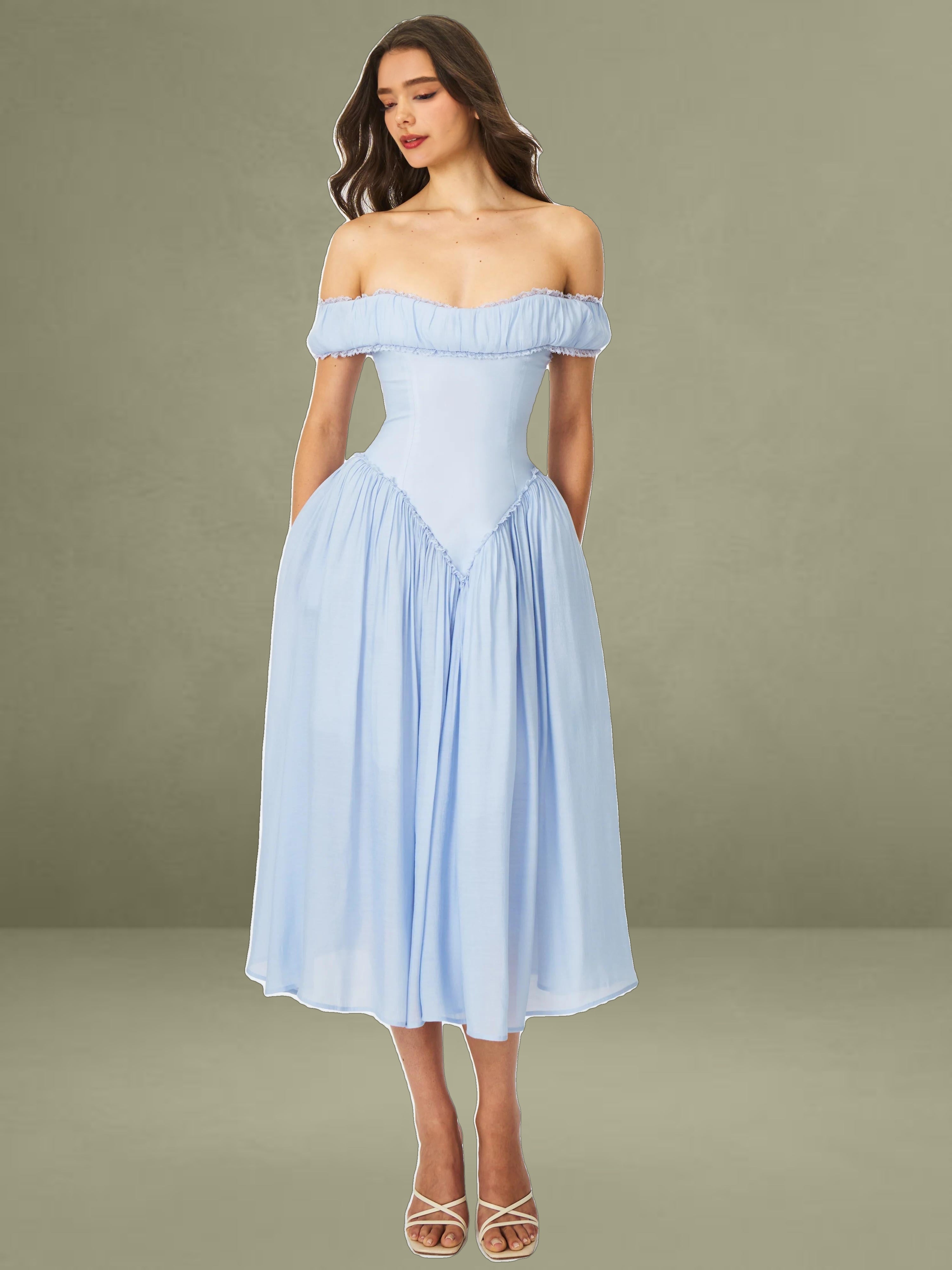 Embrace timeless elegance with the Xavy Dress in a striking baby blue hue. This off-shoulder masterpiece features a delicately ruched neckline, enhanced by intricate lace trim for a romantic touch. The V-shape drop waist flatters the figure, while a built-in corset and hidden tulle support sculpt the silhouette with grace. Fully lined with an invisible zipper and discreet side pockets, the Xavy Dress is both polished and practical—perfect for weddings, formal events, or any moment worth celebrating. And it's also available in Teal Green.