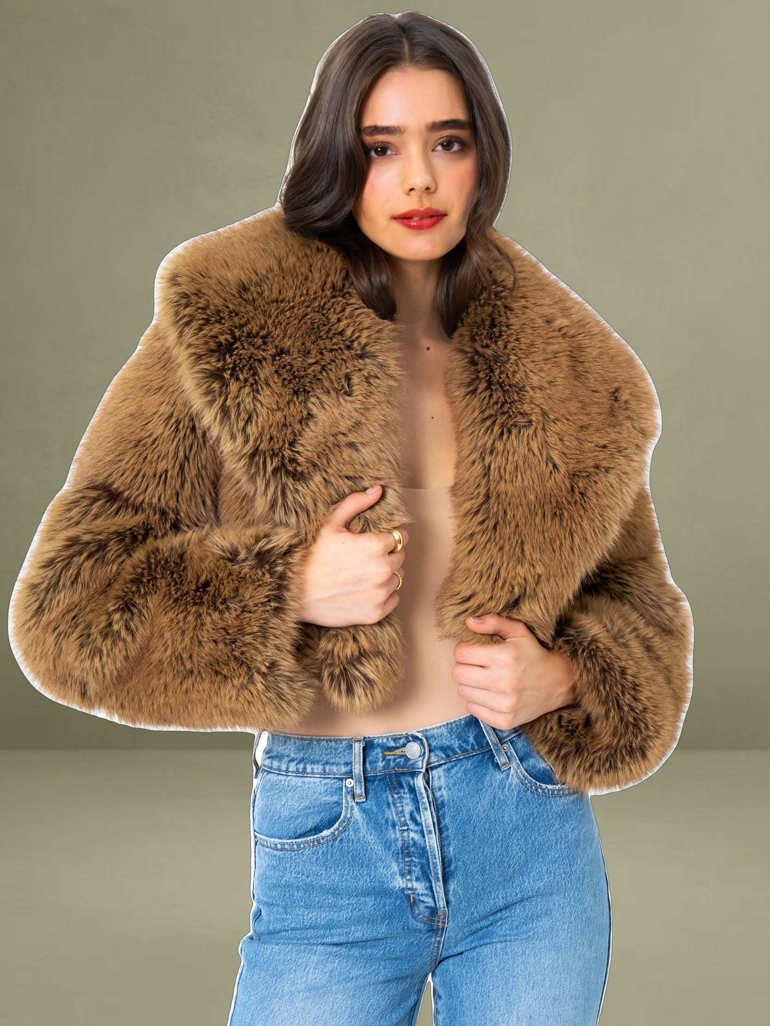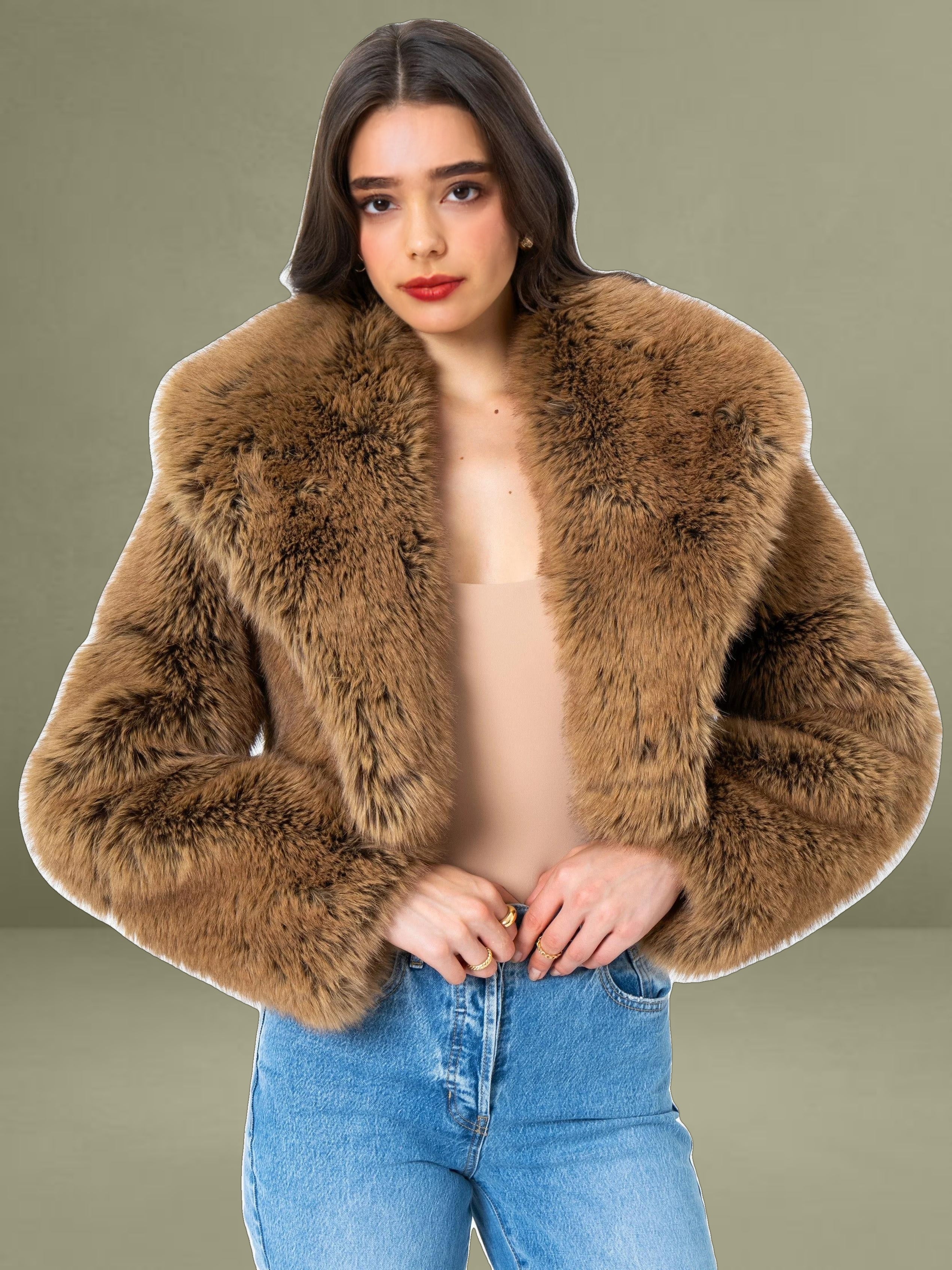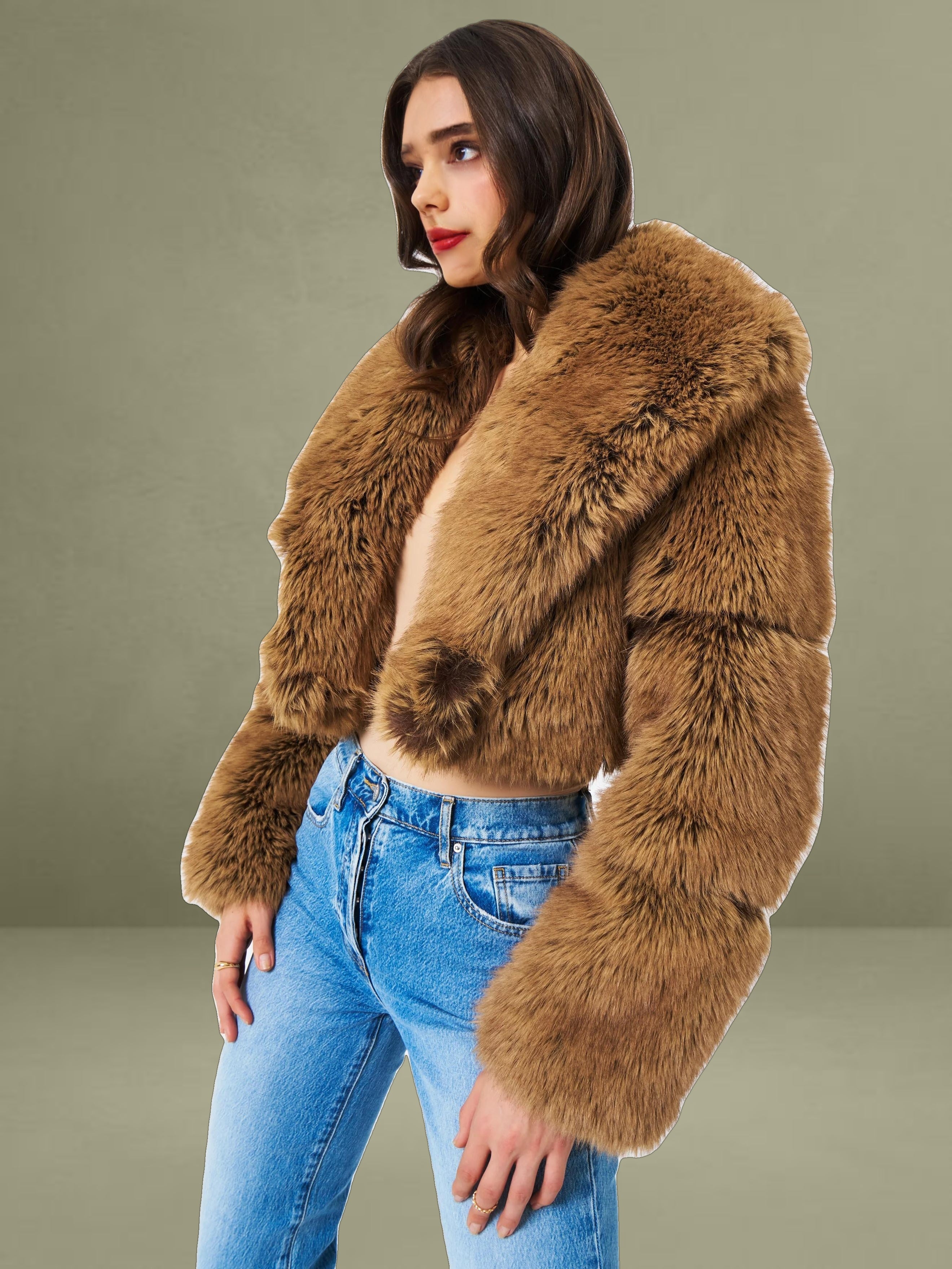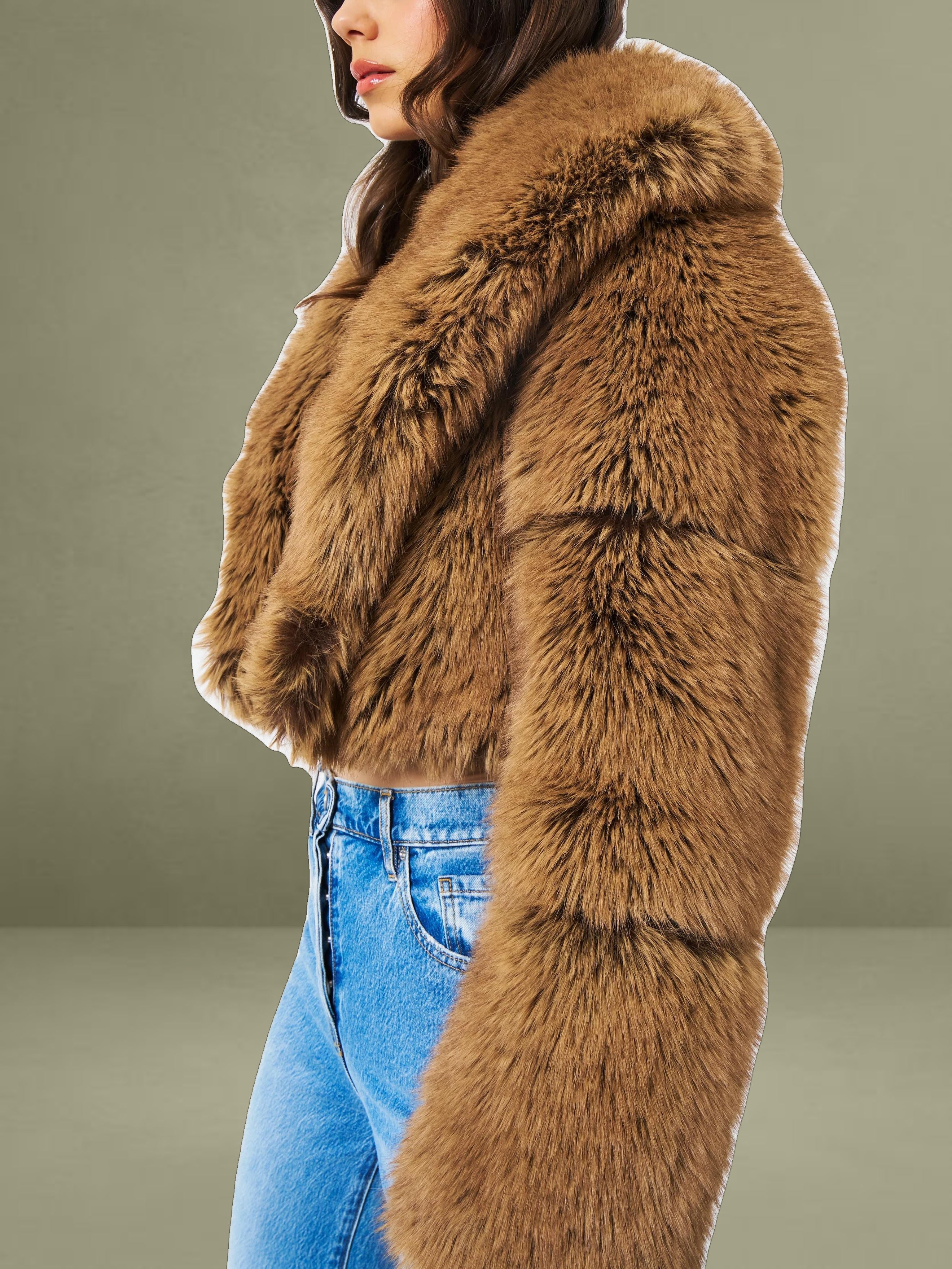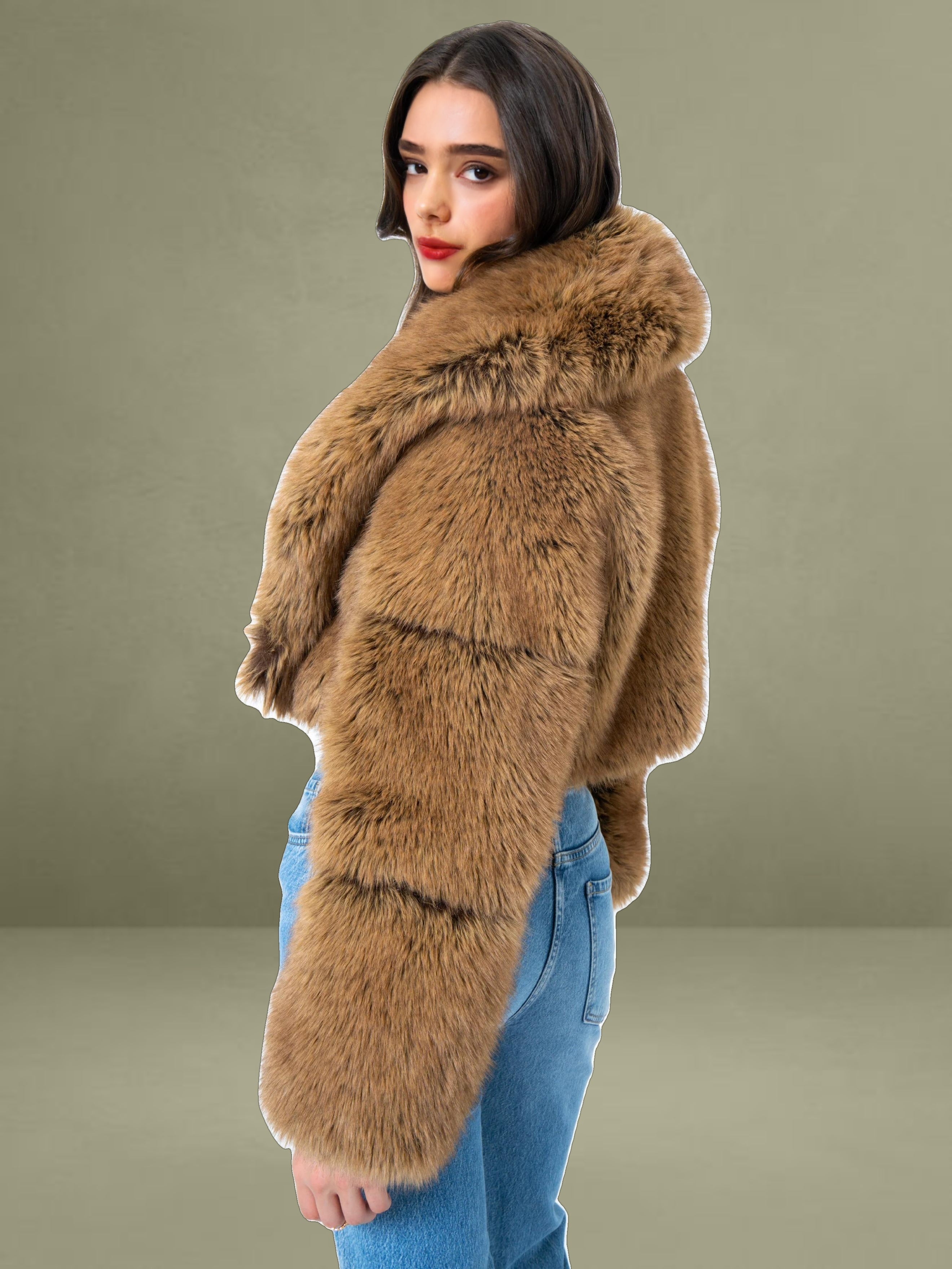 Introducing the Yadavi Cropped Jacket, a bold and luxurious piece perfect for colder seasons. This stunning jacket features brown vegan fur with a contrasting black inner layer, creating a rich, dimensional look. The statement large fur collar adds an extra touch of elegance, while the unique three-tiered segmented long sleeves offer a stylish, modern twist. Fully lined for comfort and warmth, this jacket is a must-have for those looking to stay cozy while making a fashion statement.