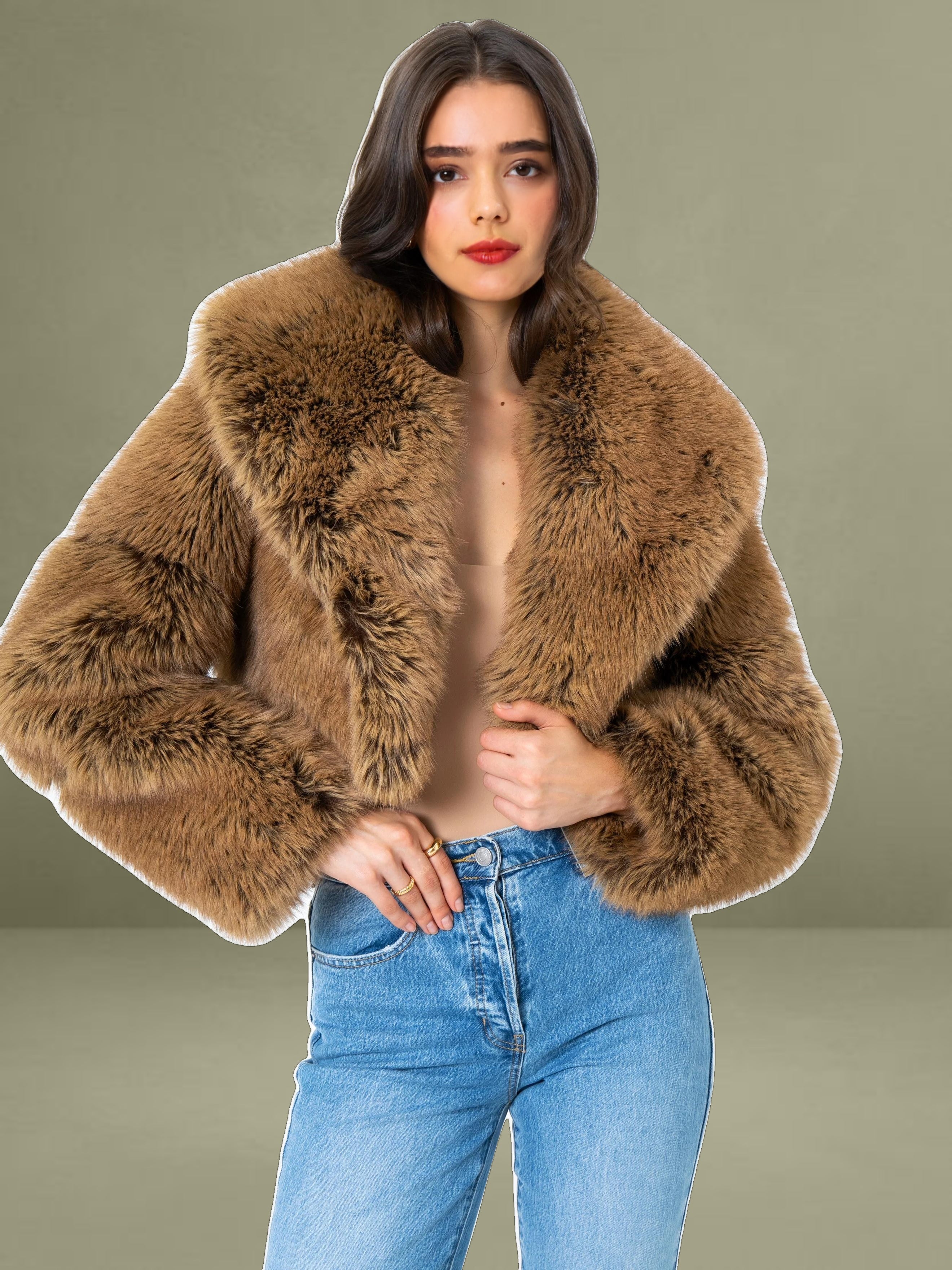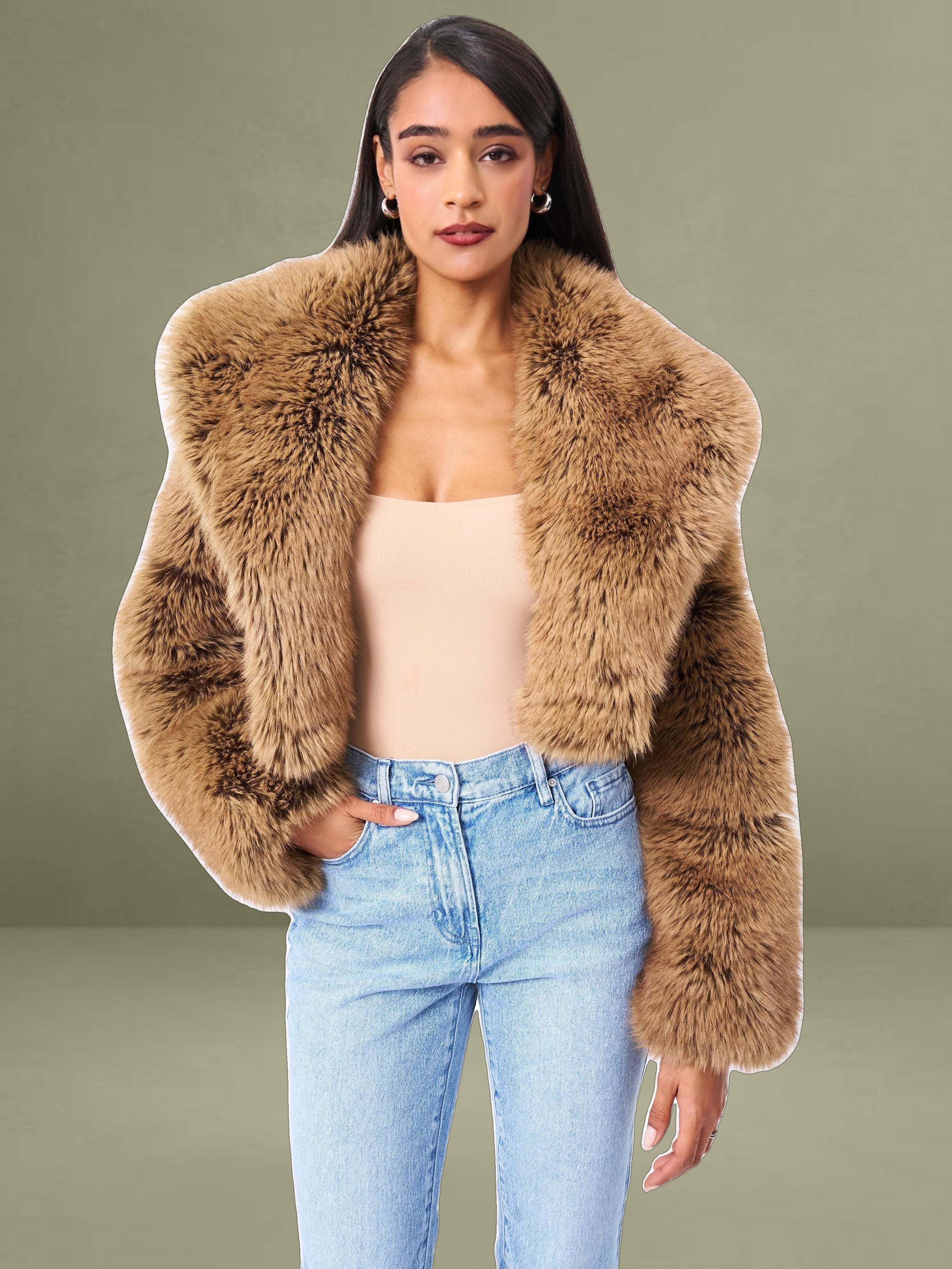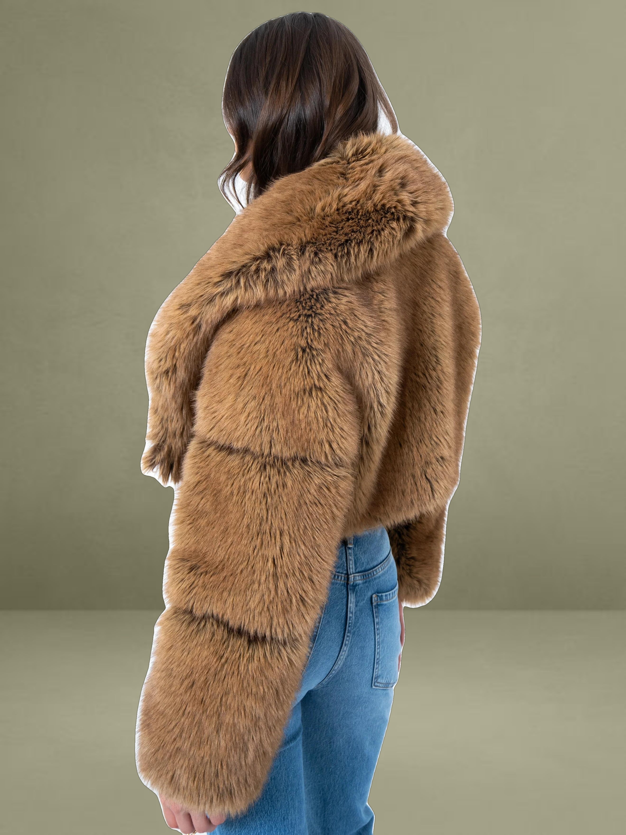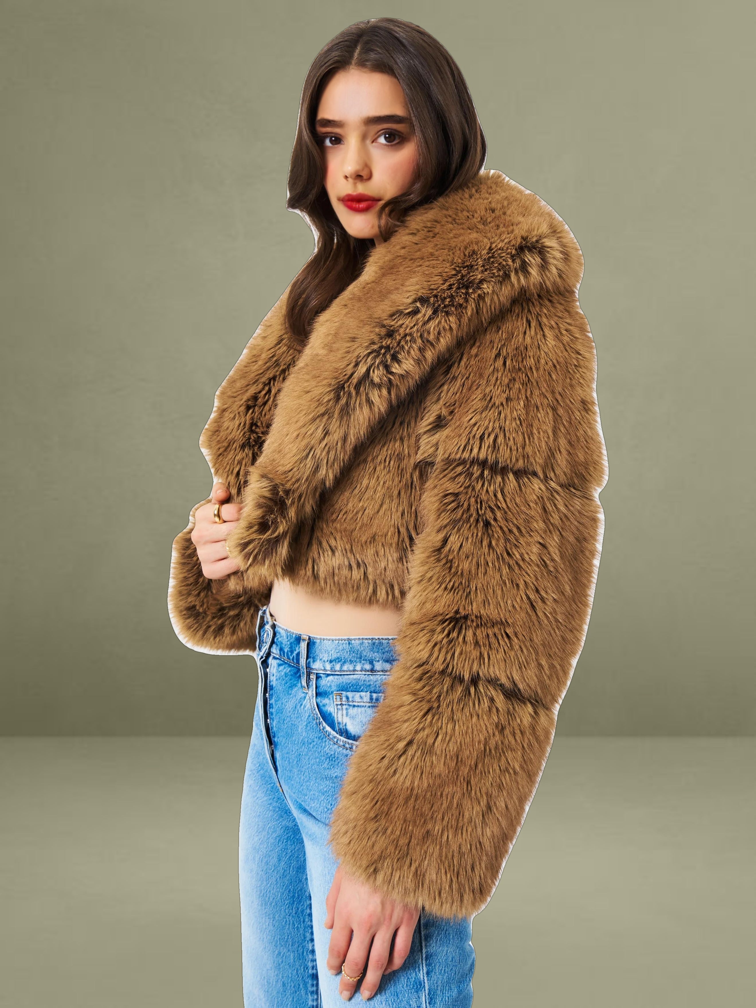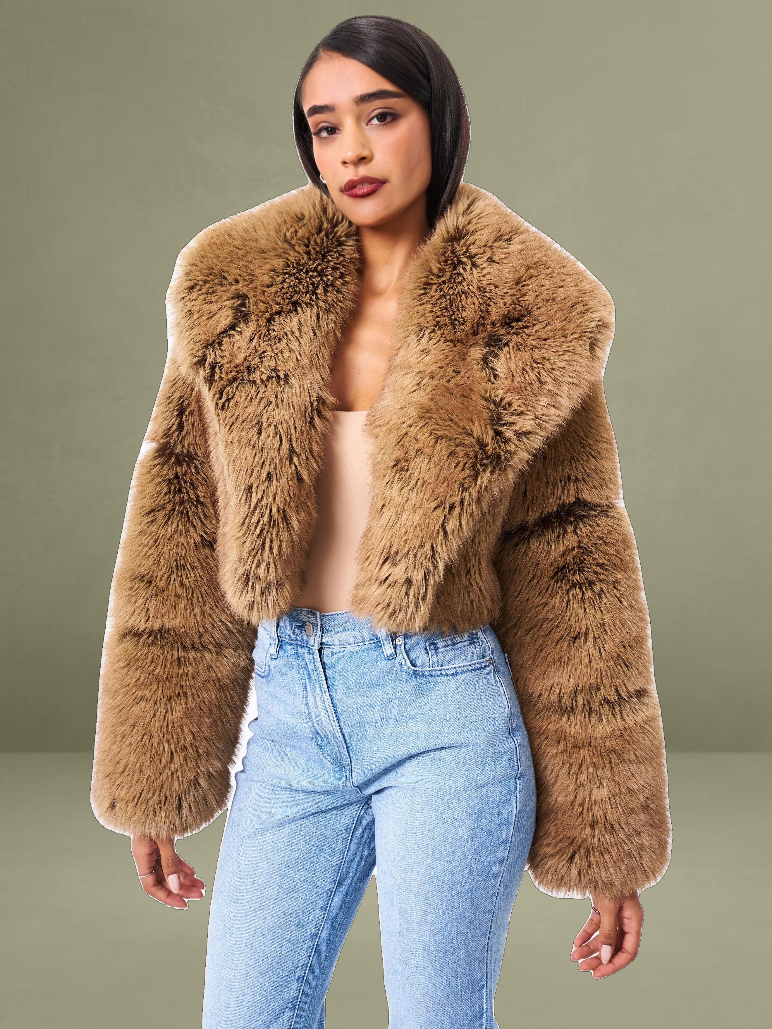 Introducing the Yadavi Cropped Jacket, a bold and luxurious piece perfect for colder seasons. This stunning jacket features brown vegan fur with a contrasting black inner layer, creating a rich, dimensional look. The statement large fur collar adds an extra touch of elegance, while the unique three-tiered segmented long sleeves offer a stylish, modern twist. Fully lined for comfort and warmth, this jacket is a must-have for those looking to stay cozy while making a fashion statement.