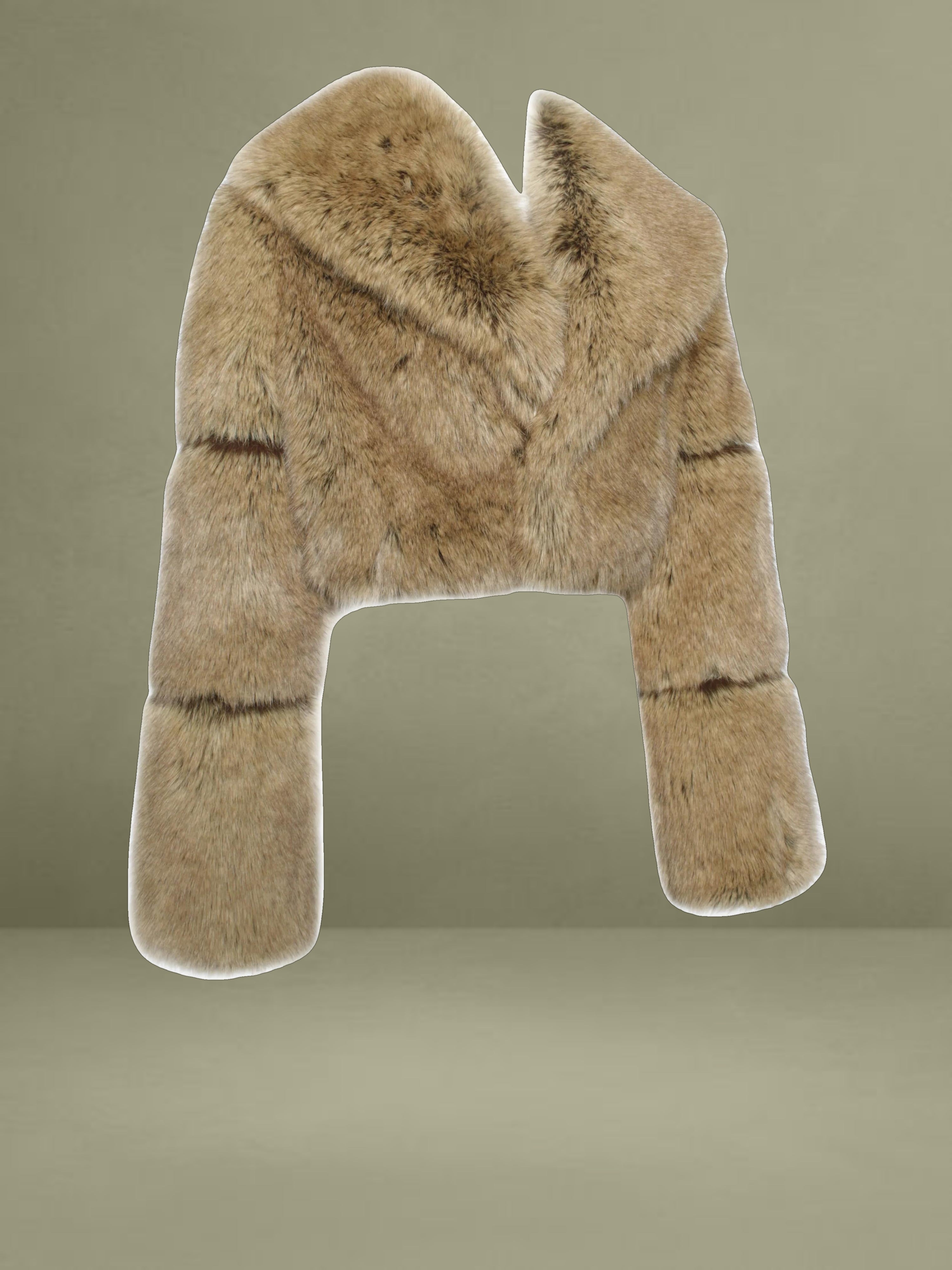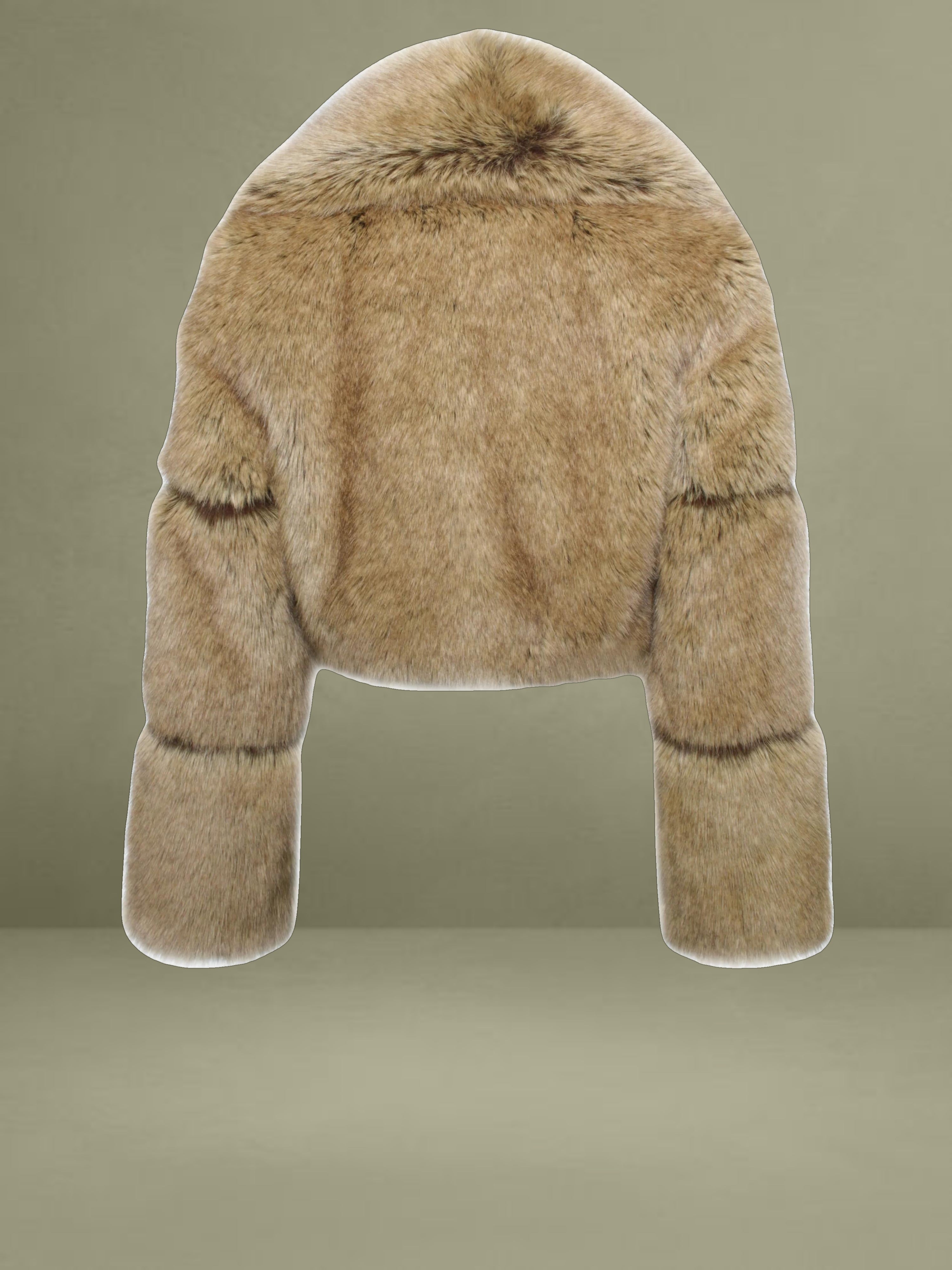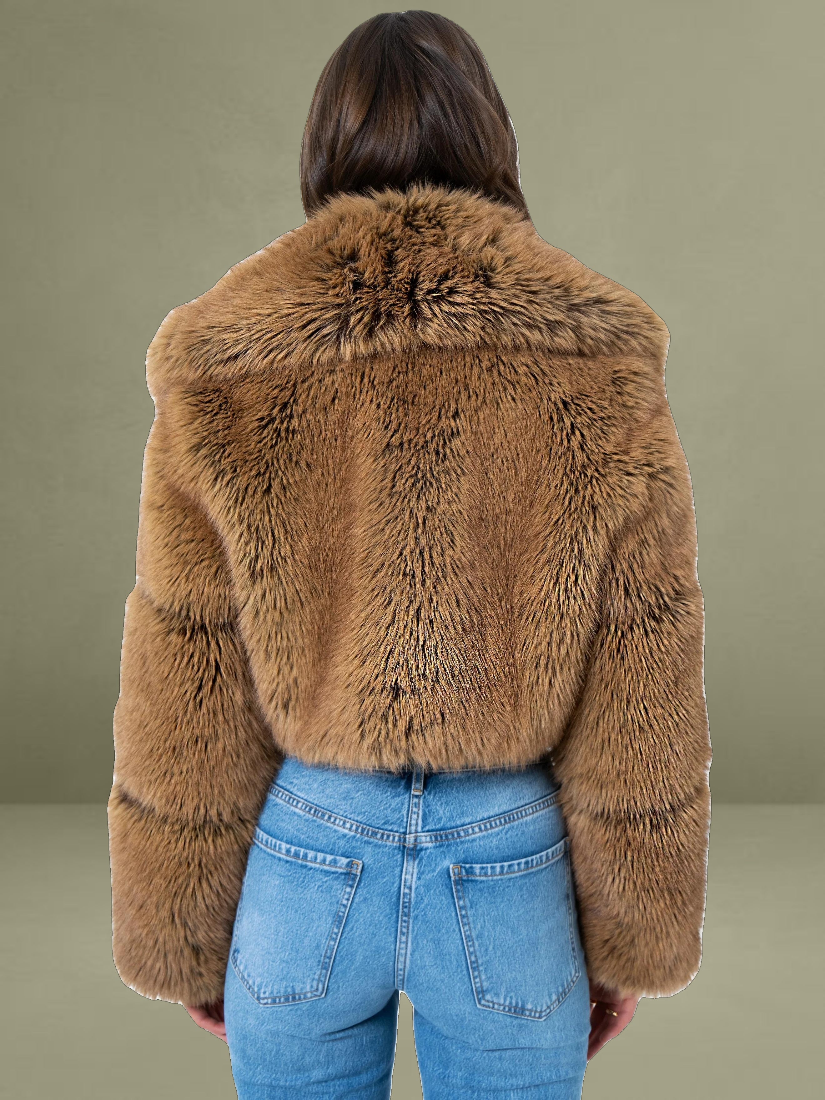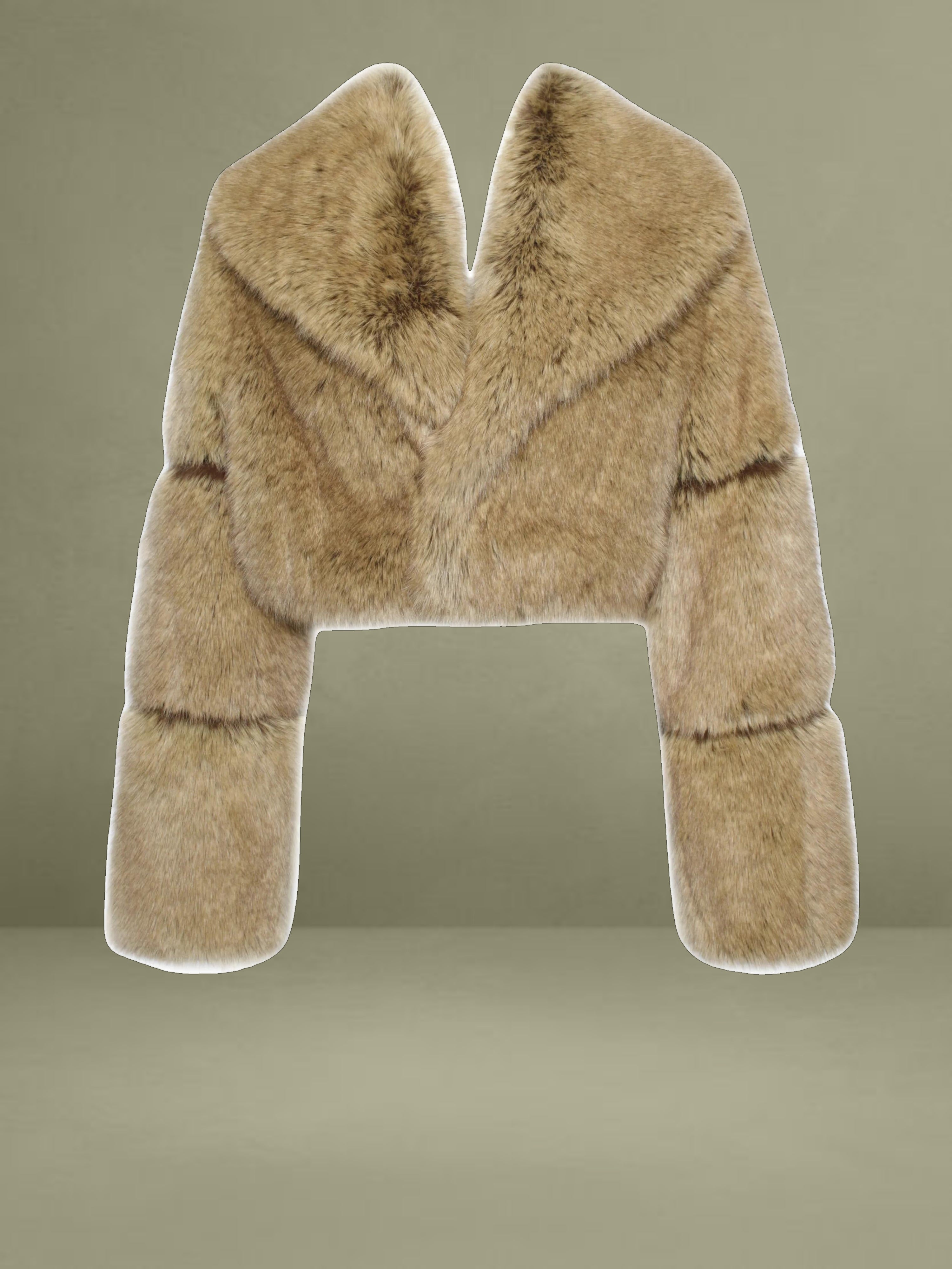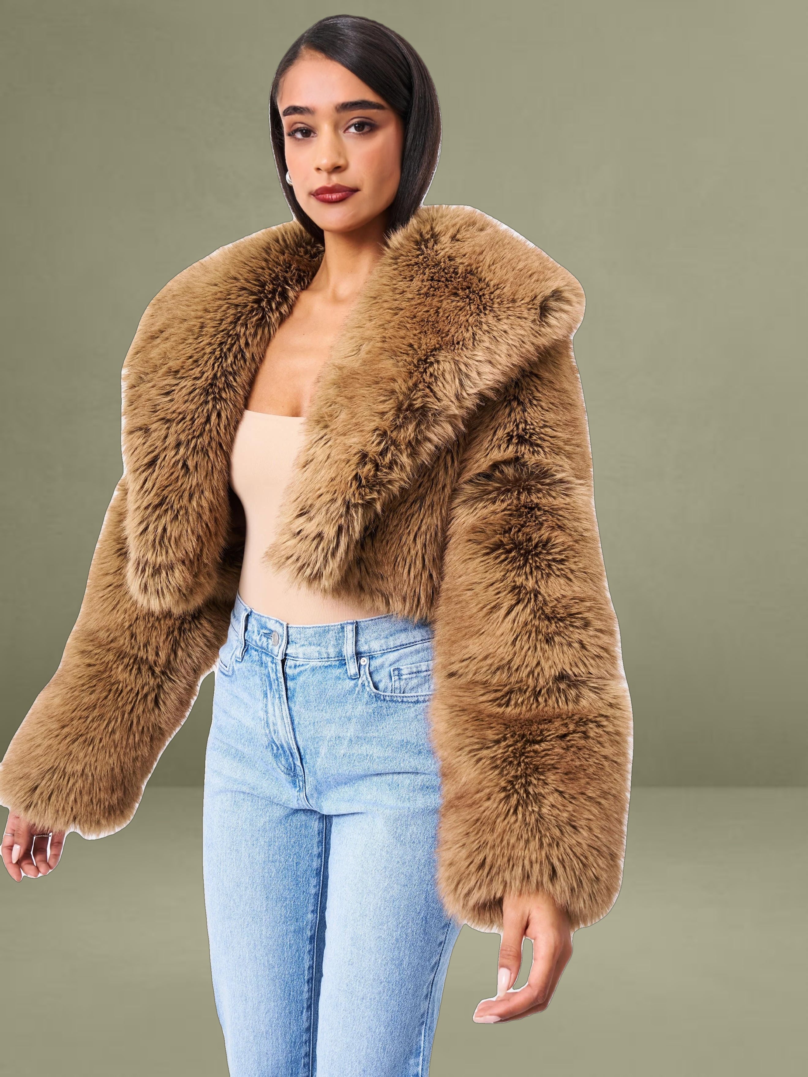 Introducing the Yadavi Cropped Jacket, a bold and luxurious piece perfect for colder seasons. This stunning jacket features brown vegan fur with a contrasting black inner layer, creating a rich, dimensional look. The statement large fur collar adds an extra touch of elegance, while the unique three-tiered segmented long sleeves offer a stylish, modern twist. Fully lined for comfort and warmth, this jacket is a must-have for those looking to stay cozy while making a fashion statement.