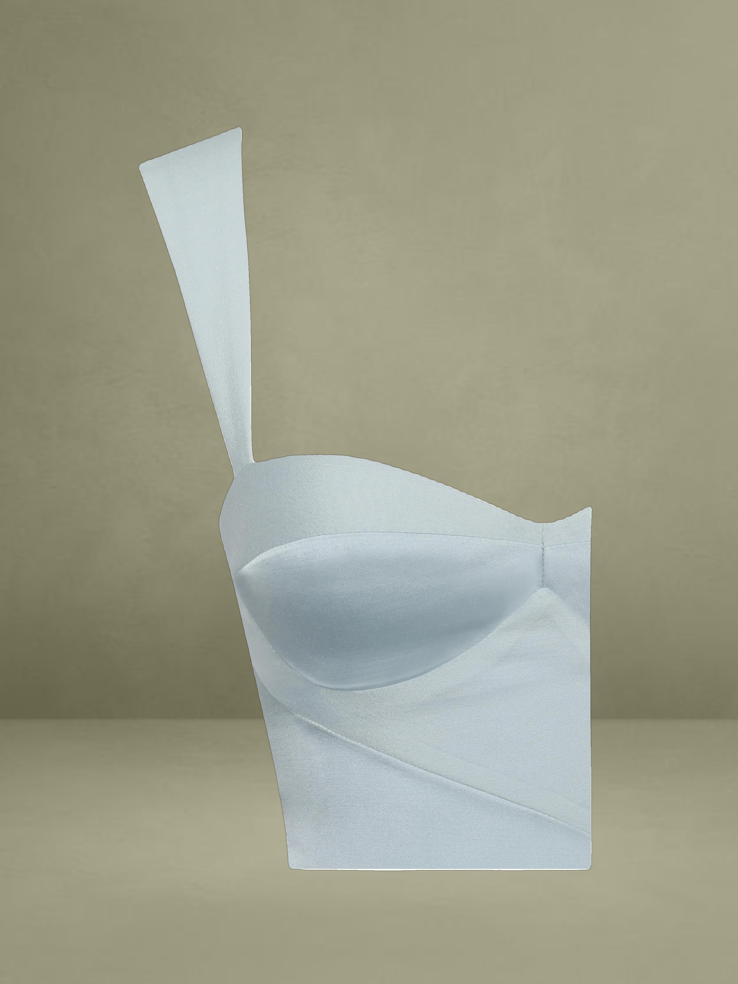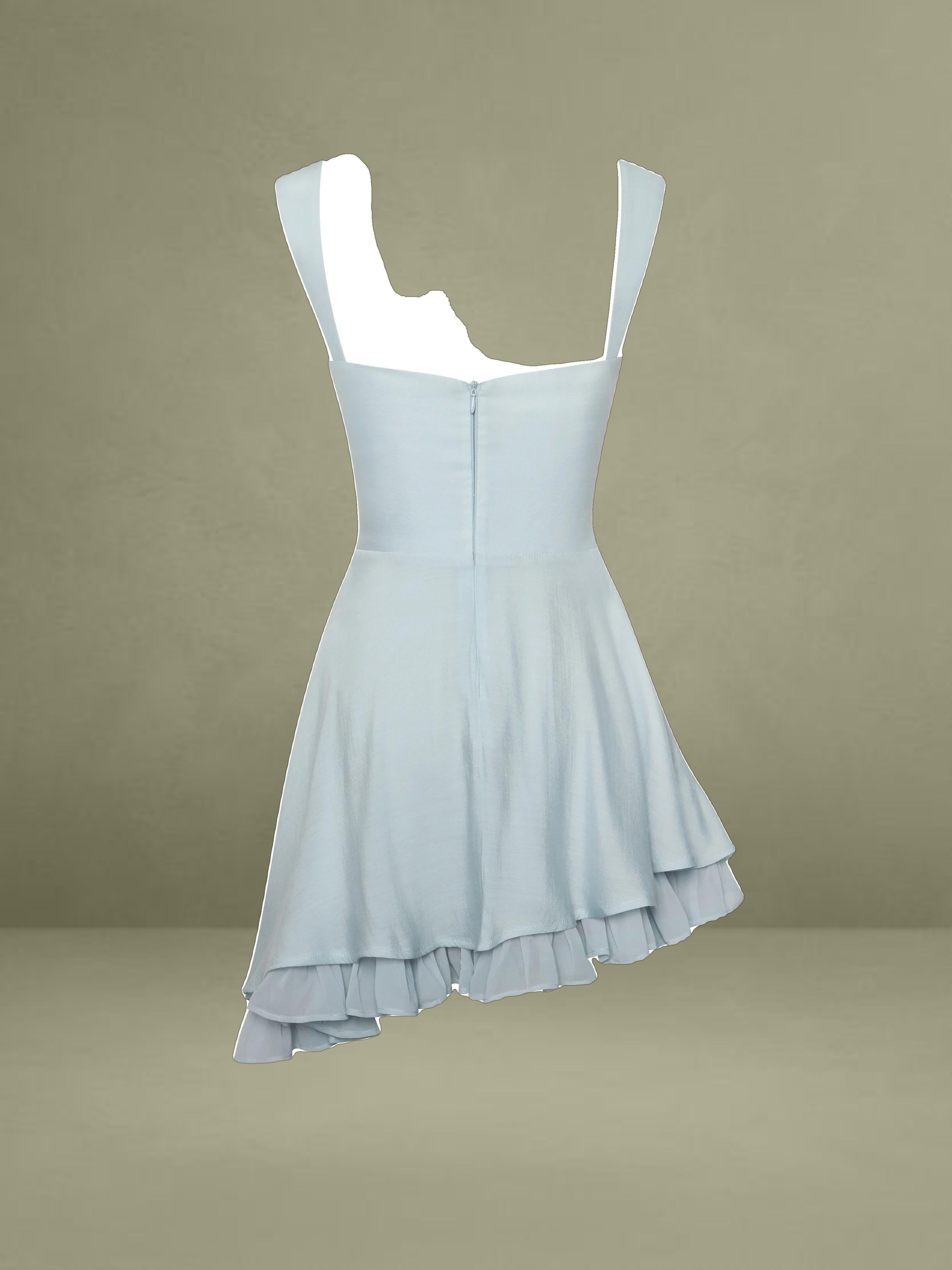Charming yet unexpected, the Yaffa Dress brings structured playfulness to a delicate silhouette. Crafted in a soft baby blue hue, this asymmetrical mini features sharp angular seams that contour the body from every angle, flaring into a graceful A-line finish. A pleated chiffon underskirt peeks beneath the hem, adding movement and volume with every step. Built-in cups and a flattering sweetheart neckline with tapered straps offer both support and softness. Finished with an invisible back zipper, this dress is your go-to for rooftop brunches, art gallery dates, or any occasion that calls for a little flirty finesse and flair.