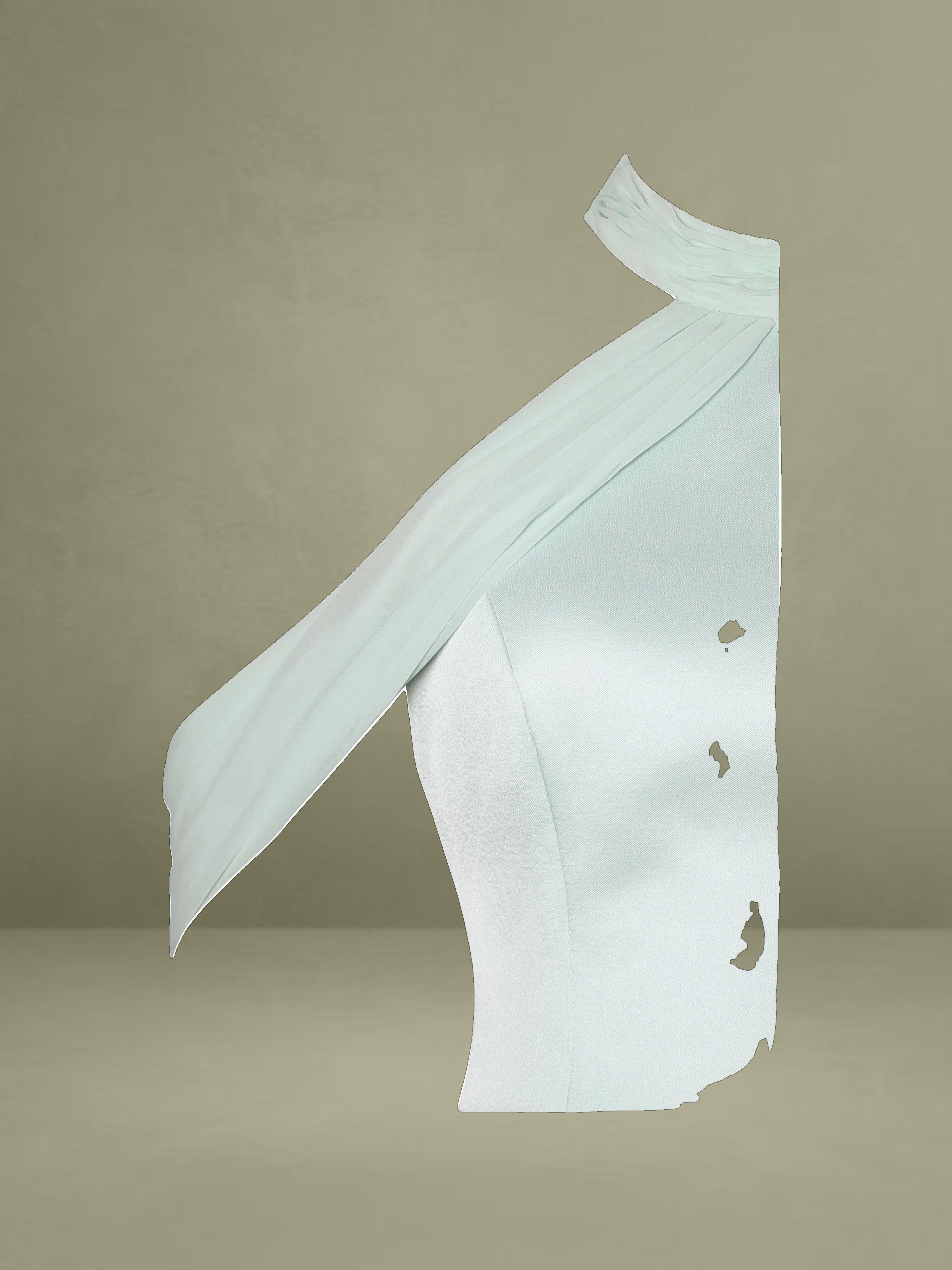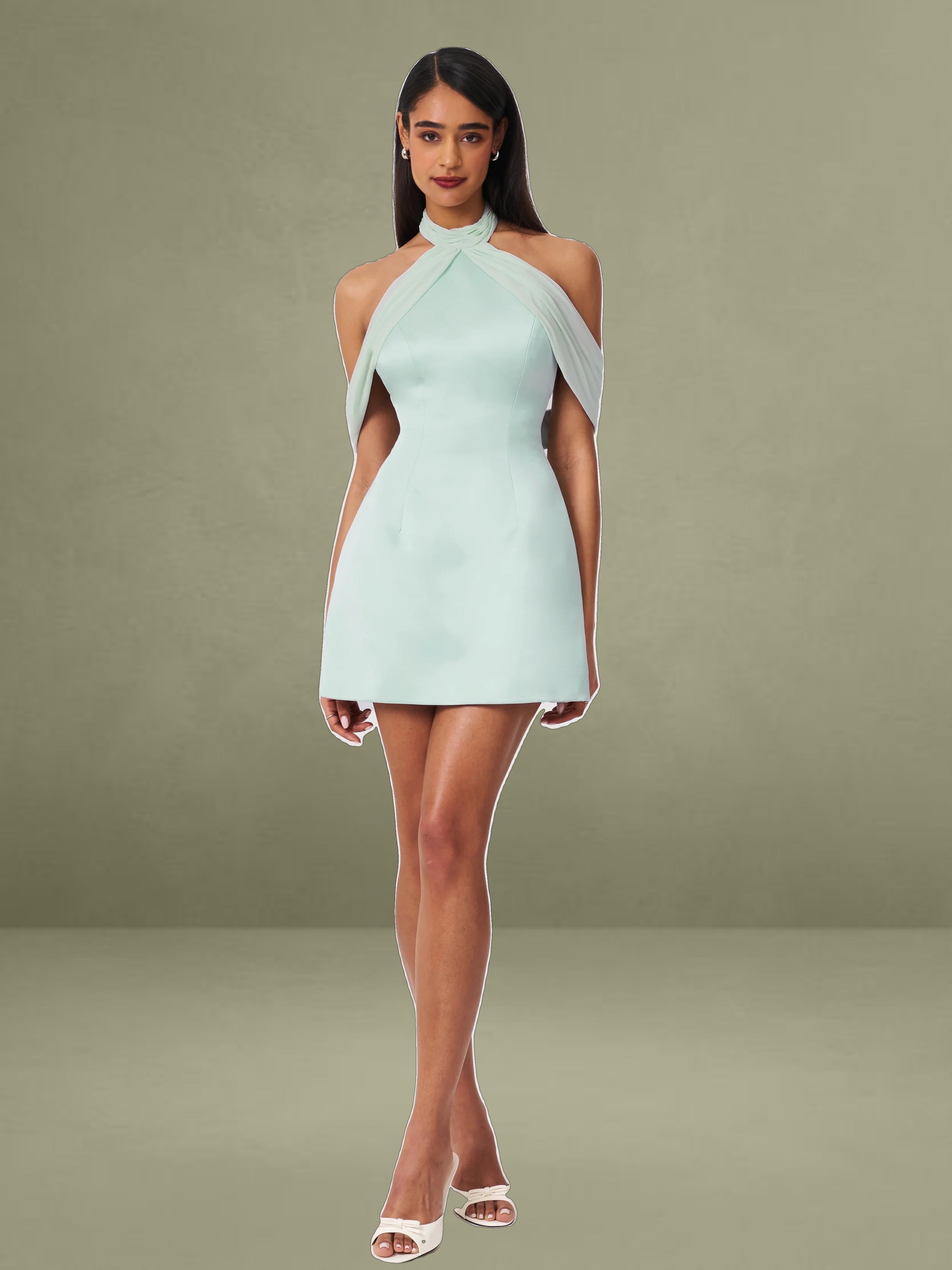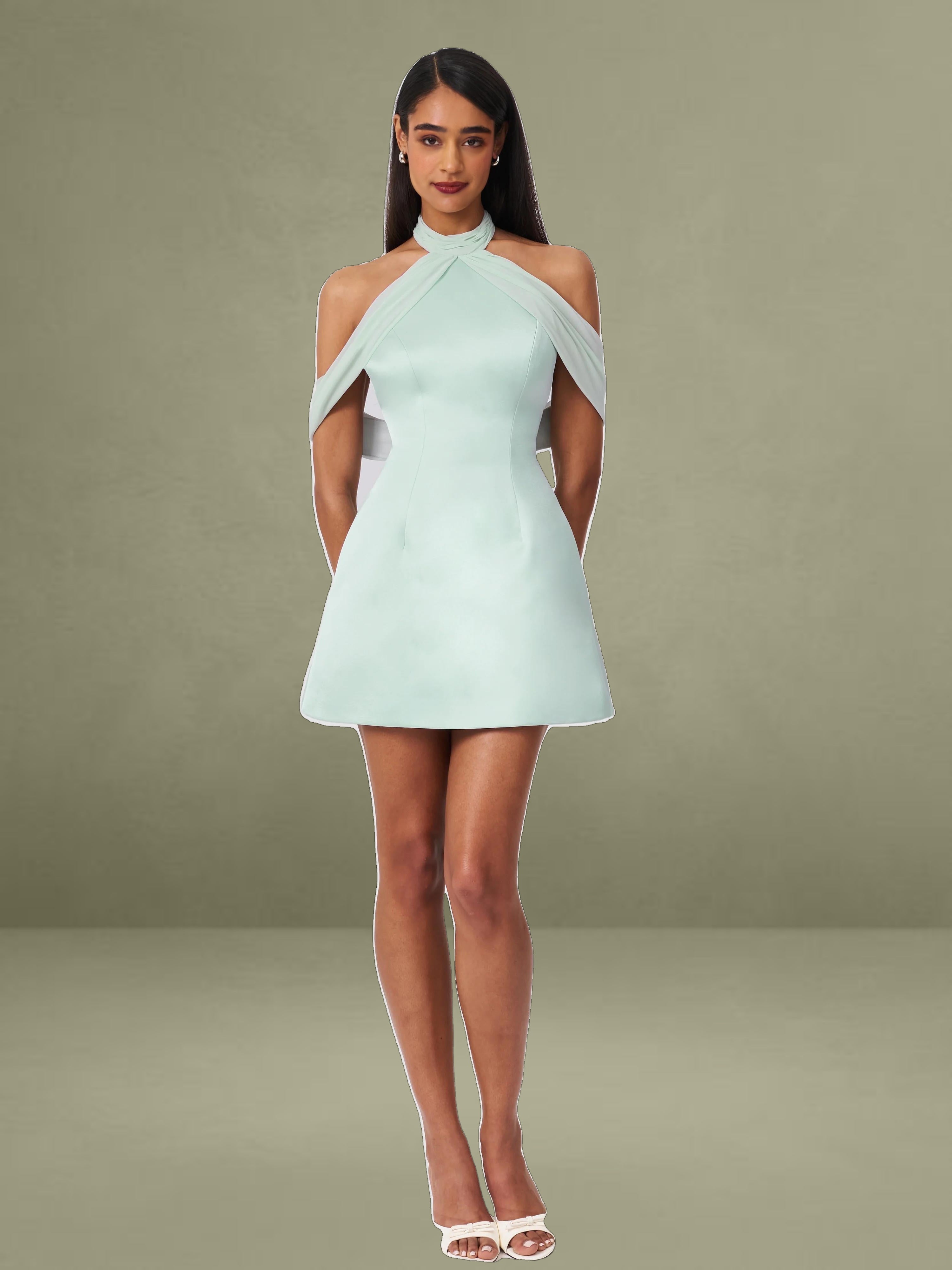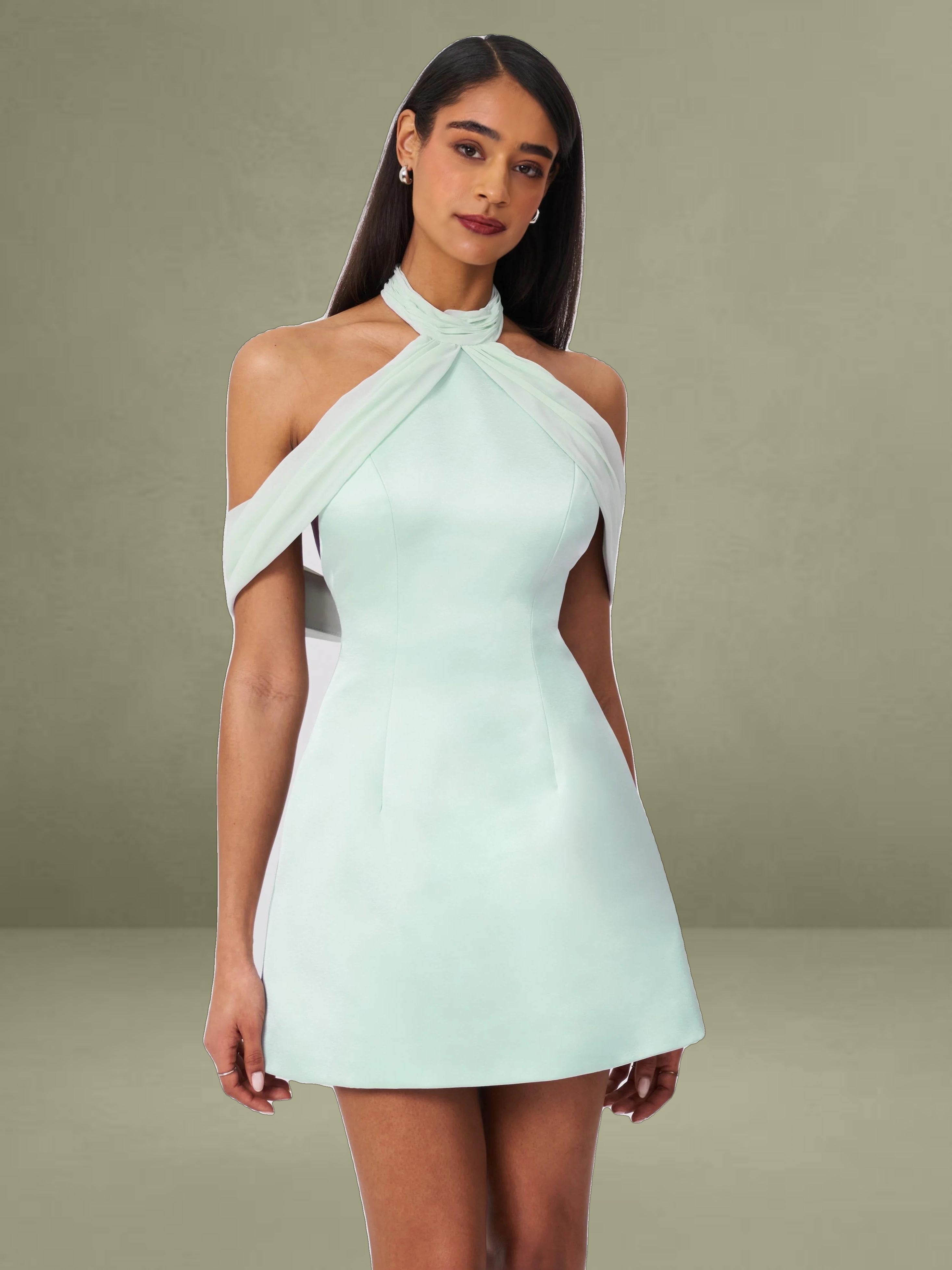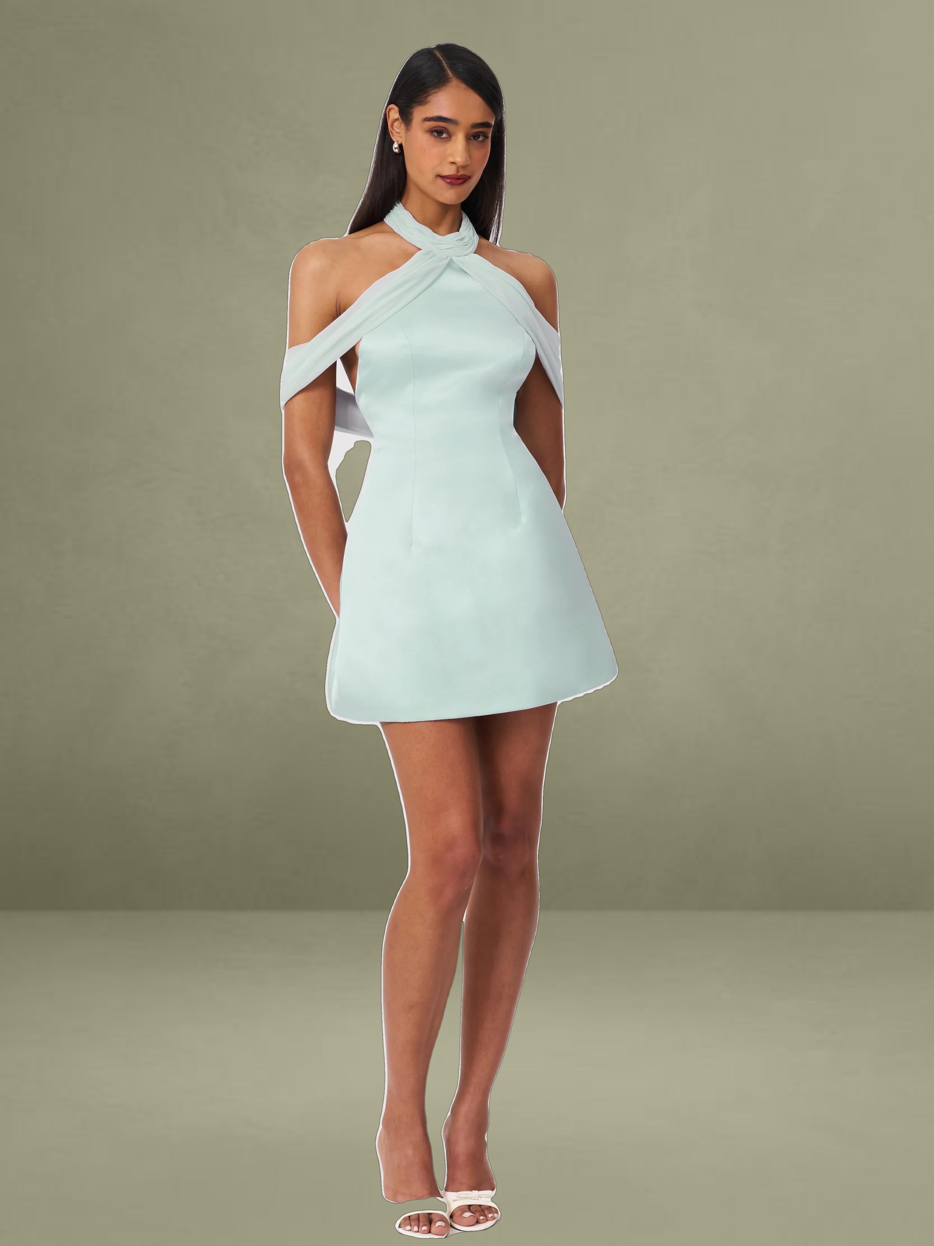 The Zafrina Dress is a business casual statement piece perfect for the office and spring gatherings. Designed in a flattering A-line silhouette, it features delicate chiffon trim that adds an ethereal touch. The off-shoulder design with ruched chiffon detailing exudes elegance, while the backless feature creates a subtle yet striking look. Thoughtfully crafted with invisible pockets and an invisible zipper, this dress is fully lined for comfort. The light cyan hue enhances its fresh and sophisticated appeal, making it ideal for both professional and chic occasions.