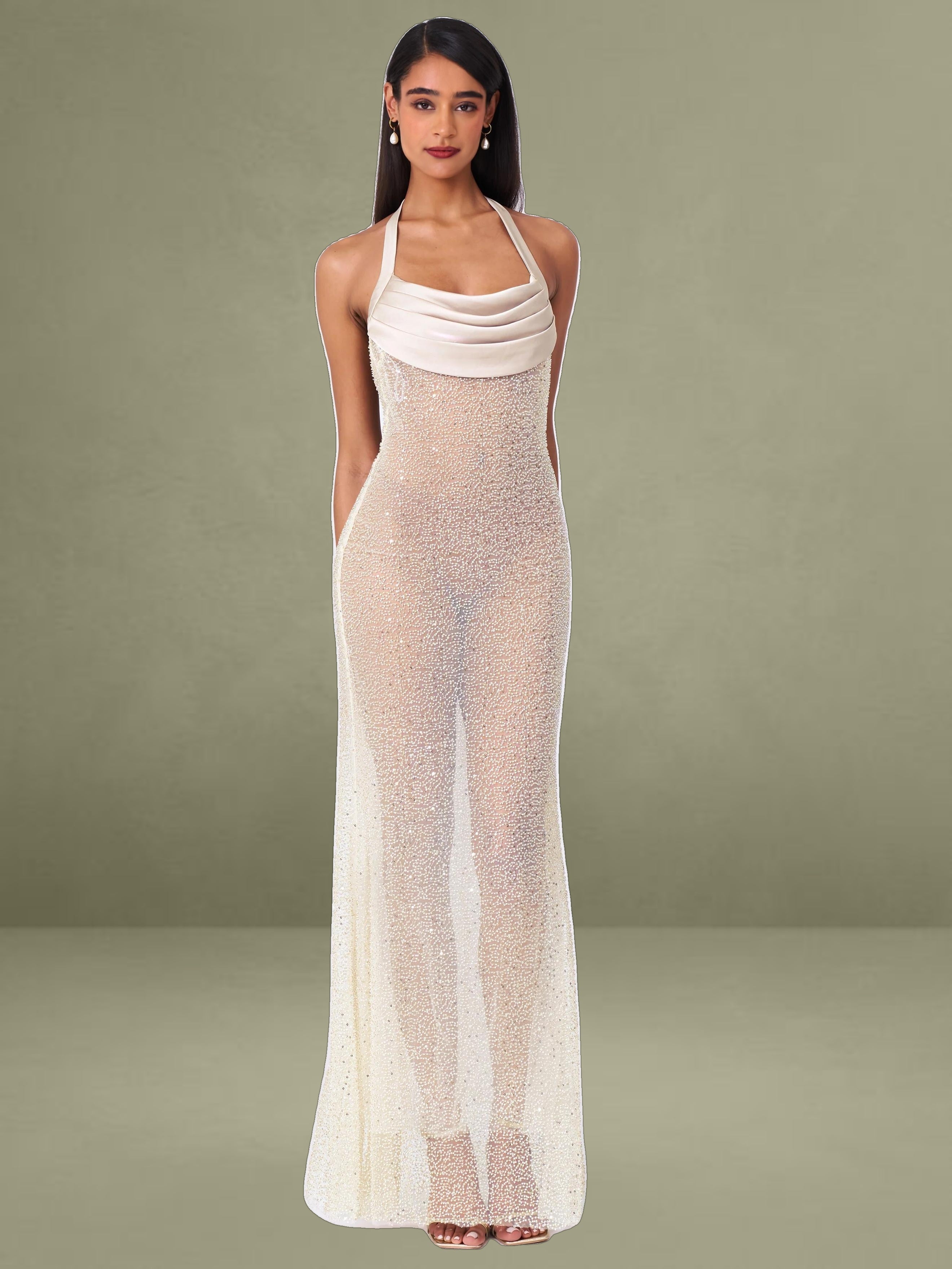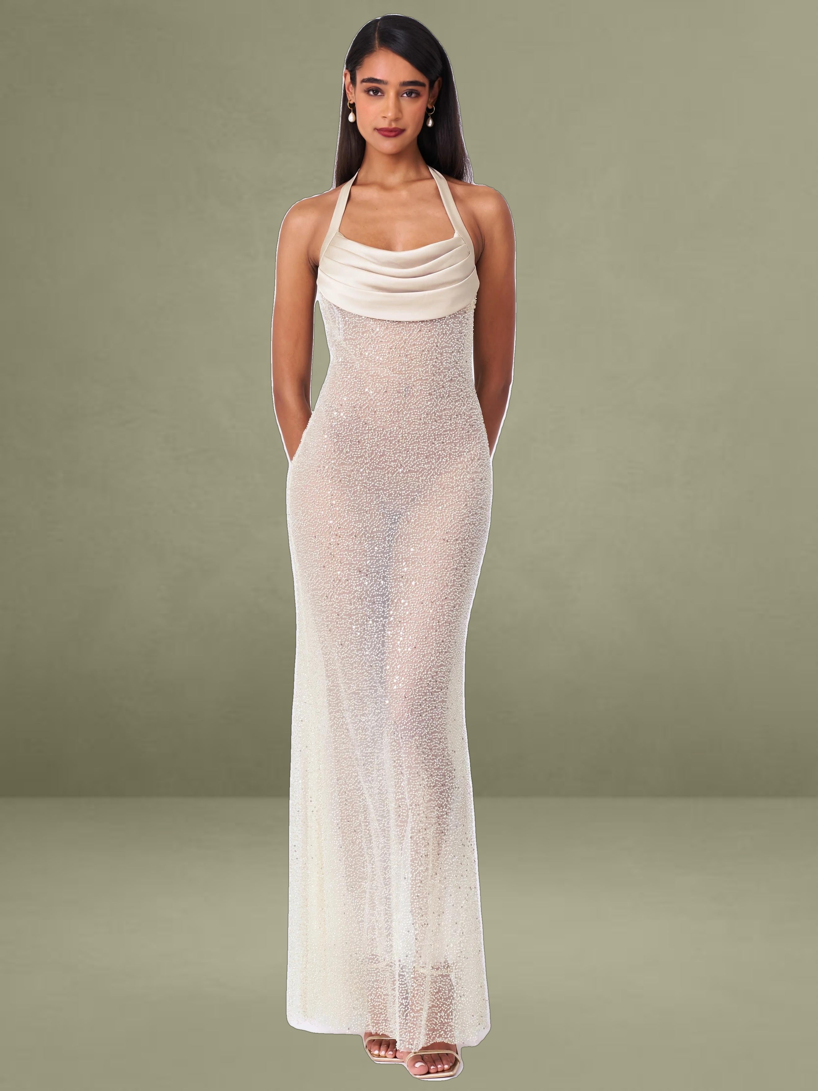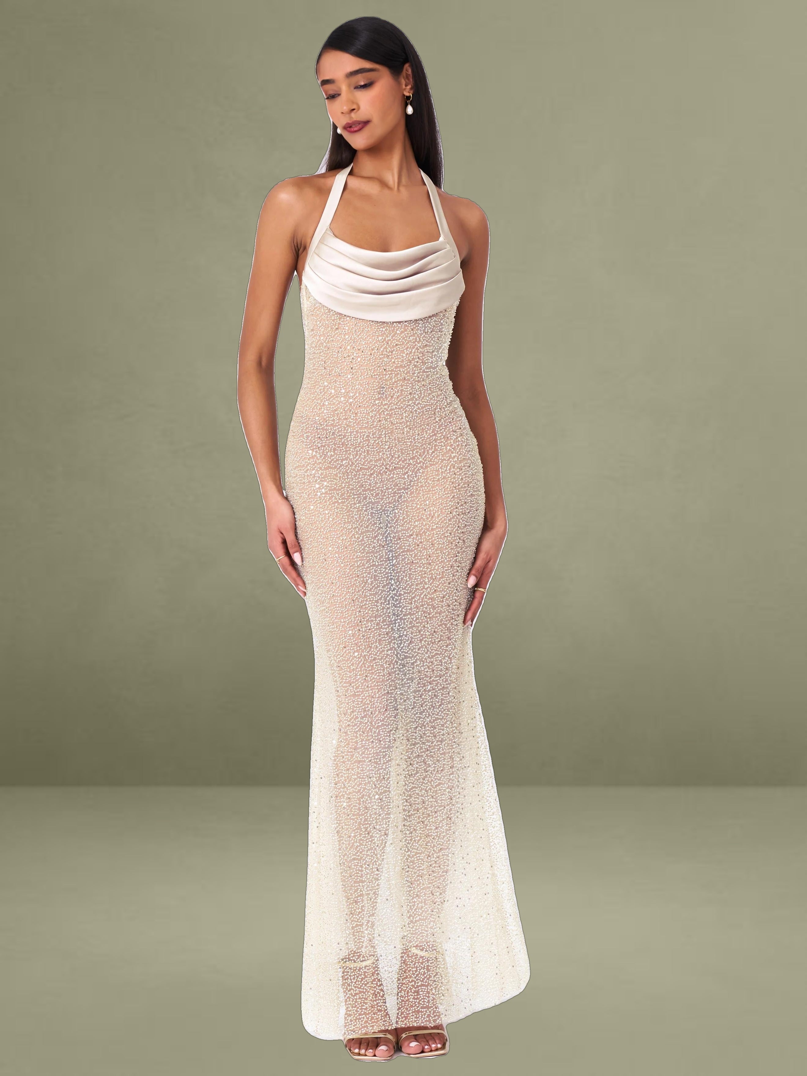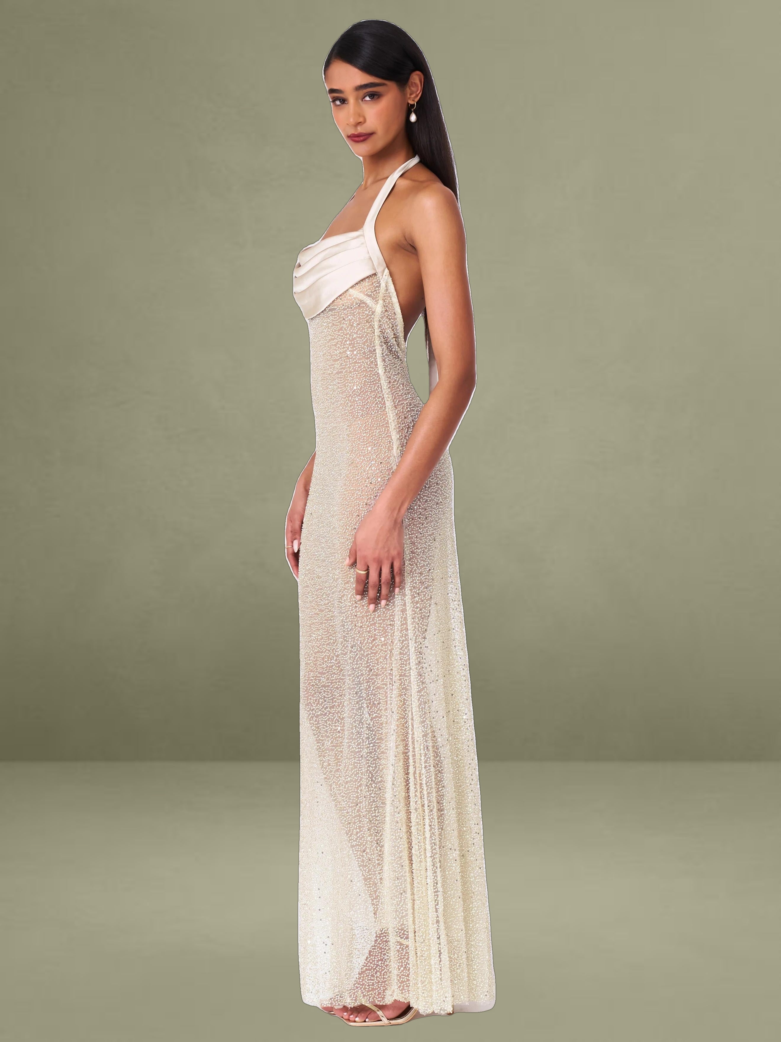 Embrace elegance with the Zahya Dress, a stunning blend of glamour and sophistication. Featuring a luxurious satin draping front collar and a chic halter neck, this dress exudes effortless charm. The backless design adds a bold, alluring touch, while the shimmering beaded mesh overlay enhances its exquisite appeal. Designed in a graceful mermaid slip shape, the dress beautifully contours the body. Fully lined for comfort and finished with an invisible zipper for a seamless look, the Zahya Dress is perfect for creating a lasting impression at any formal event.