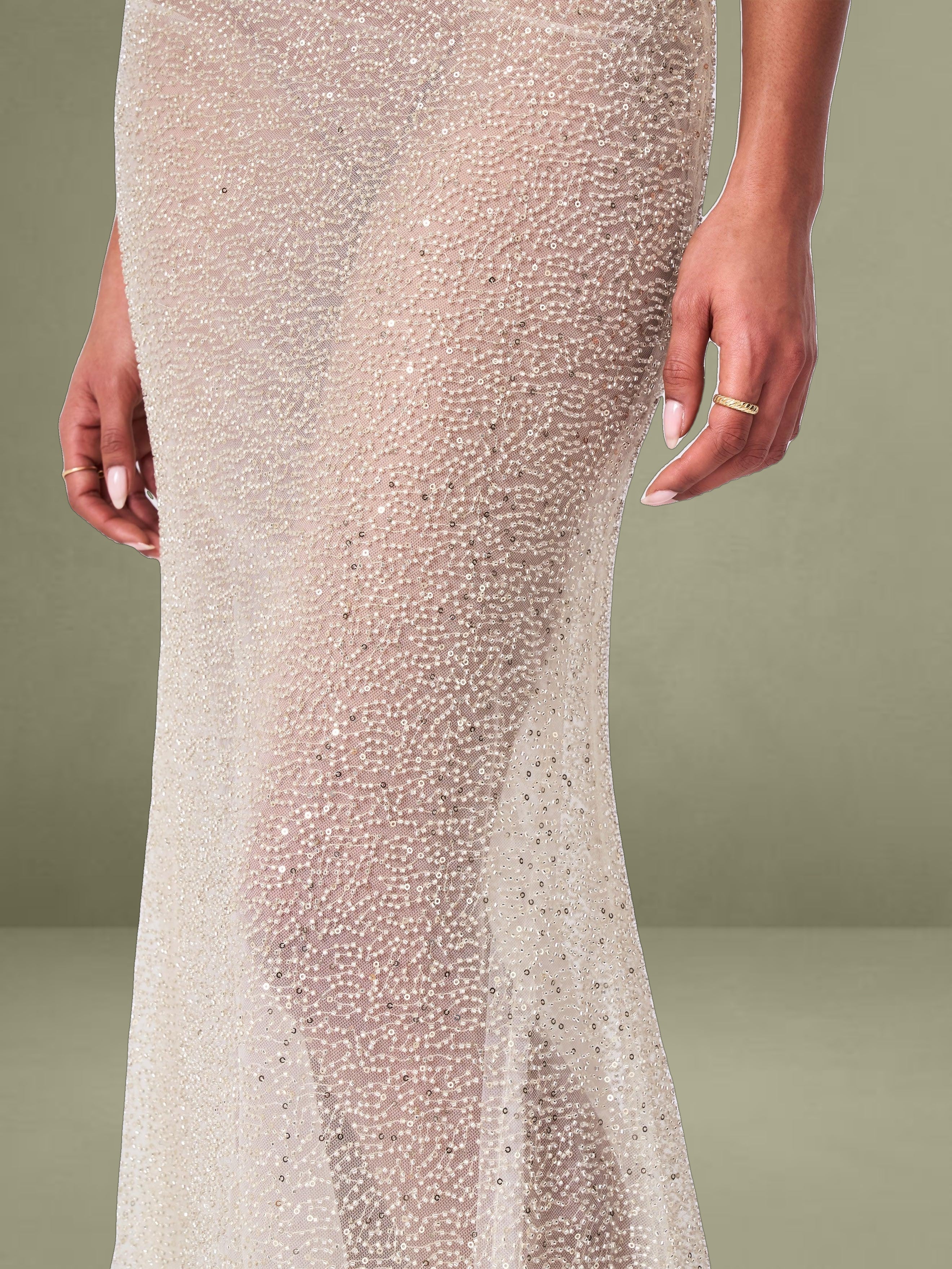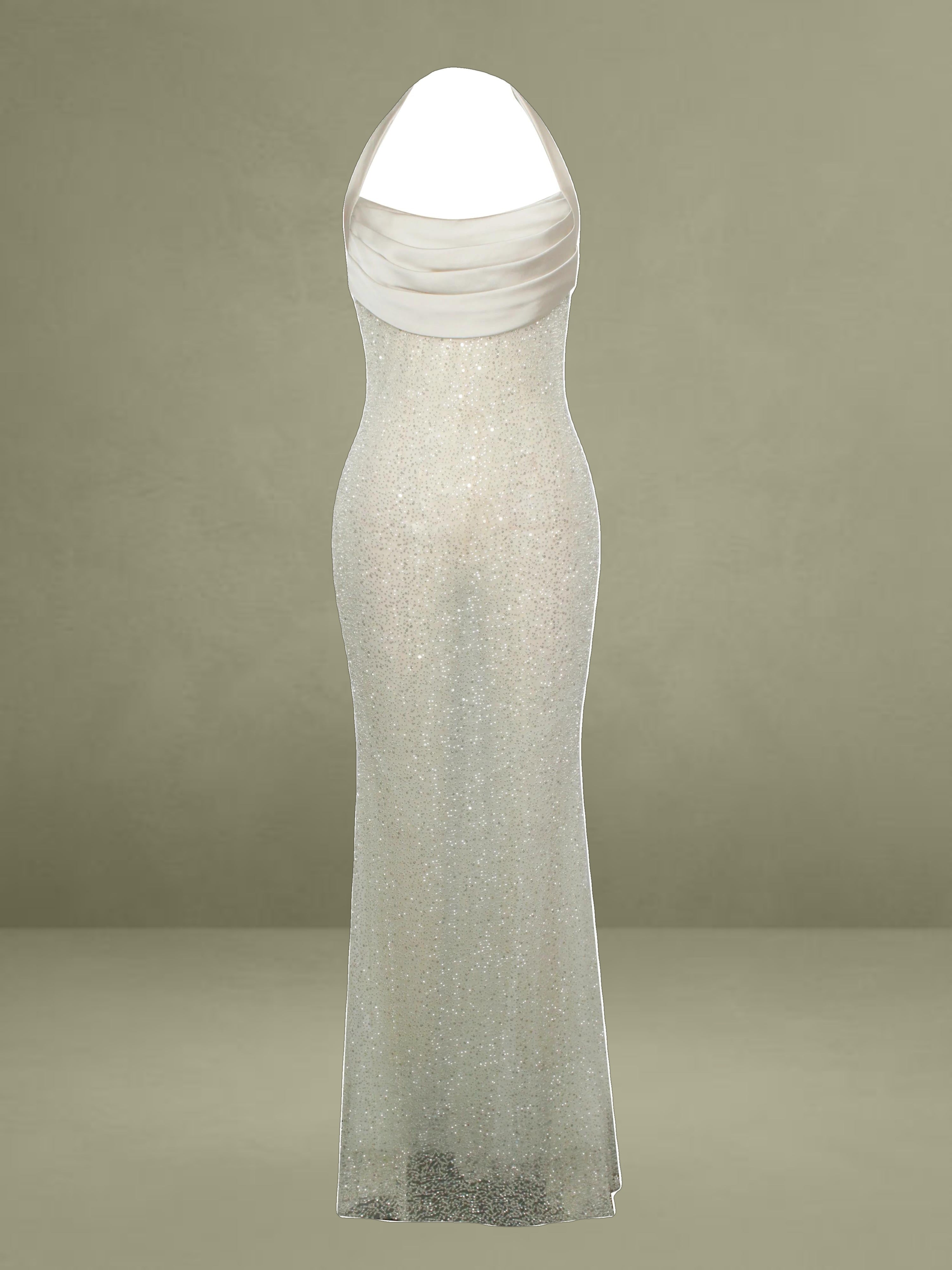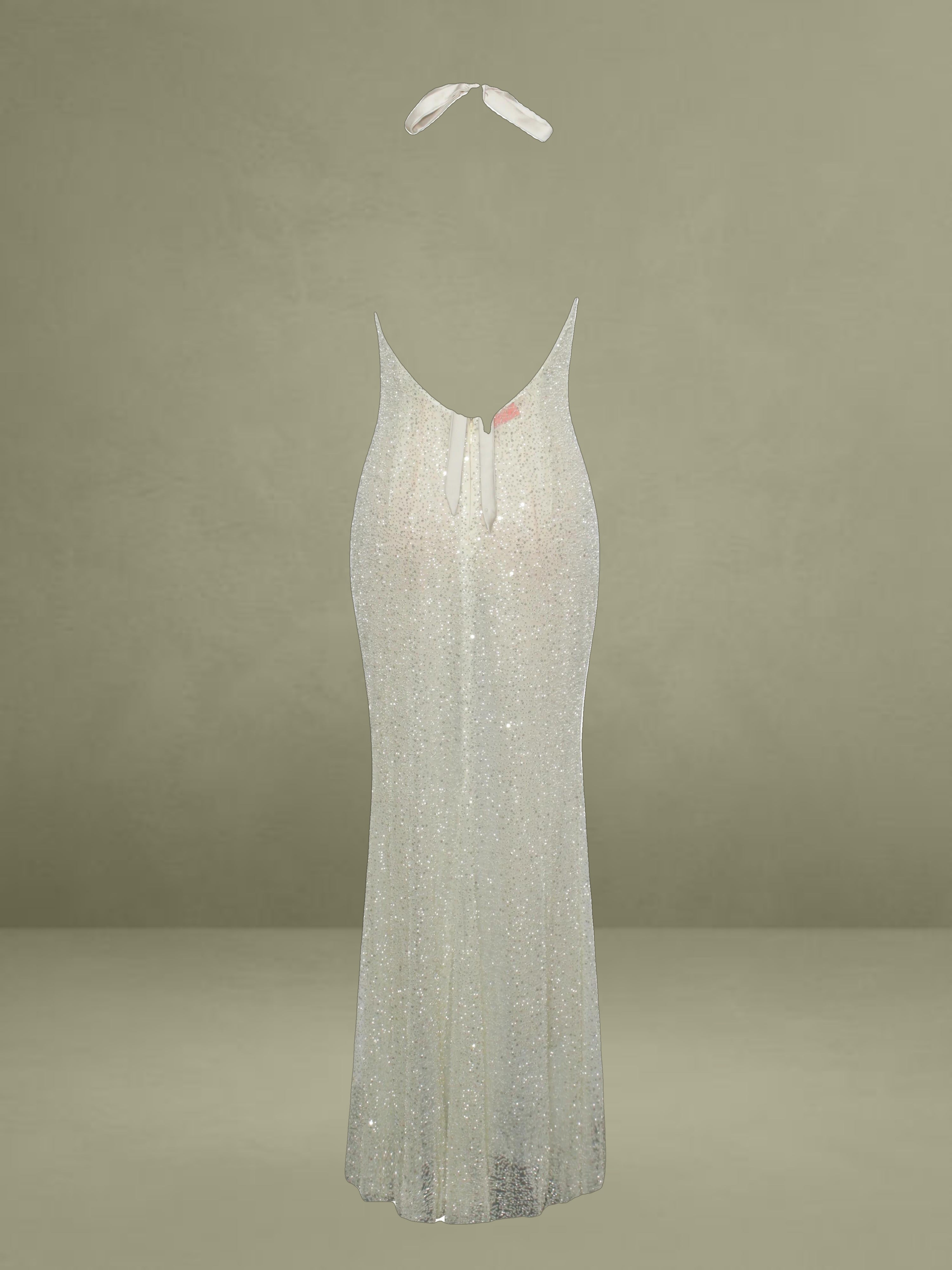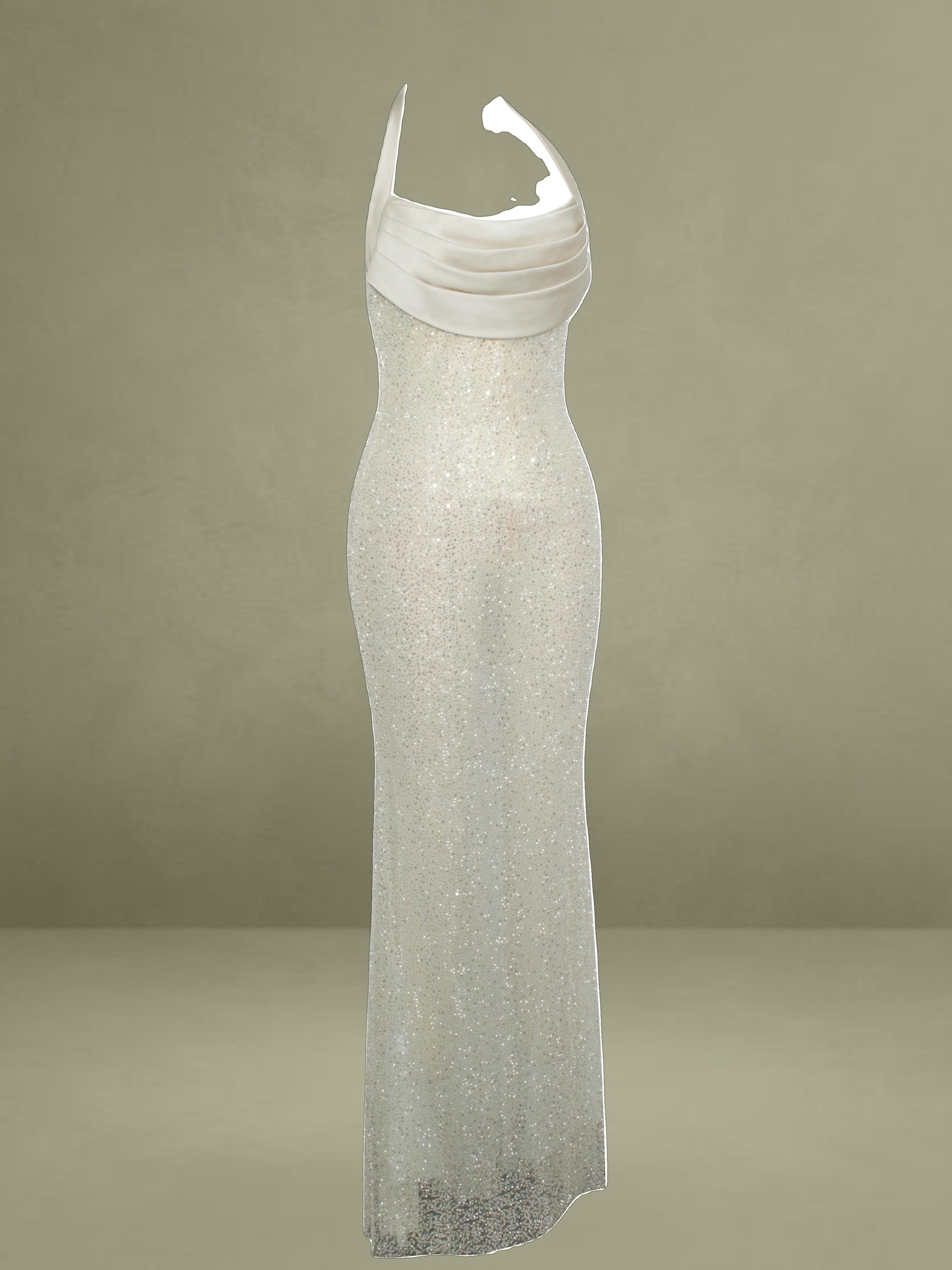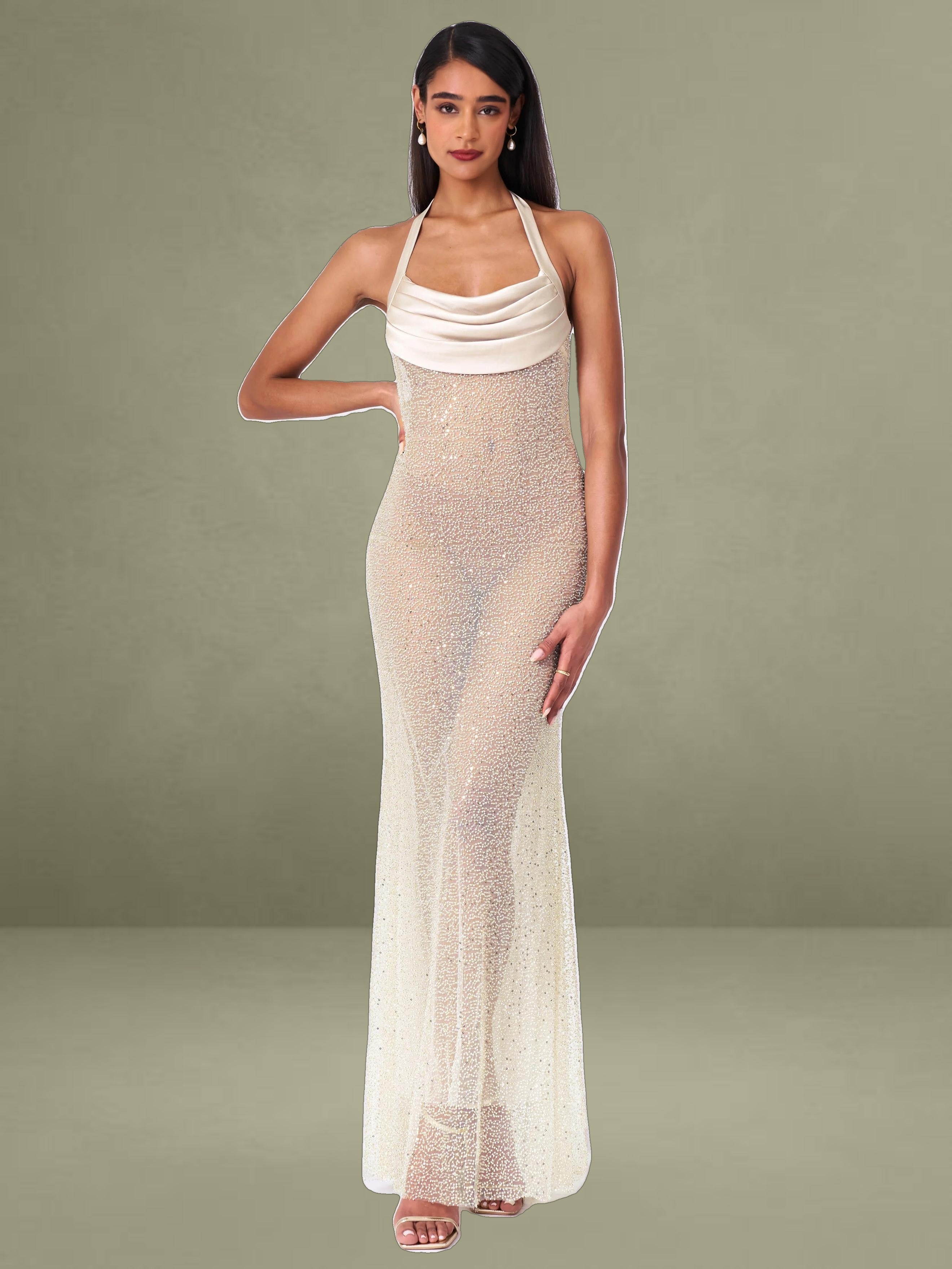 Embrace elegance with the Zahya Dress, a stunning blend of glamour and sophistication. Featuring a luxurious satin draping front collar and a chic halter neck, this dress exudes effortless charm. The backless design adds a bold, alluring touch, while the shimmering beaded mesh overlay enhances its exquisite appeal. Designed in a graceful mermaid slip shape, the dress beautifully contours the body. Fully lined for comfort and finished with an invisible zipper for a seamless look, the Zahya Dress is perfect for creating a lasting impression at any formal event.