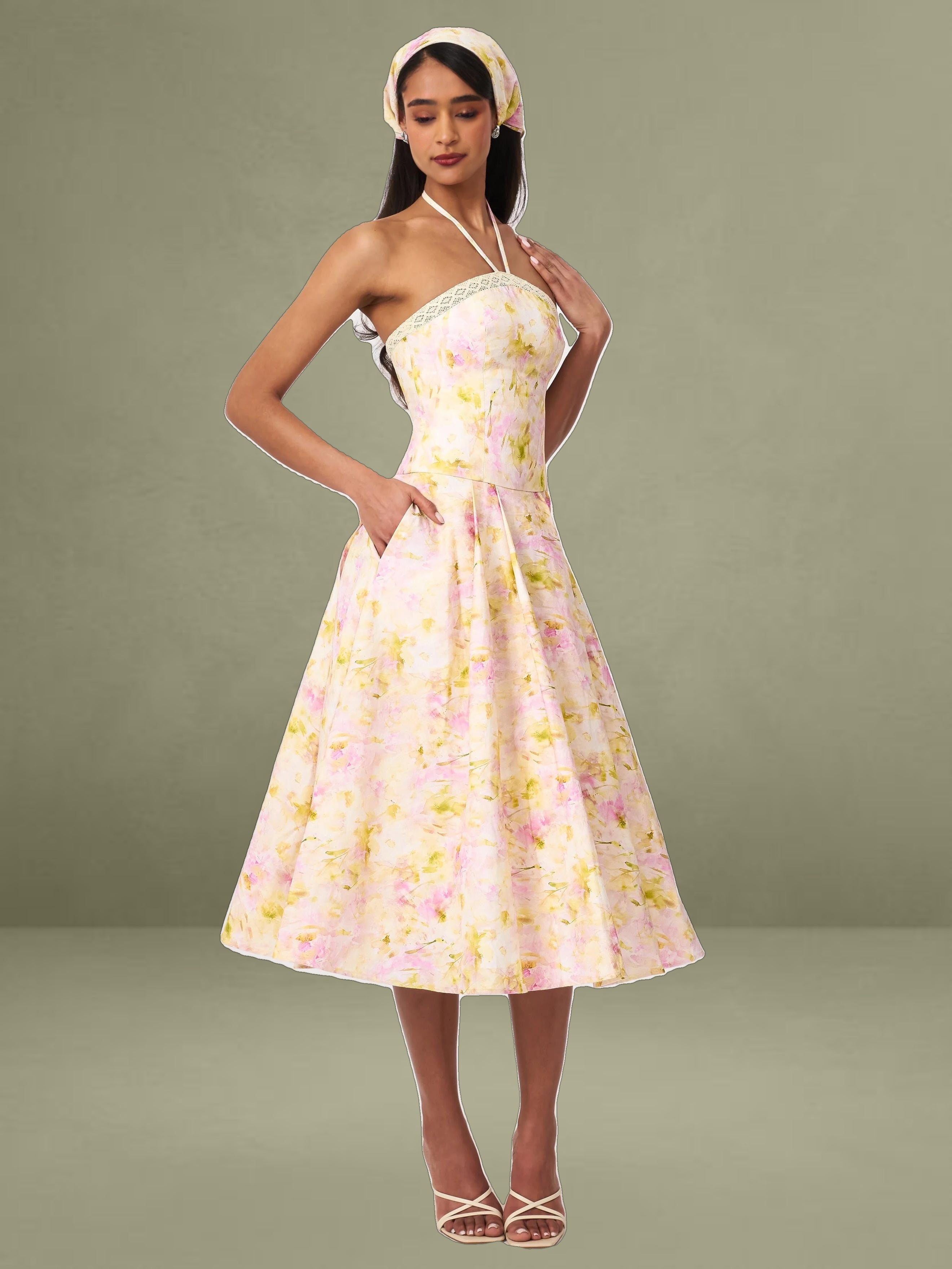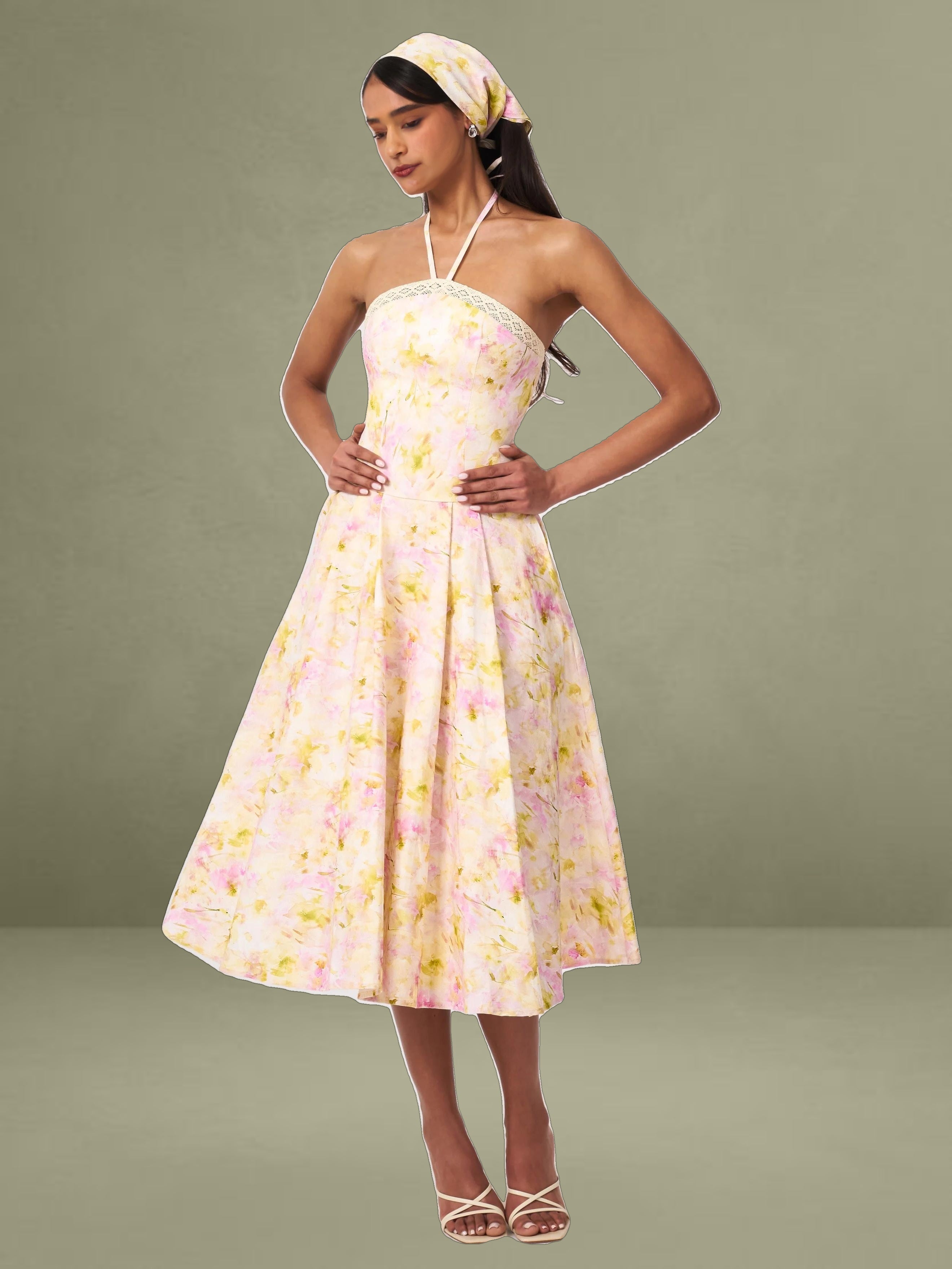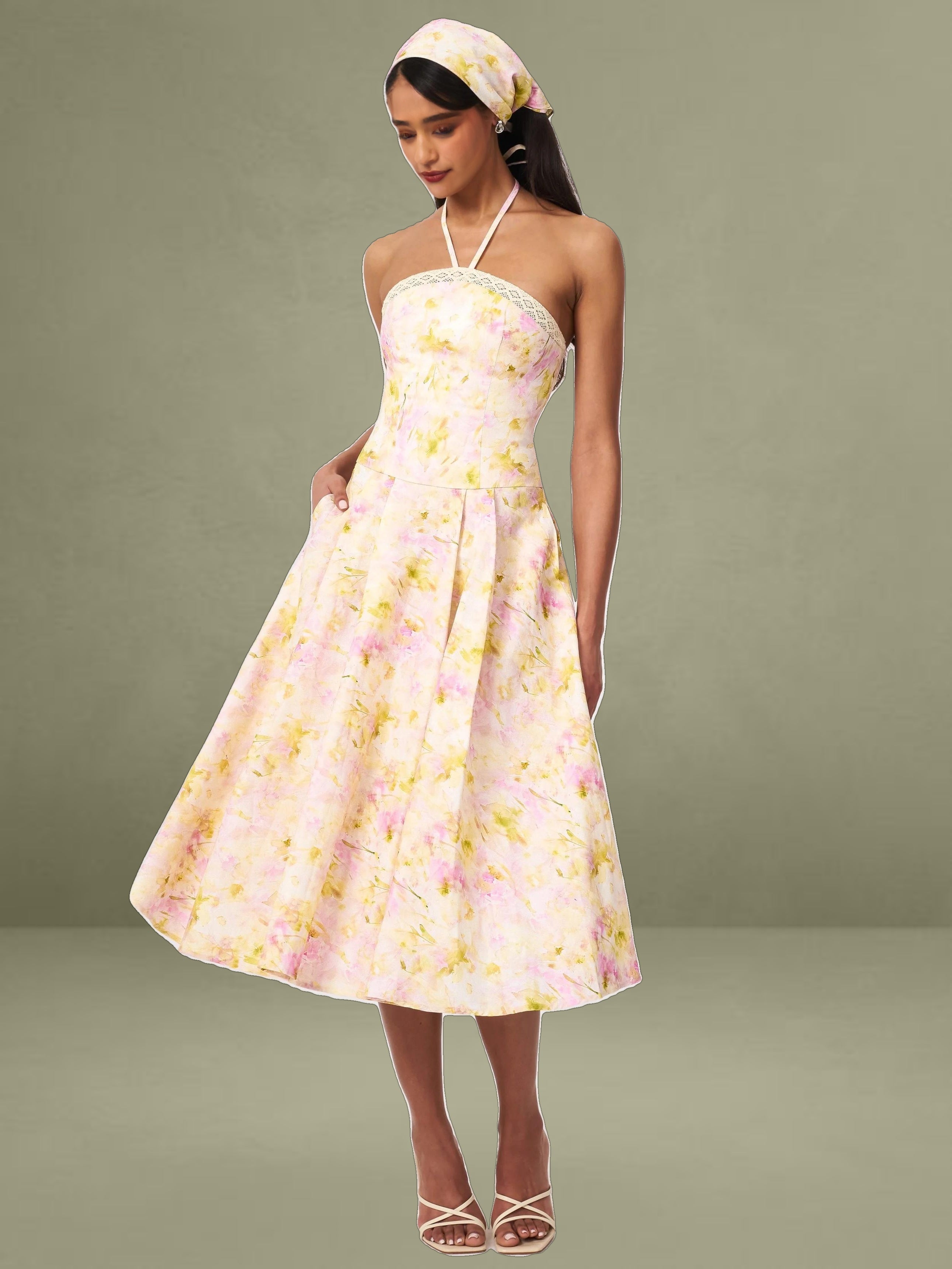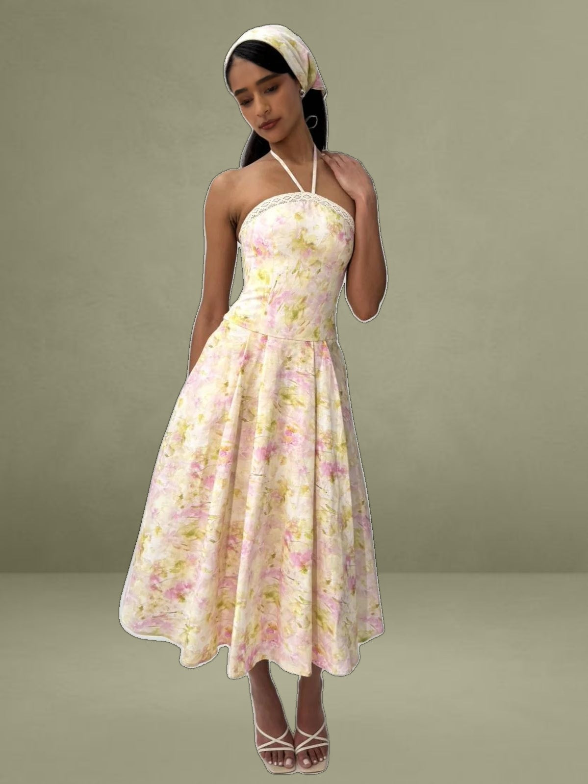 The Zaina Dress is the perfect blend of spring charm and effortless elegance, ideal for picnics, vacations, holidays, and casual outings. Made from breathable linen fabric, it showcases a yellow and pink floral print that radiates freshness and femininity. The halter neckline adds a touch of sophistication, while the delicate lace trim enhances its romantic appeal. Designed with a drop waist and a pleated skirt, this dress creates a graceful silhouette with beautiful movement. Thoughtfully crafted with invisible pockets, a fully lined interior, and an invisible zipper, the Zaina Dress is both stylish and practical—your go-to for breezy, sun-kissed days. Perfectly matches with our Pink Floral Print Head Scarf.