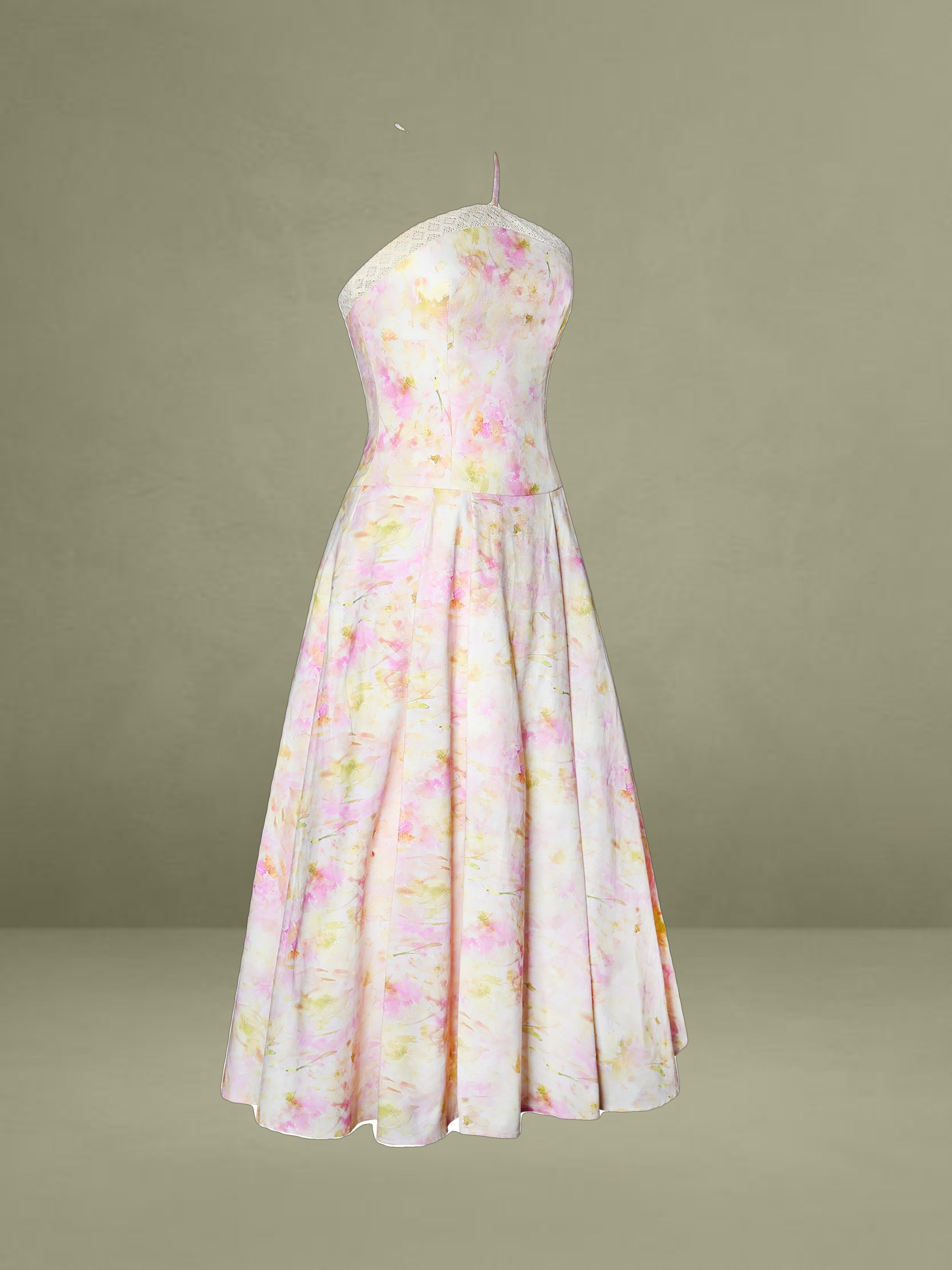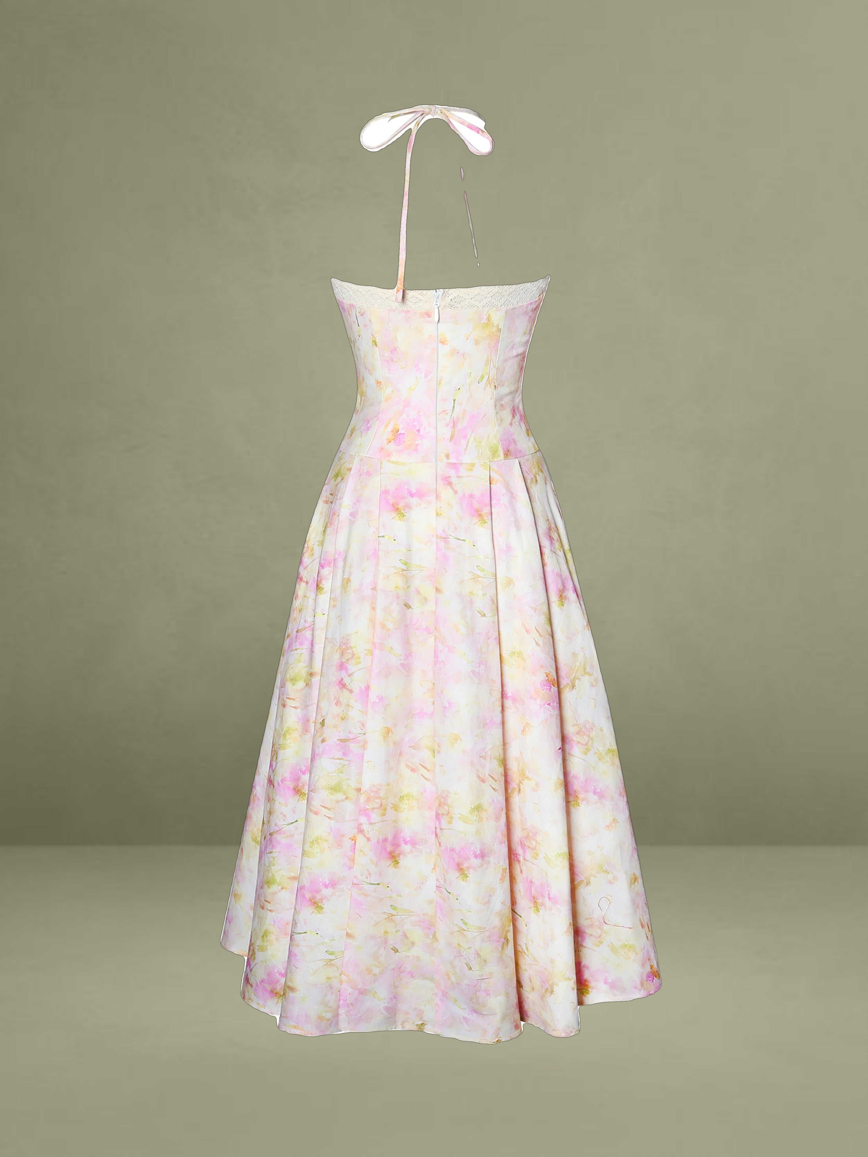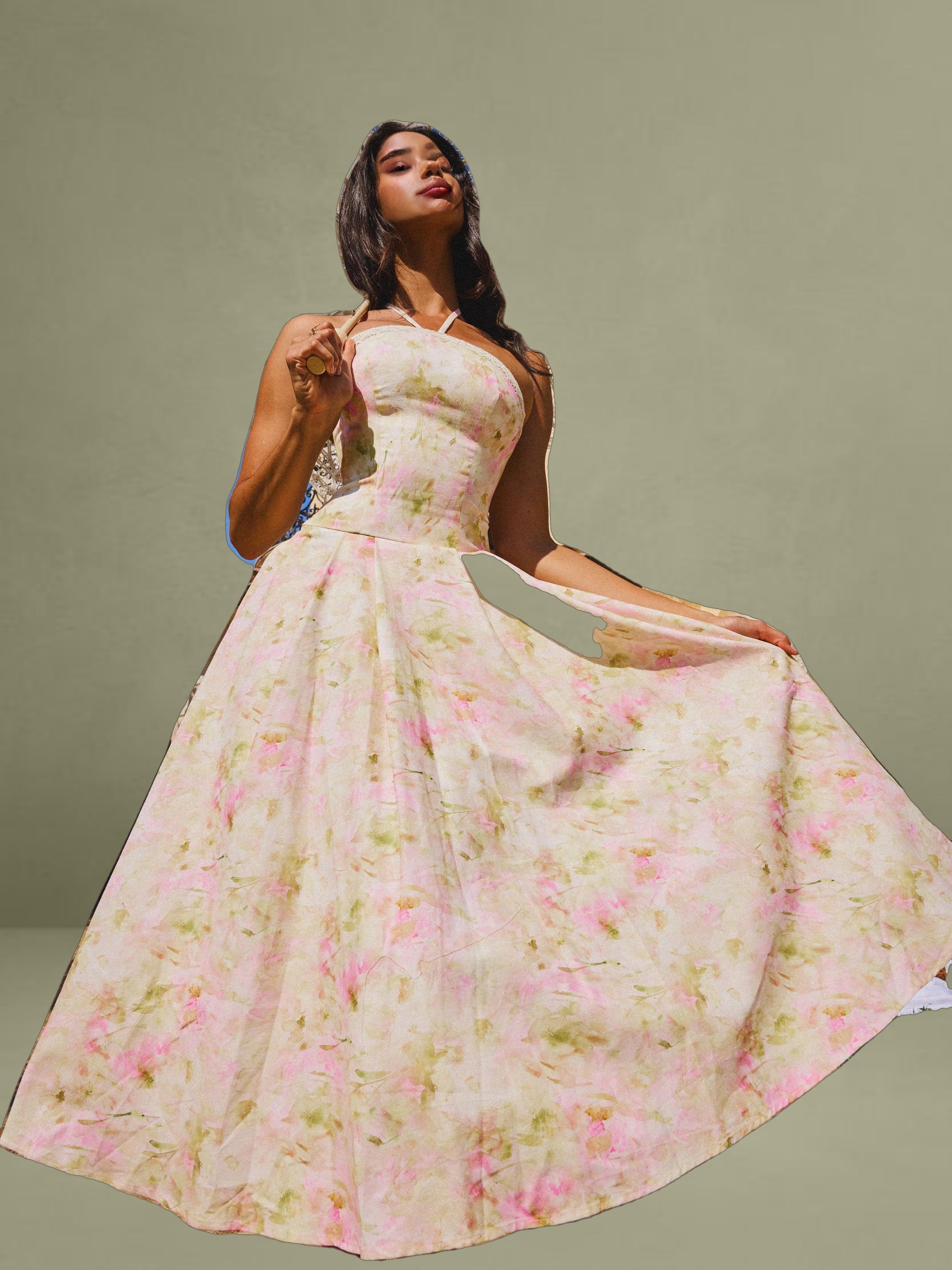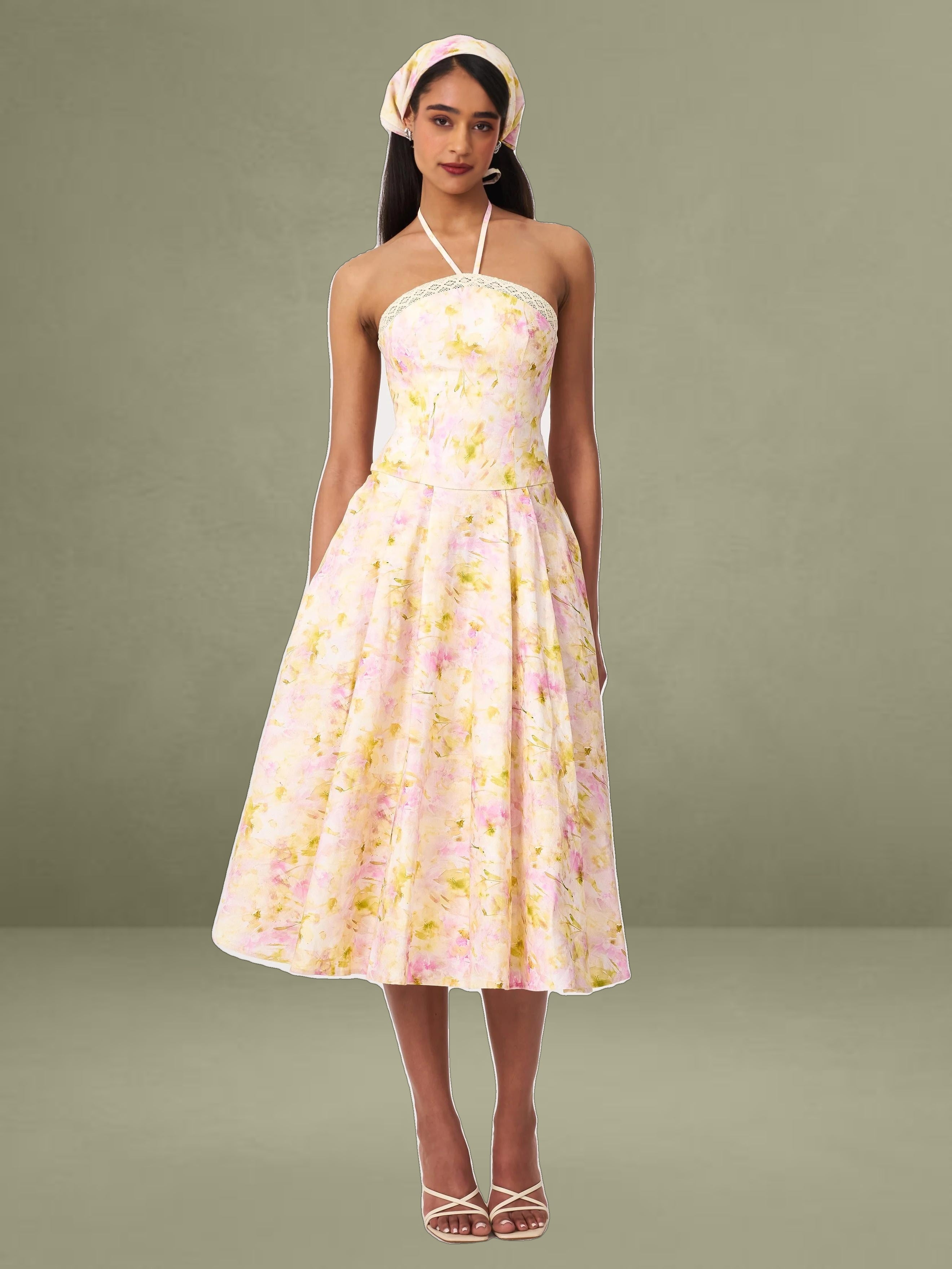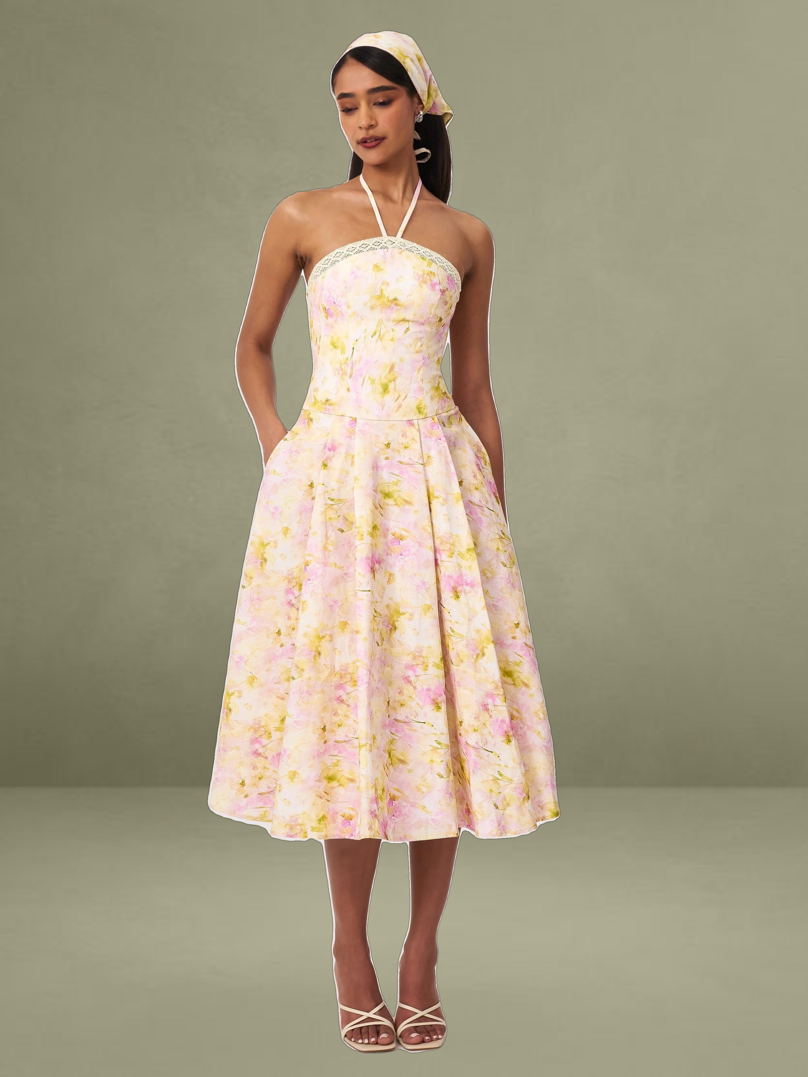The Zaina Dress is the perfect blend of spring charm and effortless elegance, ideal for picnics, vacations, holidays, and casual outings. Made from breathable linen fabric, it showcases a yellow and pink floral print that radiates freshness and femininity. The halter neckline adds a touch of sophistication, while the delicate lace trim enhances its romantic appeal. Designed with a drop waist and a pleated skirt, this dress creates a graceful silhouette with beautiful movement. Thoughtfully crafted with invisible pockets, a fully lined interior, and an invisible zipper, the Zaina Dress is both stylish and practical—your go-to for breezy, sun-kissed days. Perfectly matches with our Pink Floral Print Head Scarf.