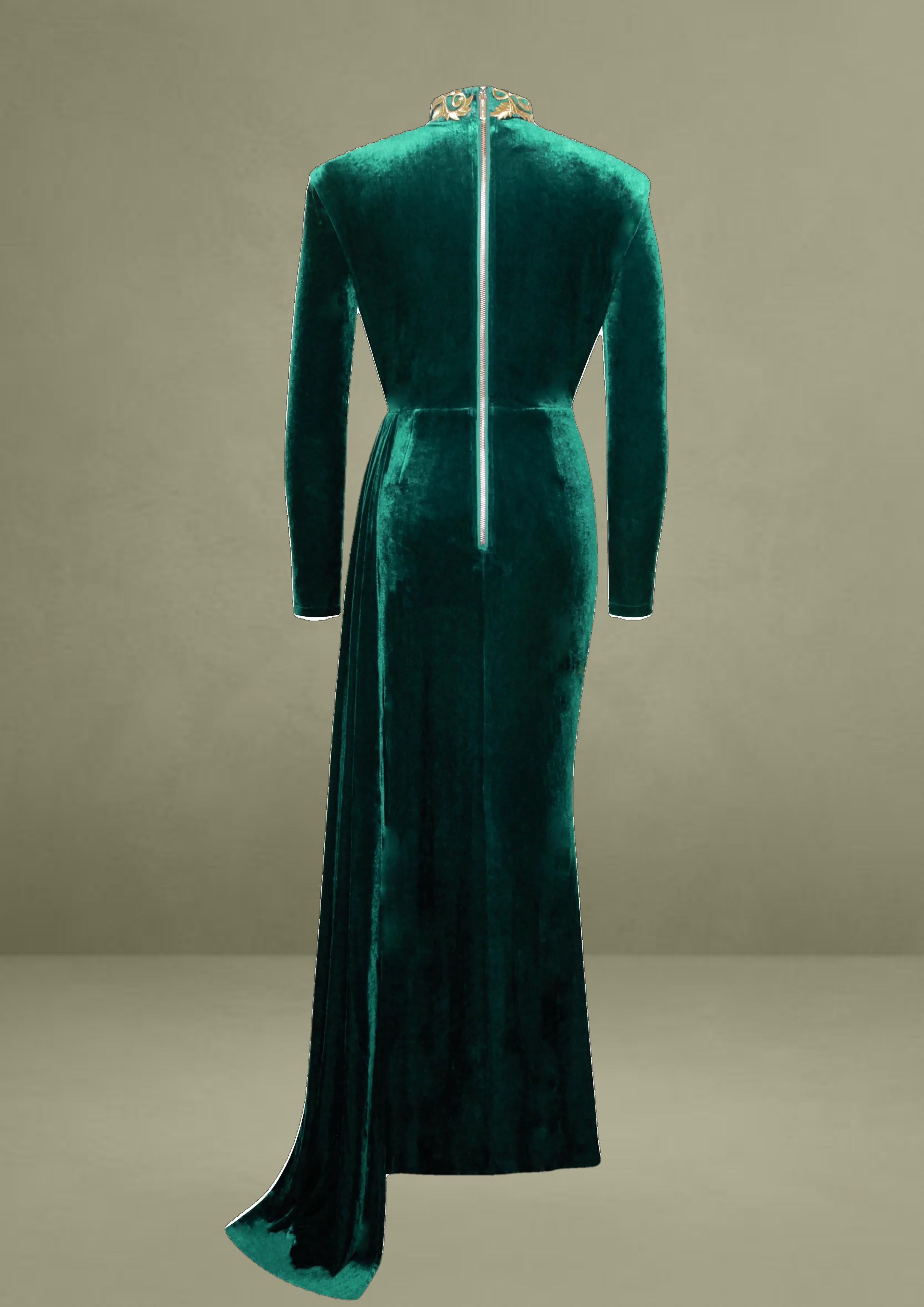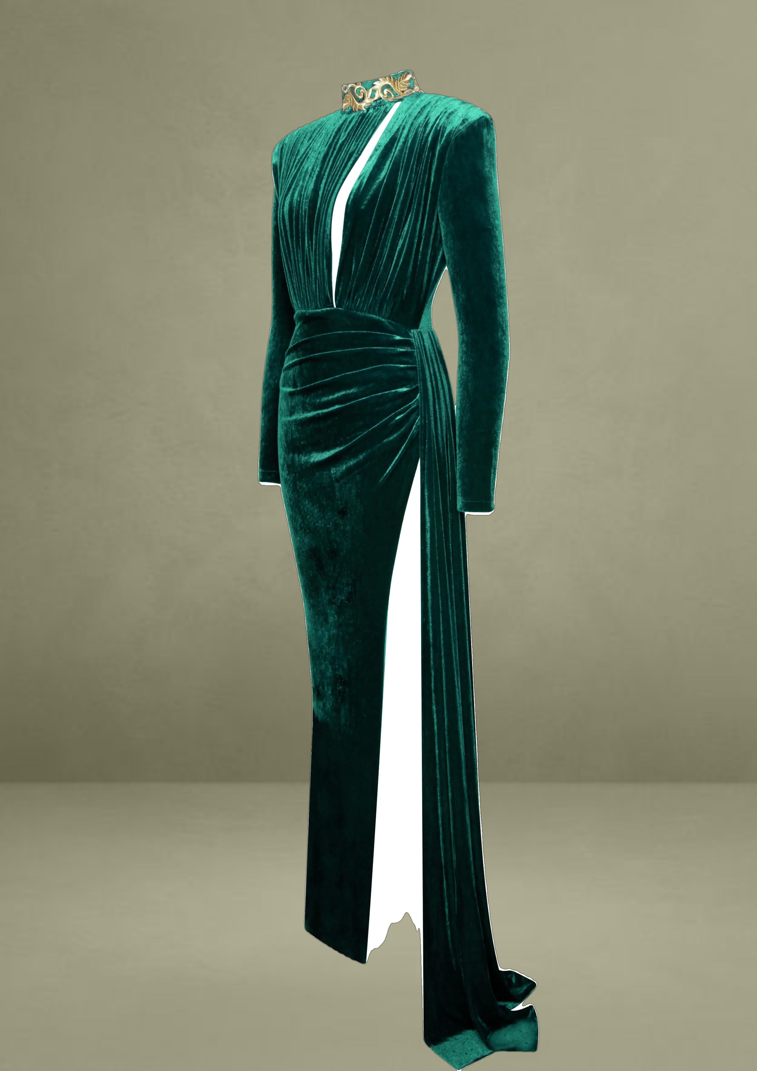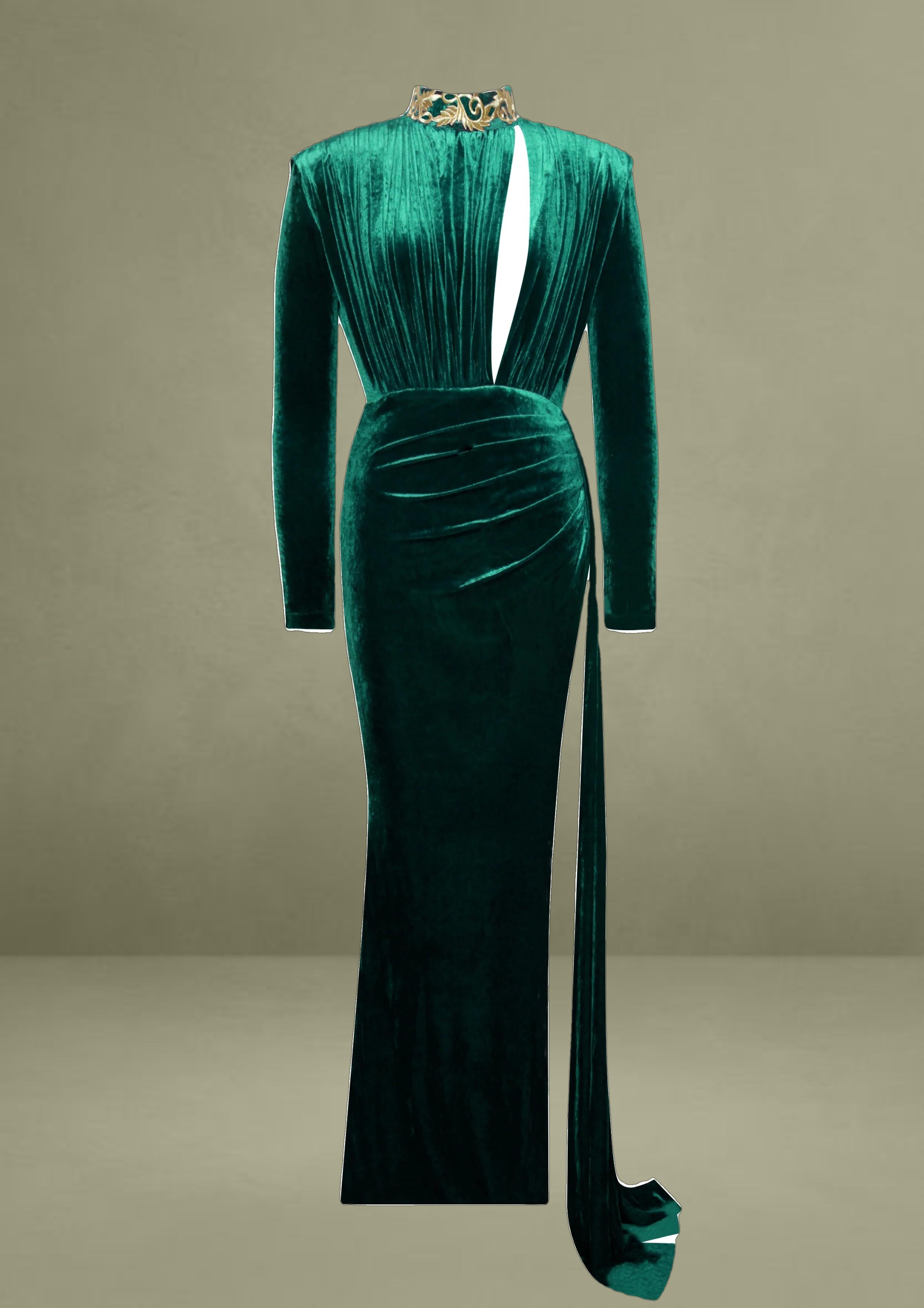 Glam it up and turn those heads! With an asymmetrical plunging teardrop cutout at the chest with ruching details and shoulder pads adorned with gold accents, this exquisite gown is perfect for any special occasion. Show off in luxurious stretch velvet fabric, with its high slit and draping on the side that gives off an amazing silhouette. With an exposed gold engraved zipper located at the center back, you will shine in any one of the available colors: black, gold, or burgundy.
